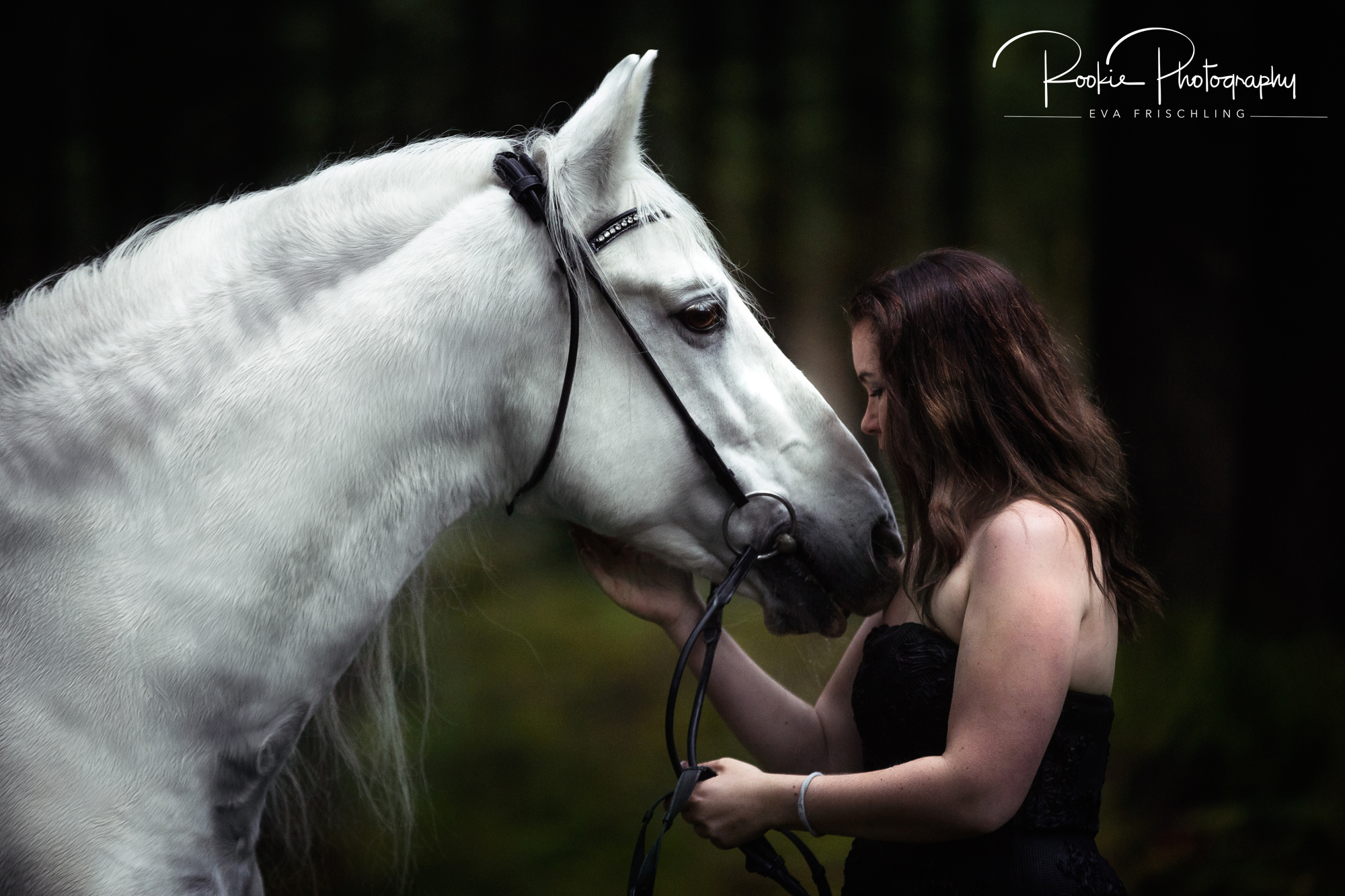 Sie durfte, bis die beiden Models fertig waren, zuerst mit dem Schimmelhengst im Wald, und dann, nachdem wir die Bilder mit den Models im Kasten hatten, mit Wolfi vor dem „Gebüsch“ posieren.