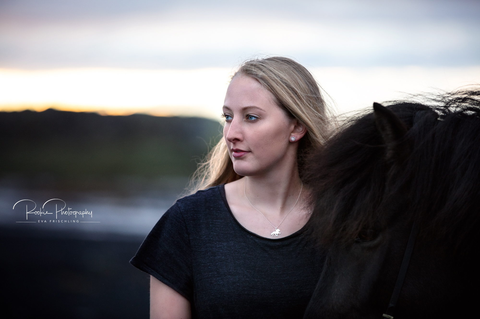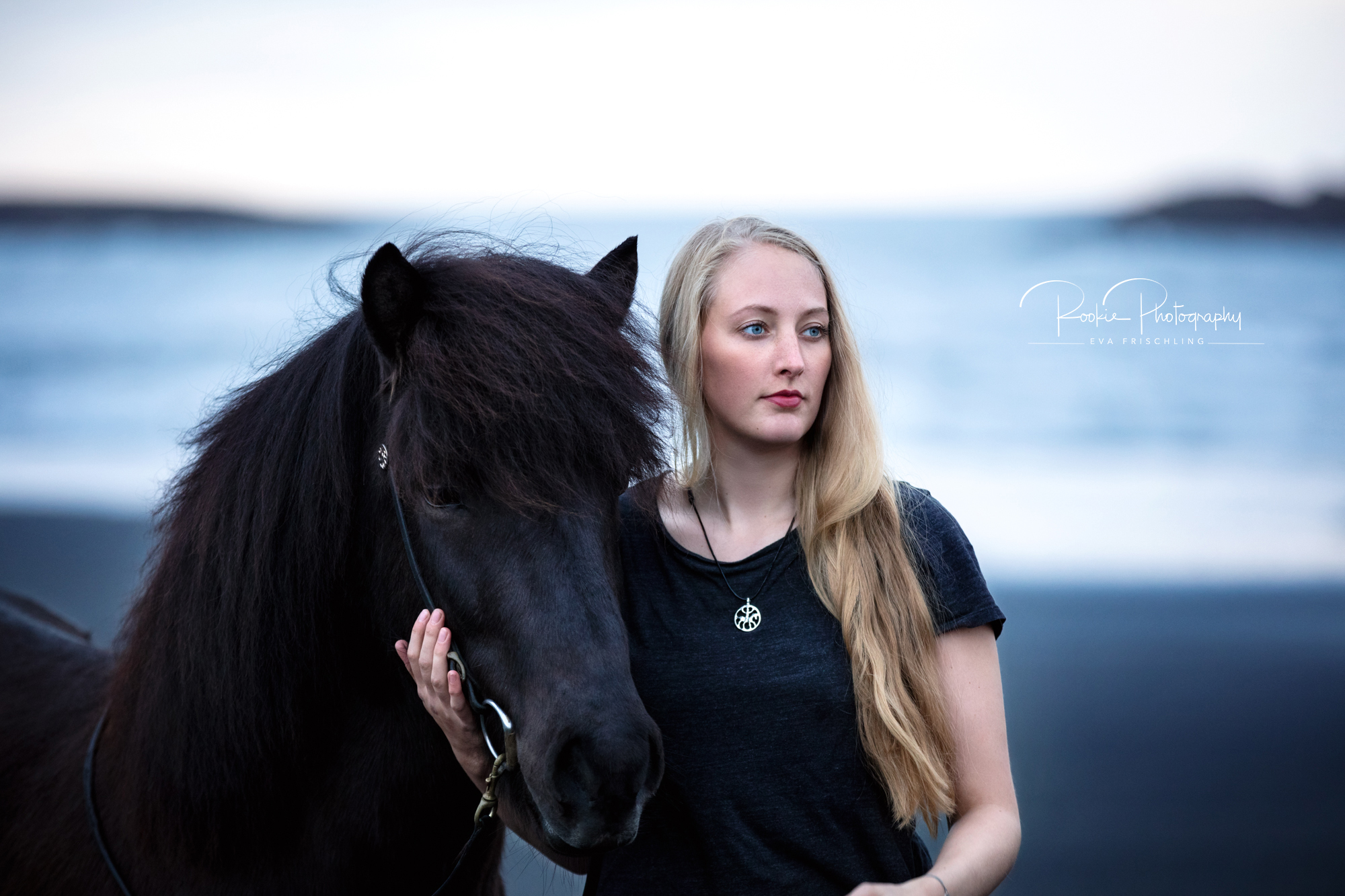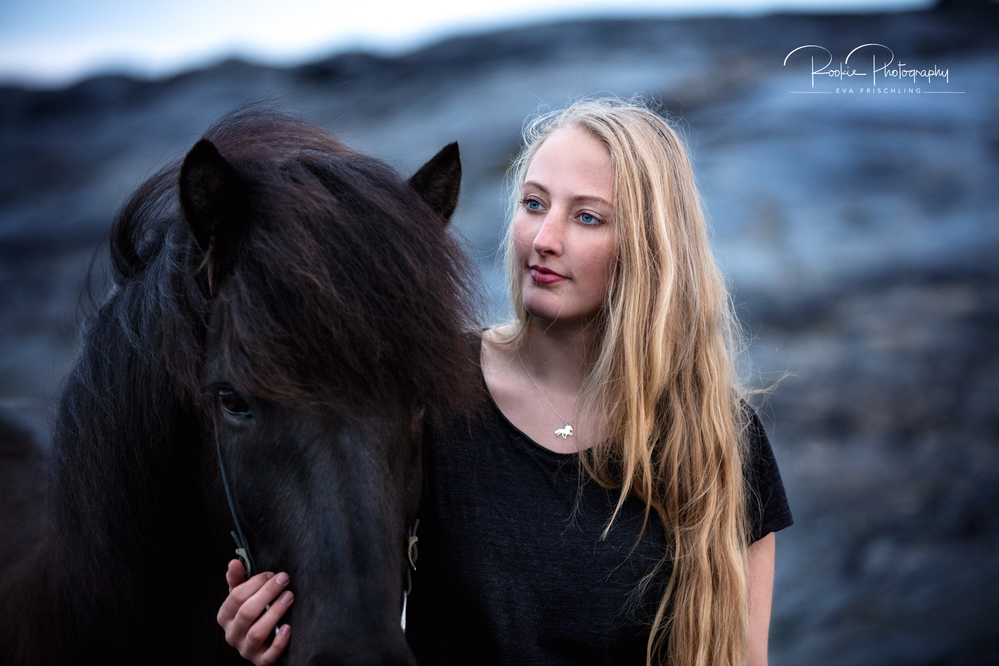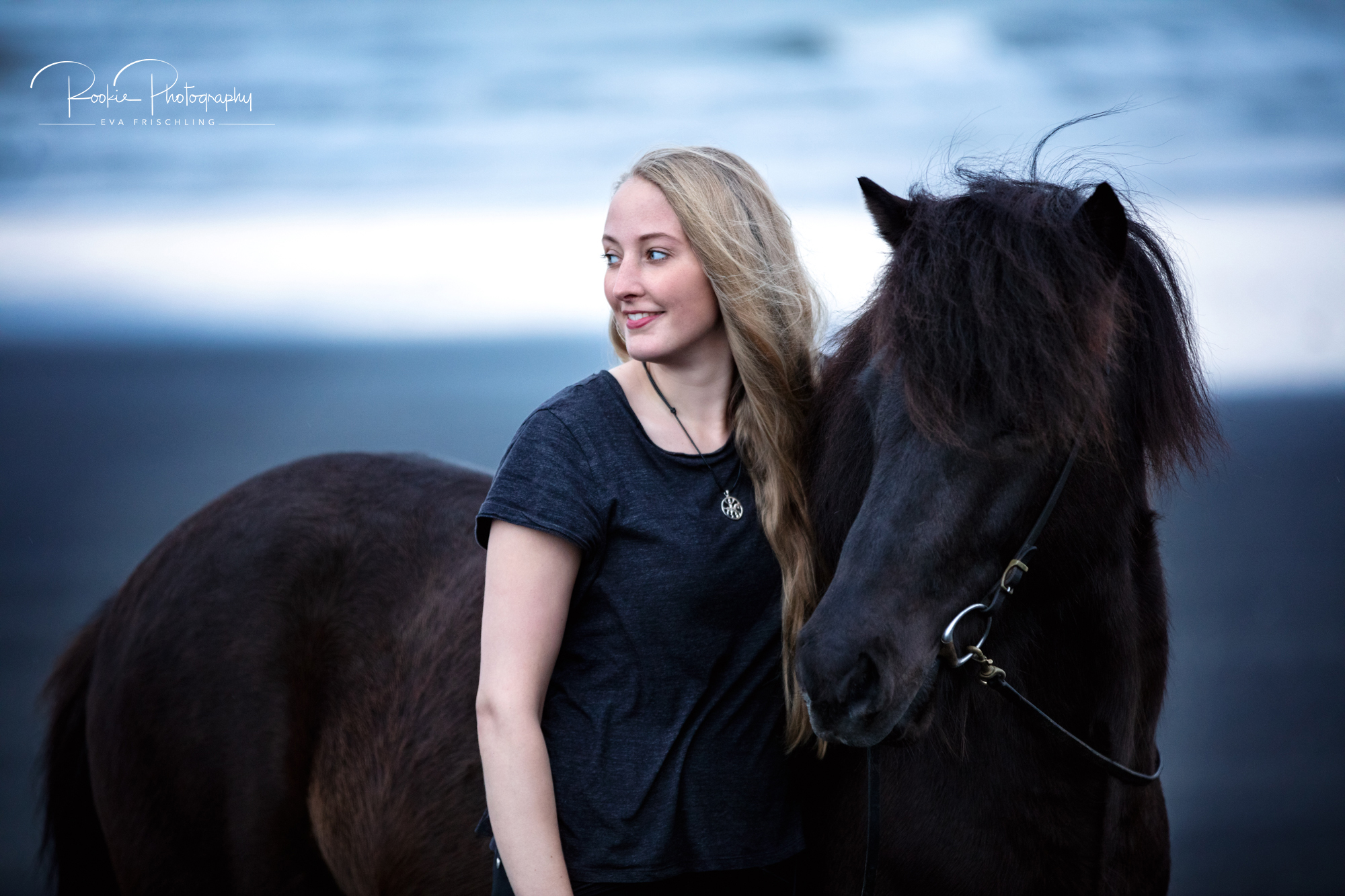 Die Shootings wurden in zwei Teile aufgeteilt: an einem Abend war ich mit Jasmina und dem wunderschönen Rappen Steinálfur frá Horni I bei einer einzigartigen Location mit schwarzem Strand, schwarzen Steinen, und dem Meer. Am darauf folgenden Tag gingen wir dann noch für die letzten Bilder in die nahe stehende Pferdeherde.