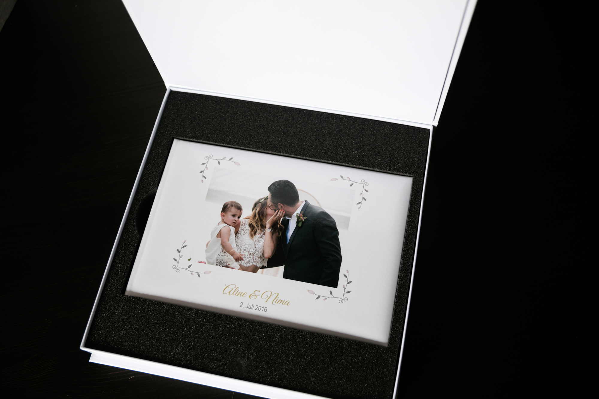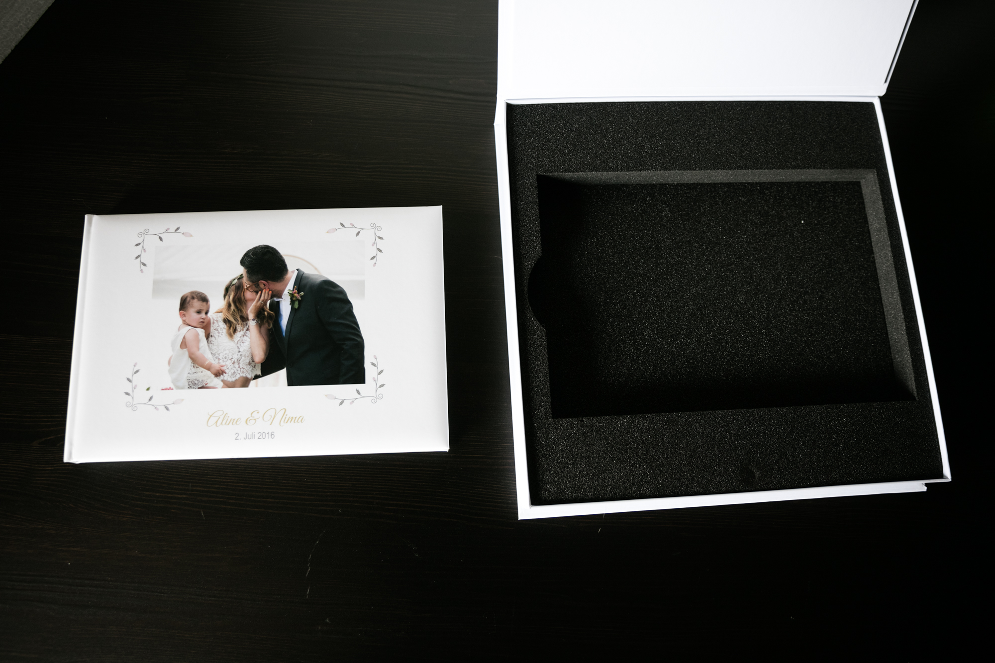 Das Fotobuch in der Geschenkverpackung. Diese gibt es in Weiß und Schwarz – und jeweils für das bestimmte Produkt perfekt angepasst.
