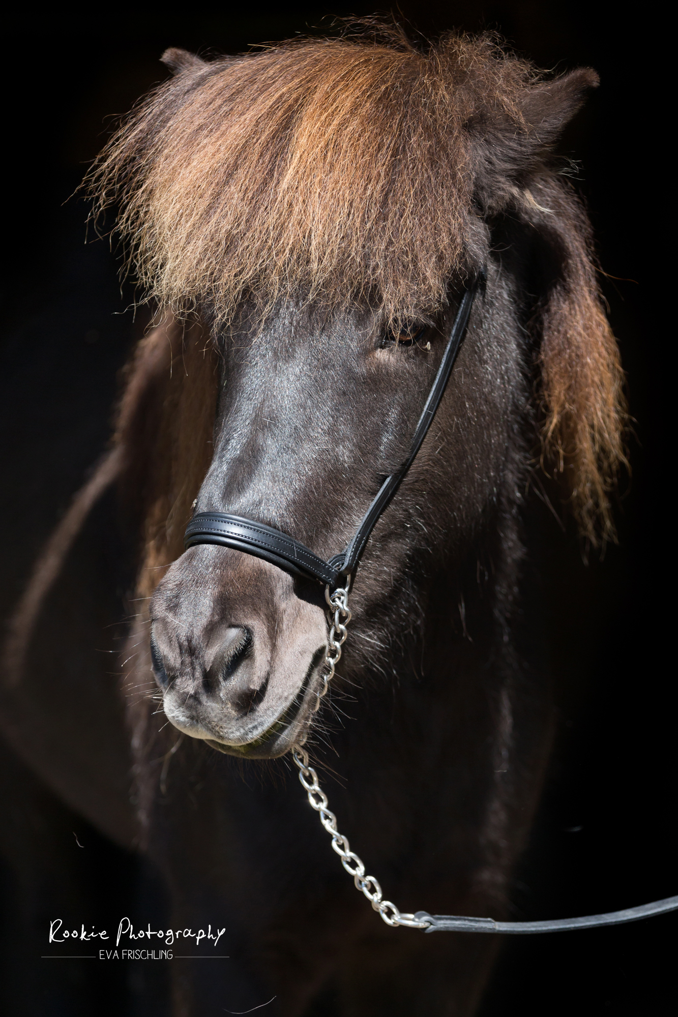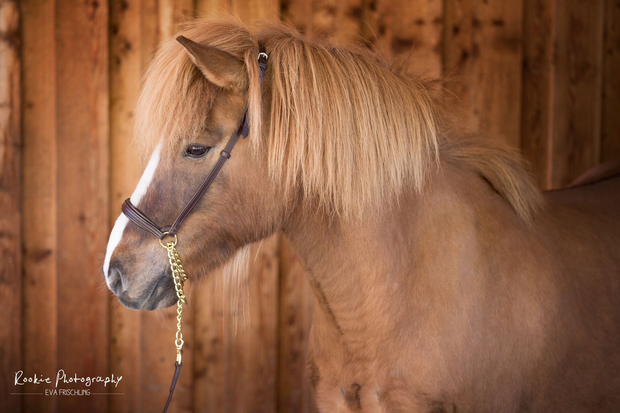 Diese Pferde wurden zur Erläuterung der Belichtungskorrektur und natürlich auch zu den richtigen Einstellungen bei der Portraitfotografie fotografiert. Und zwar haben wir die helle Stute vor einem fast weißen Hintergrund fotografiert, den Fuchsen vor einer braunen Holzwand und den Rappen in einer Stallgasse, um einen schwarzen Hintergrund zu bekommen. Da ich entweder mit erklären, helfen oder Pferd halten beschäftigt war, gibt es nur von jedem Pferd ein Bild – wobei ich bei dem Rappen (Vafi) insgesamt nur 5 Einstellungsbilder gemacht habe – und dadurch kein einziges mit Ohren-vorne hab. Aber ich möchte euch trotzdem die verschiedenen Bilder zeigen: