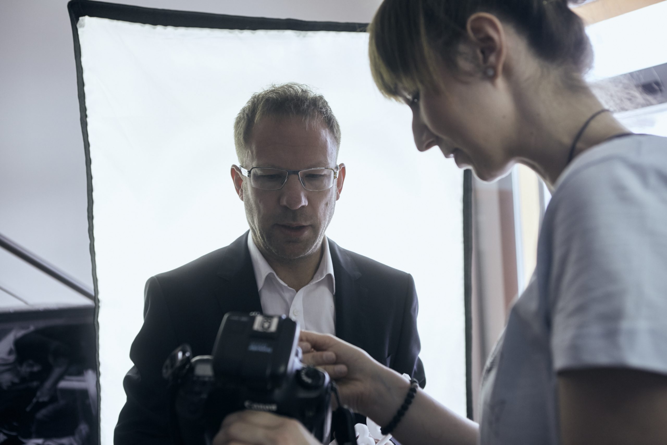 Wir überlegten lange, was wir machen sollten, ob wir nur eine Firma in das Foto mit einbeziehen sollten, oder mehrere, und entschieden uns schlussendlich auf ein ganz einfach gestaltetes Bild, in dem Herr Wagner im Vordergrund steht, und in seinen Händen die zwei Firmen „trägt“.