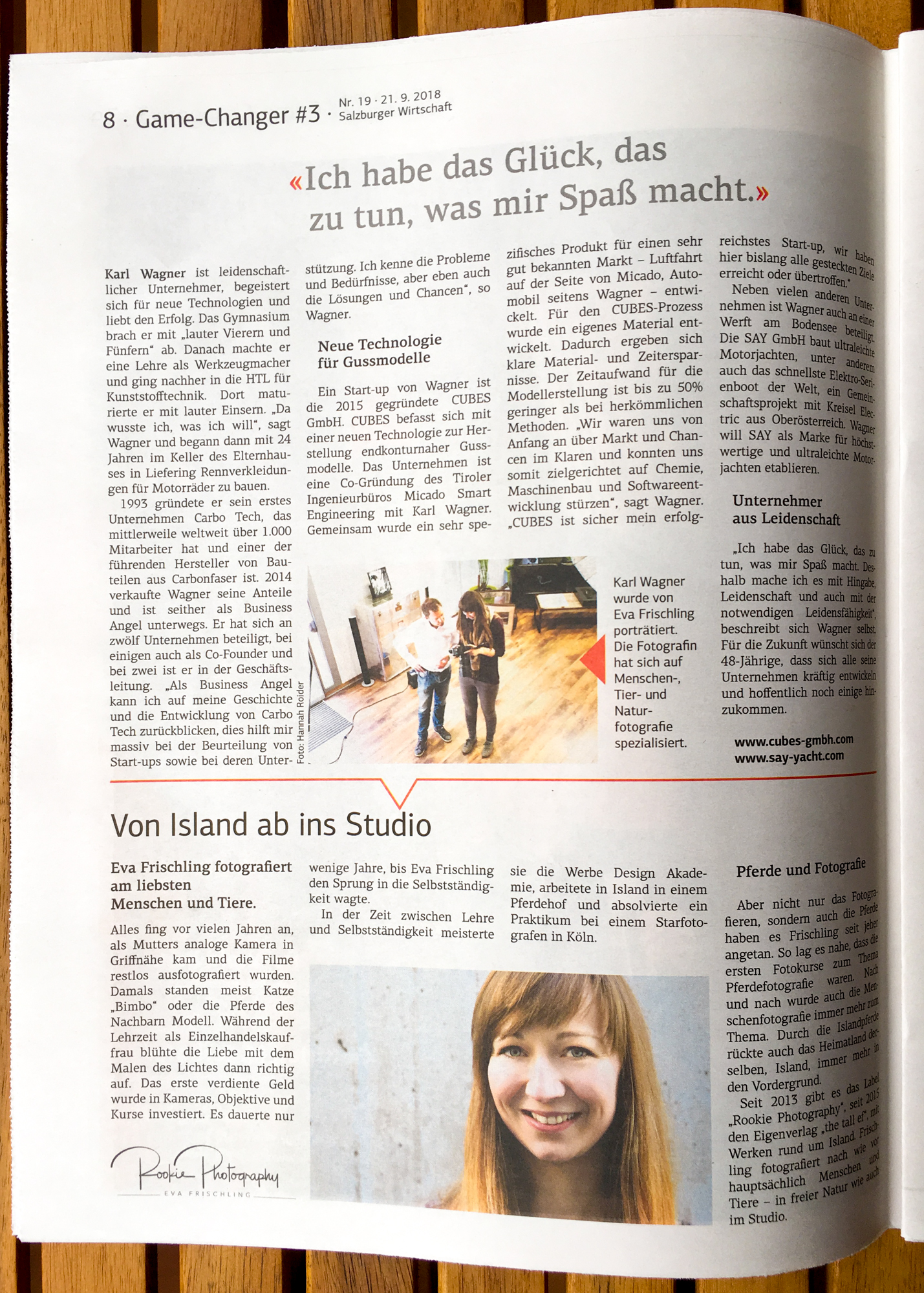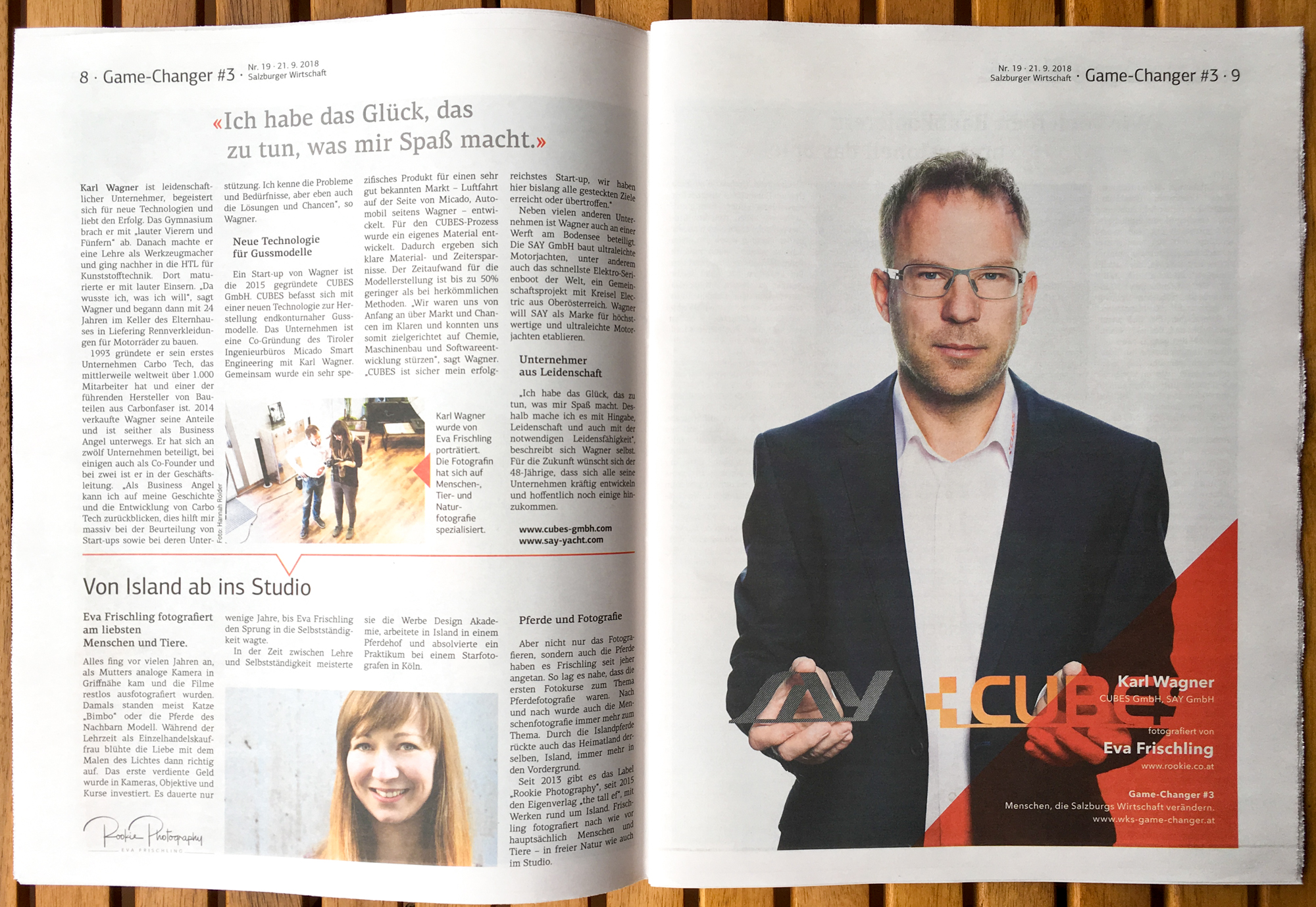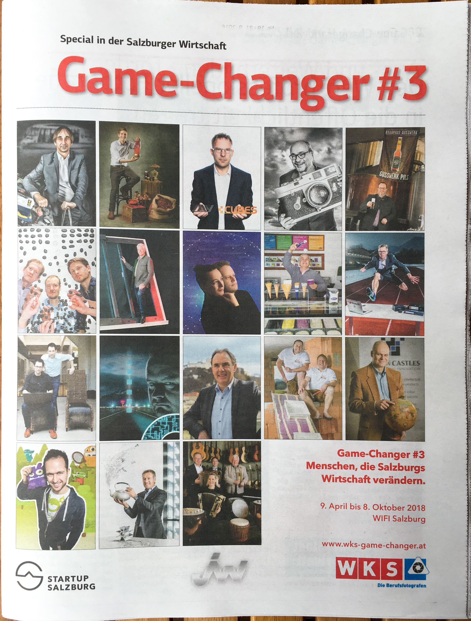 Game Changer ist eine Aktion der Wirtschaftskammer Salzburg, bei der je ein Start Up Unternehmen und ein Fotograf zusammen gewürfelt wird. Die Fotografen lichten das Unternehmen nach wenigen gewissen Richtlinien ab und dieses Bild wird einige Monate lang im Foyer vom WIFI ausgestellt. Neben dem Foto entsteht auch ein Video in dem alles über das Start Up und der Person/en dahinter erklärt wird. Das Foto, Video und etwas Text kommt dann auf eine Webseite und es wird auch fleißig auf Social Media Kanälen darauf aufmerksam gemacht. Unter anderem gibt es in der Salzburger Wirtschaftszeitung gegen Ende der Aktion einen großen Bericht, bei der jedes Start-Up/Fotografen Paar eine Doppelseite bekommt.