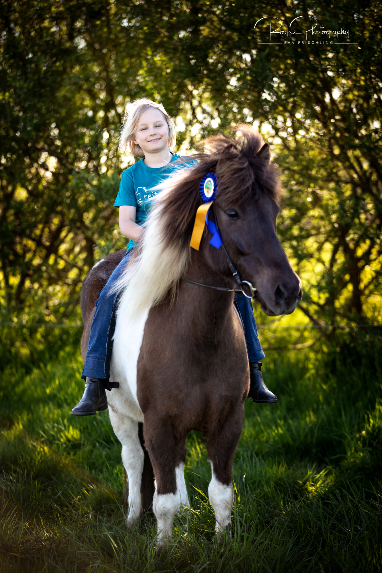 Zuerst wurde jedes Kind mit seinem Pferd alleine Fotografiert, dann noch Inka, und anschließend gab es noch ein Gruppenfoto, das sich als gar nicht so einfach raus stellte, da die Pferde doch lieber in das saftige Gras beißen wollten, als in die Kamera zu lächeln.