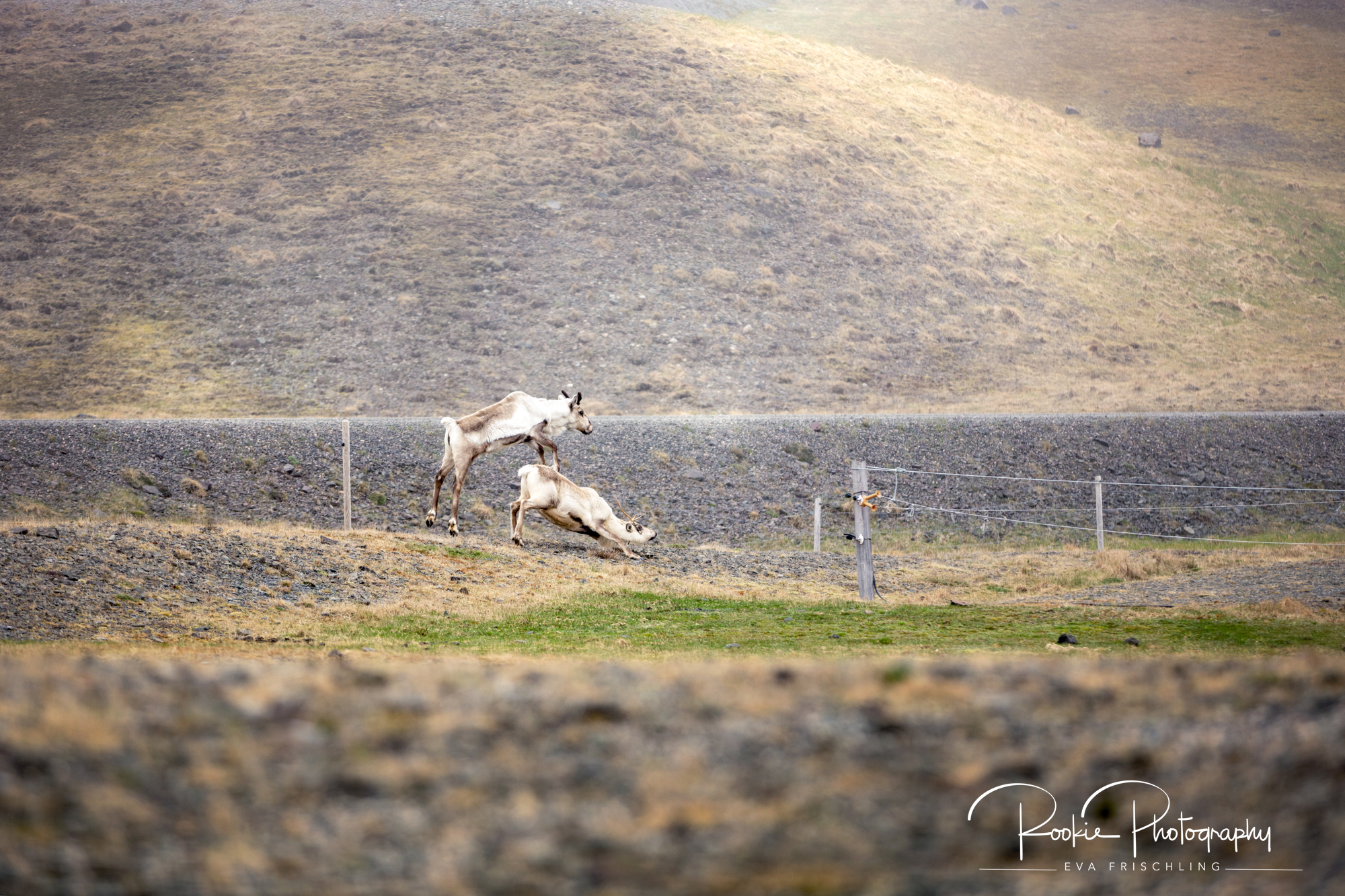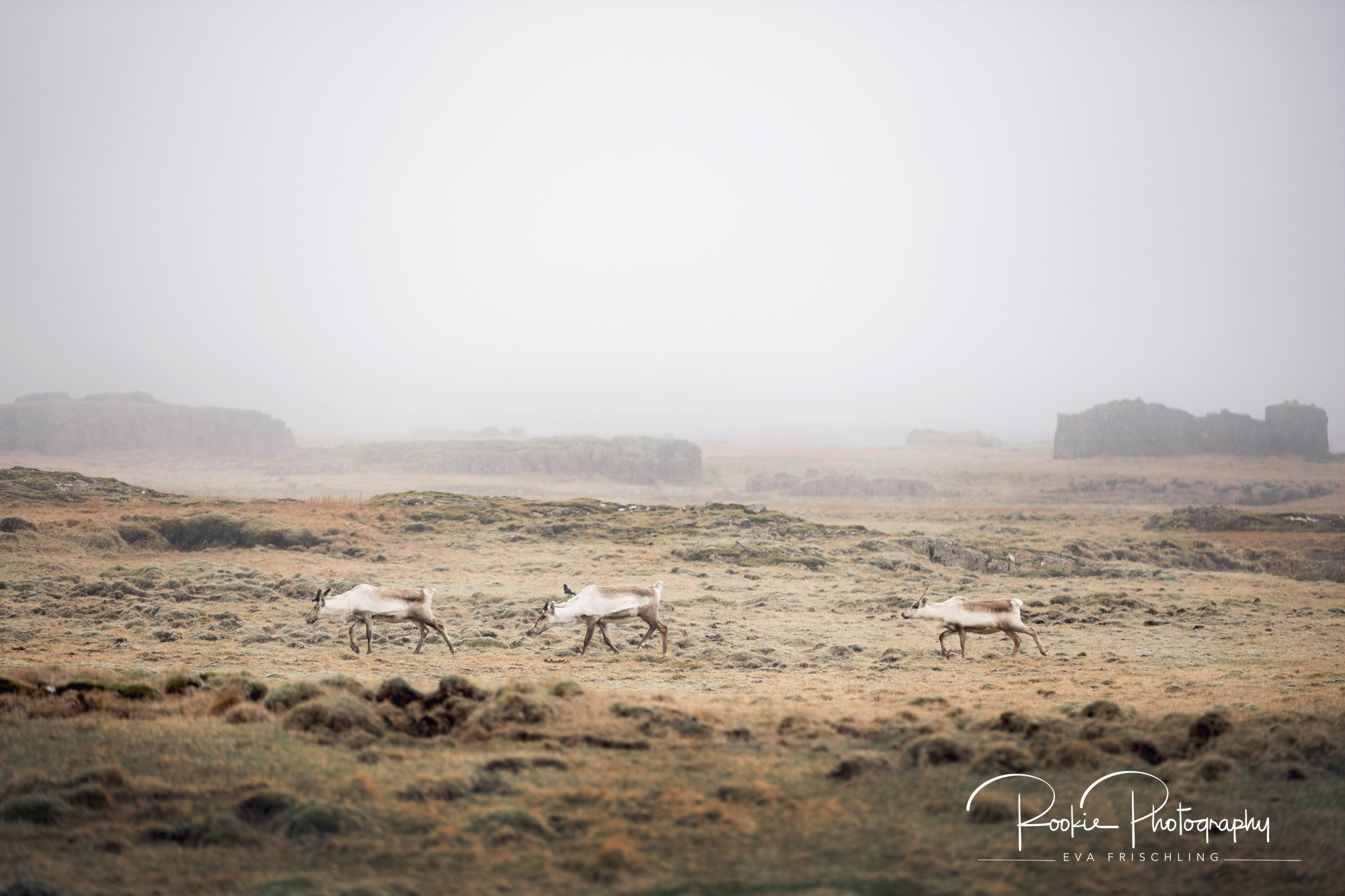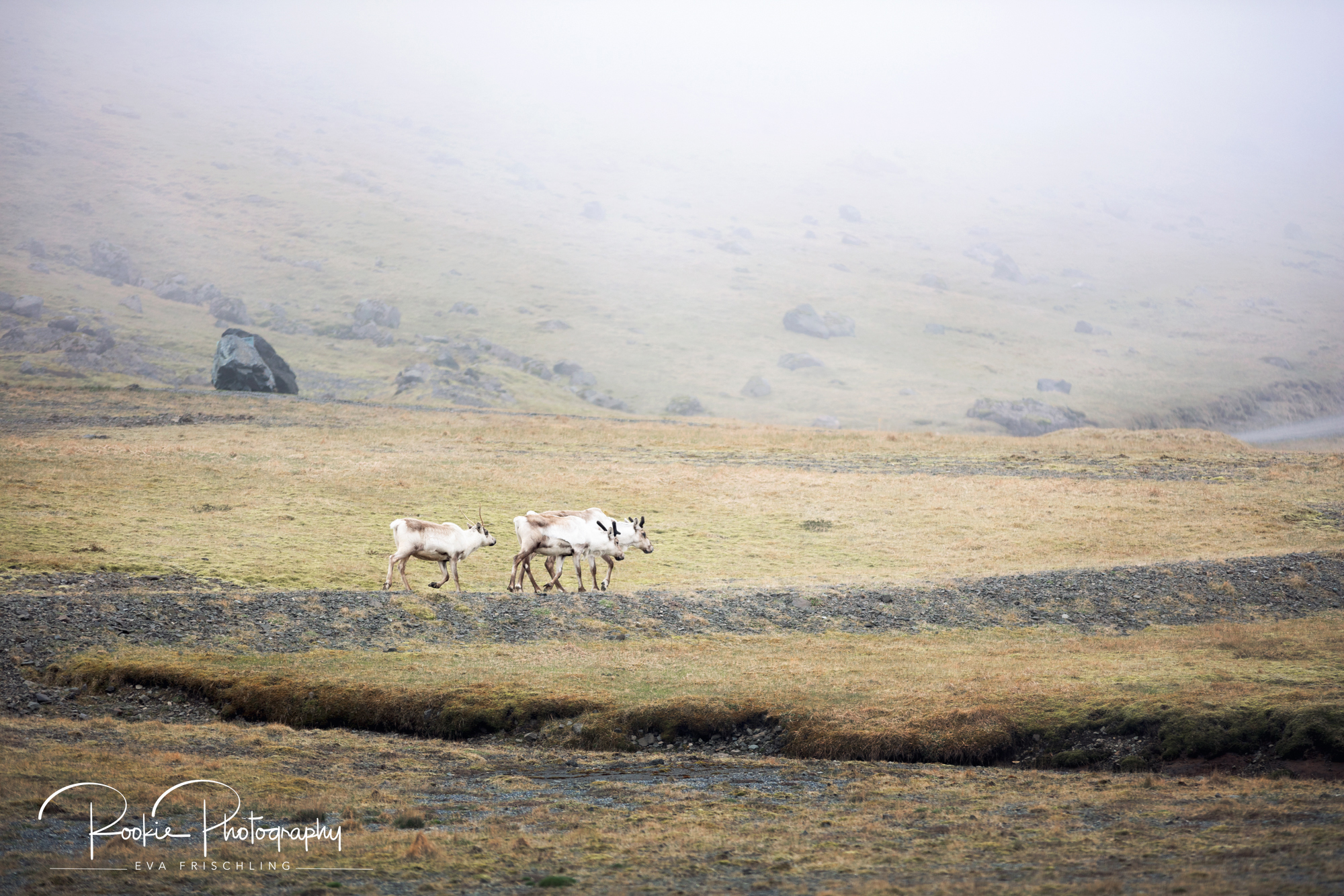 Wir fuhren gegen Mittag bei absolutem Nebel in Höfn weg. Auf dem Weg zur Ringstraße sah ich die drei Renntiere, die sich auf der Koppel des Stallbesitzers bei dem ich zu Gast war, eingenistet hatten. Da ich den Besitzer der Weide kenne, war ich so frech und bin unter dem Stromkabel durch geschlupft und hab mich von weit her den Tieren genähert. Die Rentiere fanden mich aber ziemlich doof und sind vor mir weg gelaufen. Ich sah sie in Richtung Stromzaun gehen und bekam den richtigen Riecher, dass die Tiere vermutlich darüber springen werden. Ich schlich mich geduckt an (das muss ein Anblick gewesen sein!) und machte mich erst im letzten Moment groß, als ich nah genug war – und da hüpfte das eine Rentier schon drüber, und das Andere schlüpfte unter dem Zaun hindurch. Danach gab es nur noch ein paar Bilder nach dem Motto: „auch ein schöner Rücken kann entzücken“