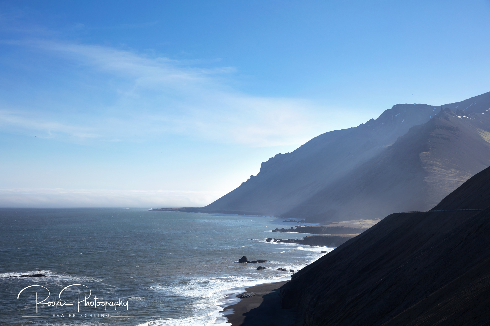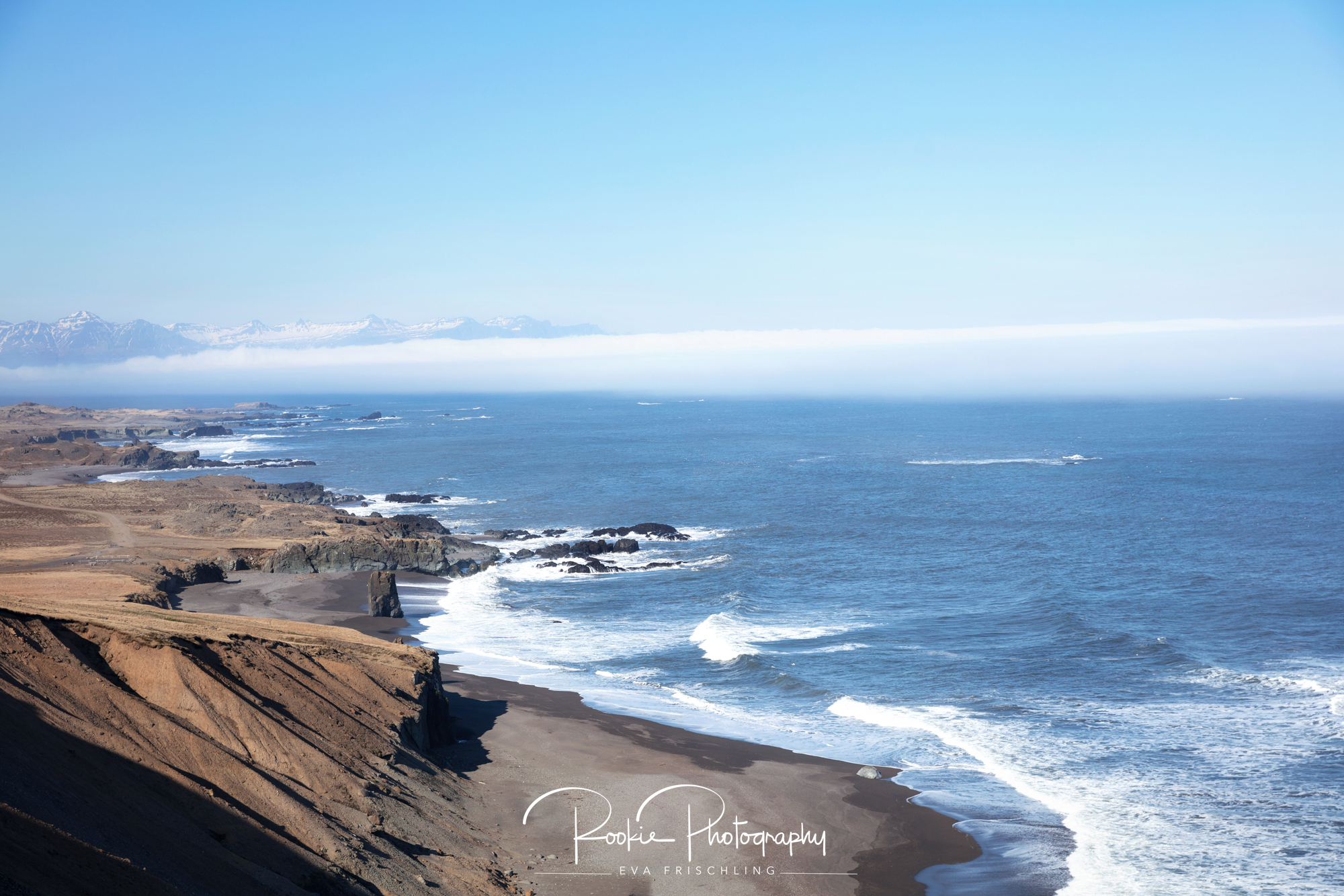 Wir hofften 2 Tage lang in Höfn auf schönes Wetter zum Fotografieren eines hoch geprüften Hengstes (besser gesagt, dem Gewinner des Landsmót’s 2016 der 6 jährigen Hengste). Aber der Nebel hing fest und ging nicht weg. Nach 15 Autominuten war. purer Sonnenschein. Am Atlantik hing zwar in weiter Ferne noch der Nebel, aber das war uns egal. Hauptsache wir spürten wieder den Sonnenschein auf unserer Haut.