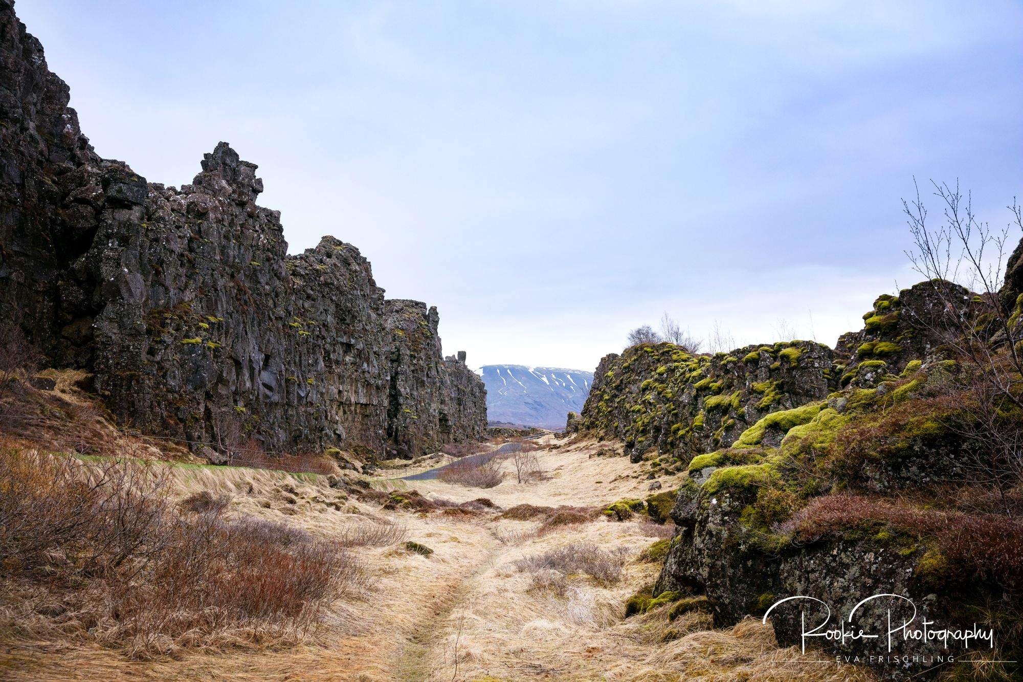 Wir waren ja Anfang Mai unterwegs und gaben uns die meist besuchten Sehenswürdigkeiten des Südens in ganz Island an dem Tag. Da wollte ich unbedingt vor dem ganzen Touri-Strom vor Ort sein. Und ja, das schafften wir auch. Wir fuhren von Reykjavík über Mosfellsbær zum Nationalpark Þingvellir. Dort waren wir: ALLEINE! Ob man es glaubt oder nicht. Neben absoluter Ruhe hatten wir eine leichte Wolkendecke über uns, aber ansonsten war es unglaublich toll dort.