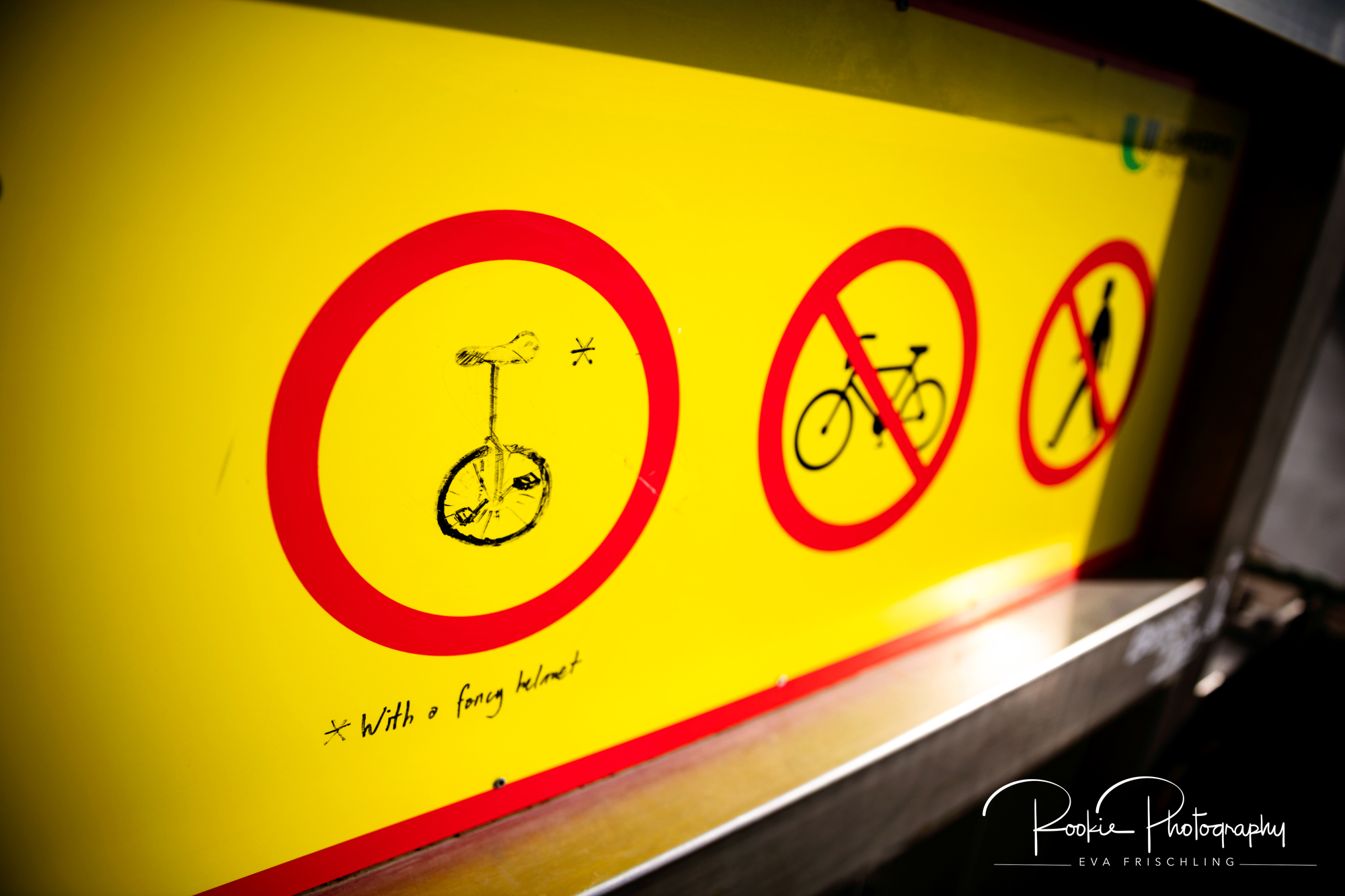 Natürlich steht auch am Gullfoss ein riesiges Schild, das einem den Durchgang zum äußersten Punk bei schlechten Wetterverhältnissen versperrt. Früher war dieser Durchgang nur mit einem Band und einem „betreten Verboten“ Schild abgesperrt. Da sich ein Großteil der Touristen dem Verbotsschild jedoch widersetzt haben, manch ein Touri auf dem teilweise durch die Gischt verursachten eisigen Boden dank einer Windböe ausrutschte, und in die tiefen Wassermassen hinunter fiele und starbe, gibt es seit diesem Jahr ein nahezu unüberwindbares Gatter. Neben den darauf angebrachten Schild, hat sich jemand einen Spaß erlaubt: Fahrverbot mit einem Einrad, auch wenn ein man einen „fancy“(ausgefallenen) Helm an hat. 😉