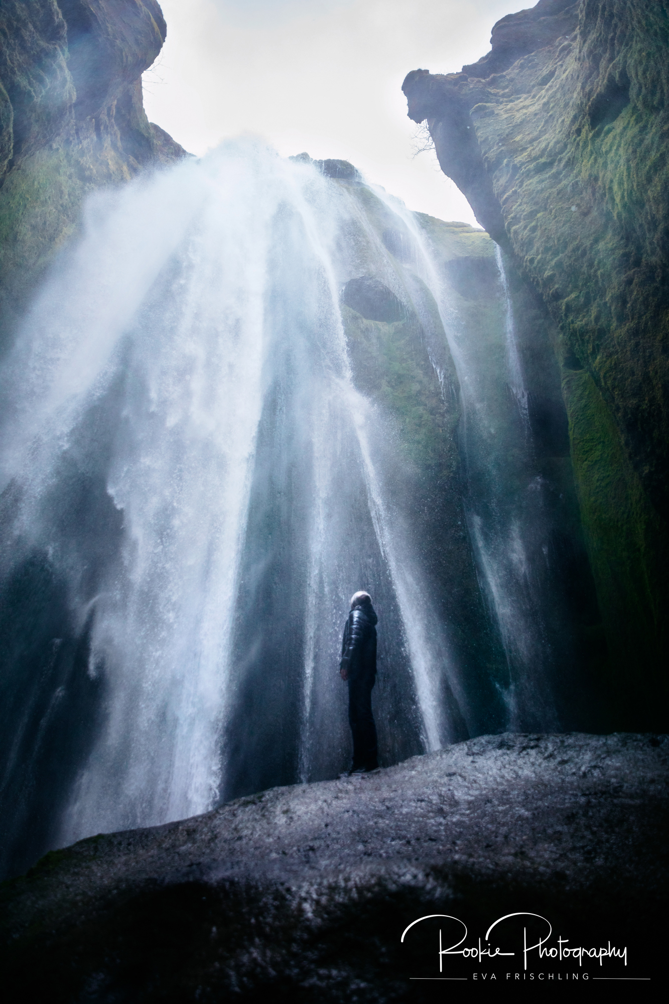 Der nächste Haltepunkt war der Seljalandsfoss. Da es auf der Welt schon genügend Bilder vom Seljalandsfoss gibt, und mittlerweile das Wetter von „trocken“ auf „nass“ umgeschlagen hatten, sparte ich mir eine Fotoserie von diesem Wasserfall. Mittlerweile waren auch schon ein paar mehr Touristen unterwegs. Ich wollte aber unbedingt zum Gljúfrabúi, das ist ein Wasserfall, der in einer Schlucht versteckt ist, wenige Meter neben dem Seljalandsfoss. Man geht über glitschige Steine durch die Schluchtöffnung und befindet sich dann mitten im tosenden Wasser. Einfach unglaublich dieser Wasserfall. Ist mir persönlich auch fast lieber wie der Seljalandsfoss.