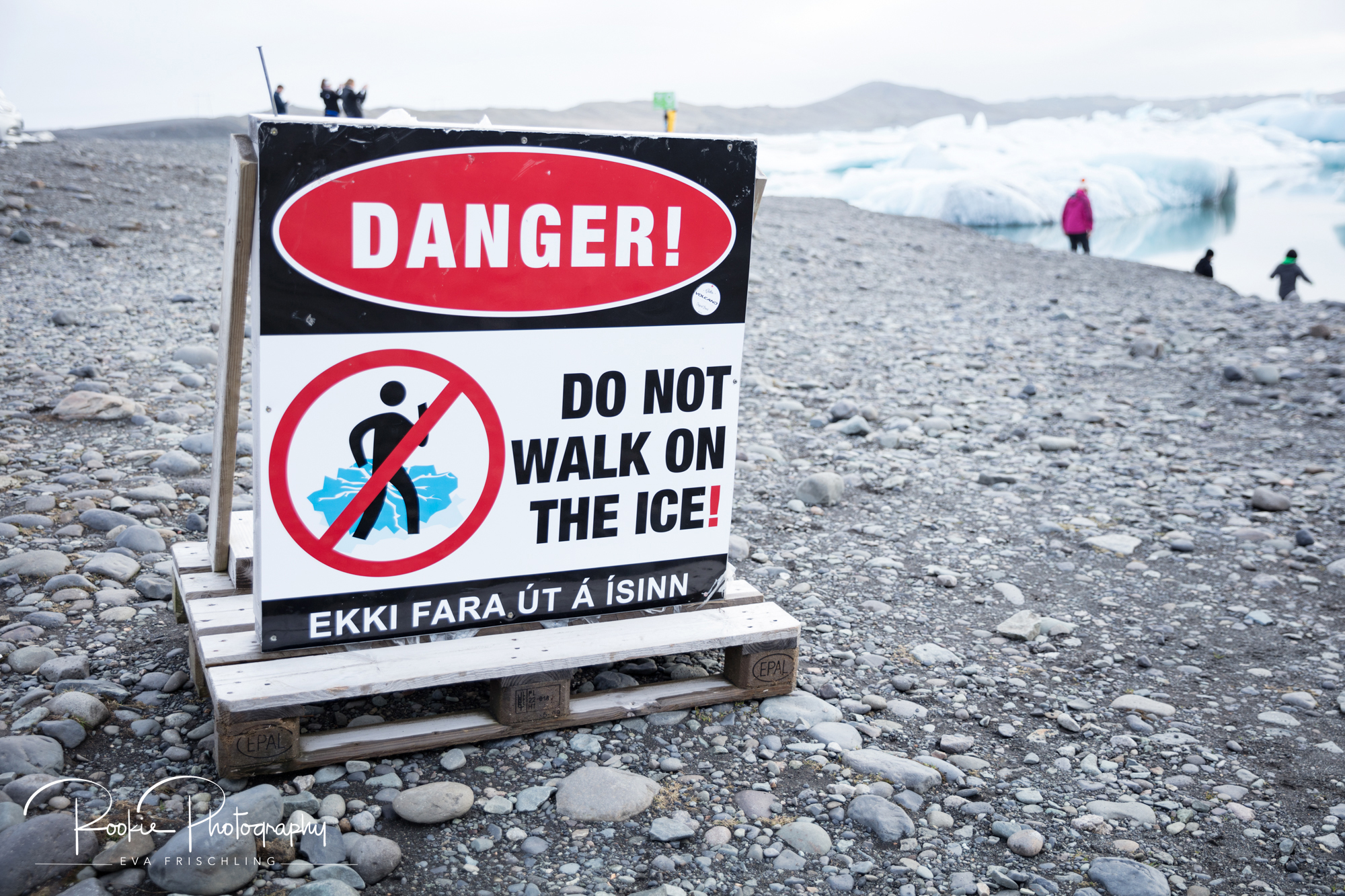 Das nächste Verbotsschild. Dass dieses Schild nicht ohne Grund aufgestellt wurde, dürfte mittlerweile klar sein. Nicht selten klettern Leute auf das angeschwemmte Eis. Die Eisschollen bewegen sich langsam, treiben auf das Wasser und der Mensch ist den Eismassen hilflos ausgesetzt. Keine gute Idee also..