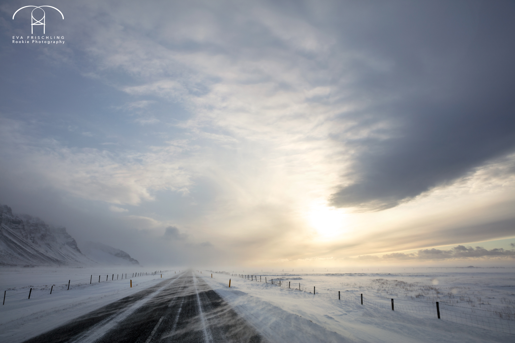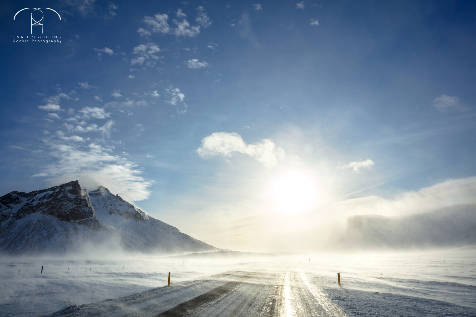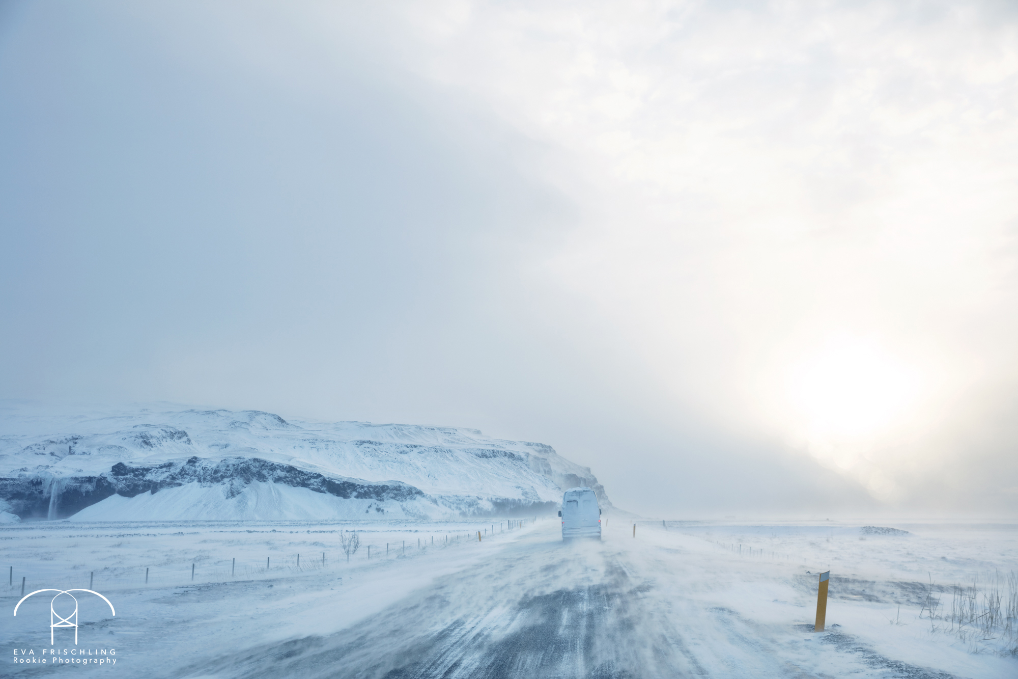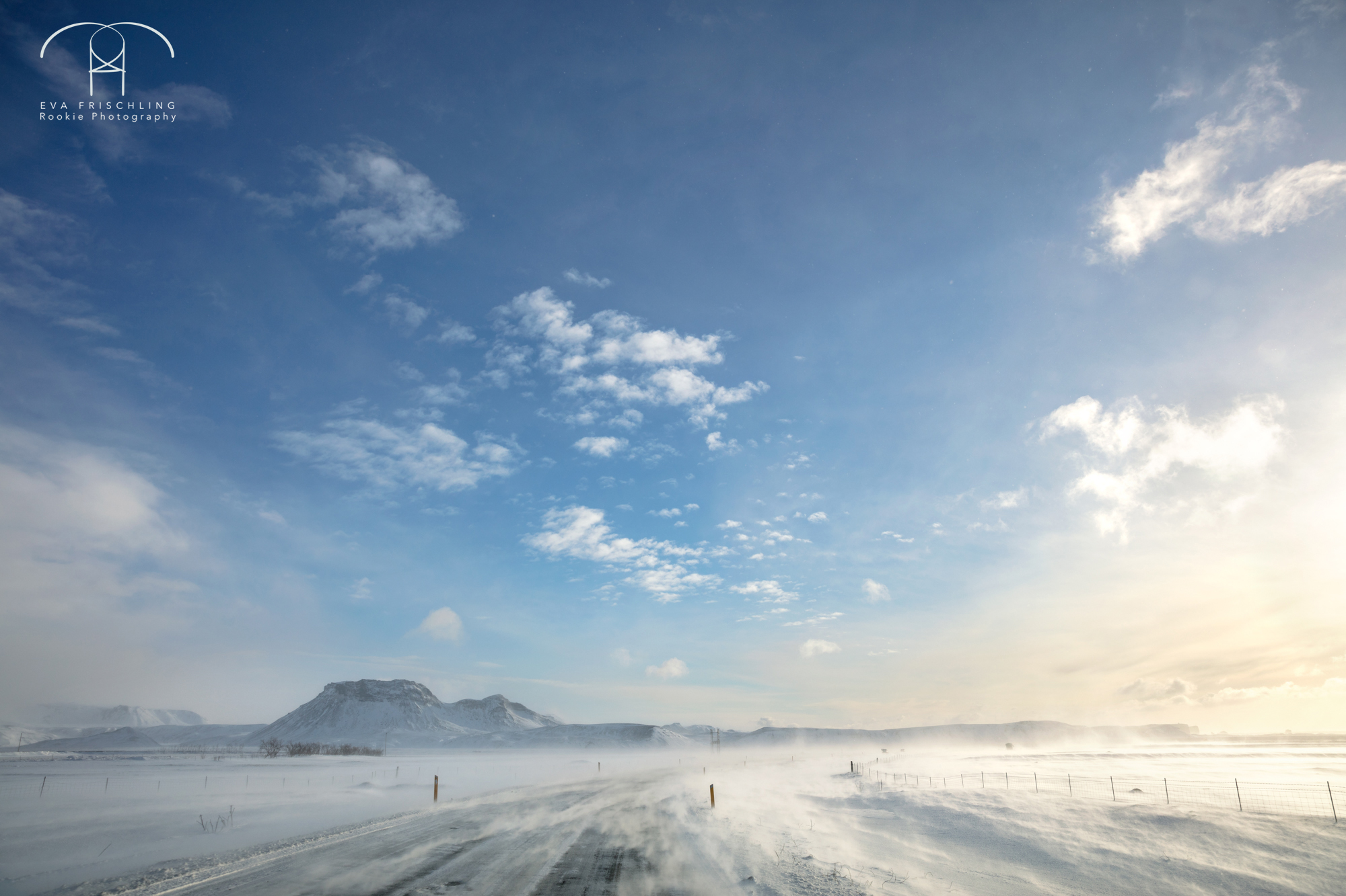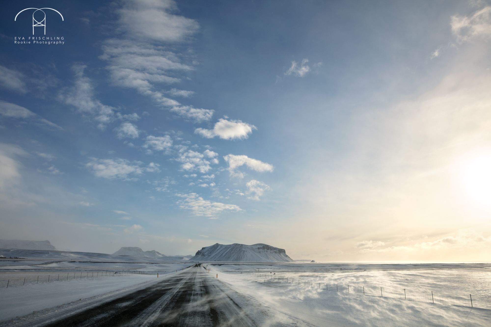 Als wir vom Seljalandsfoss zurück auf die Ringstraße abbogen, begrüßte uns die Sonne. Es war so ein traumhaft schöner Moment. Der Wind fegte den Schnee über die Ebenen und die Sonne tat das Übrige, um die Stimmung perfekt zu machen.