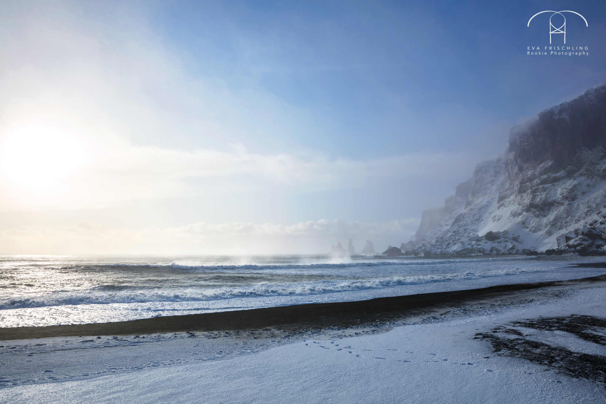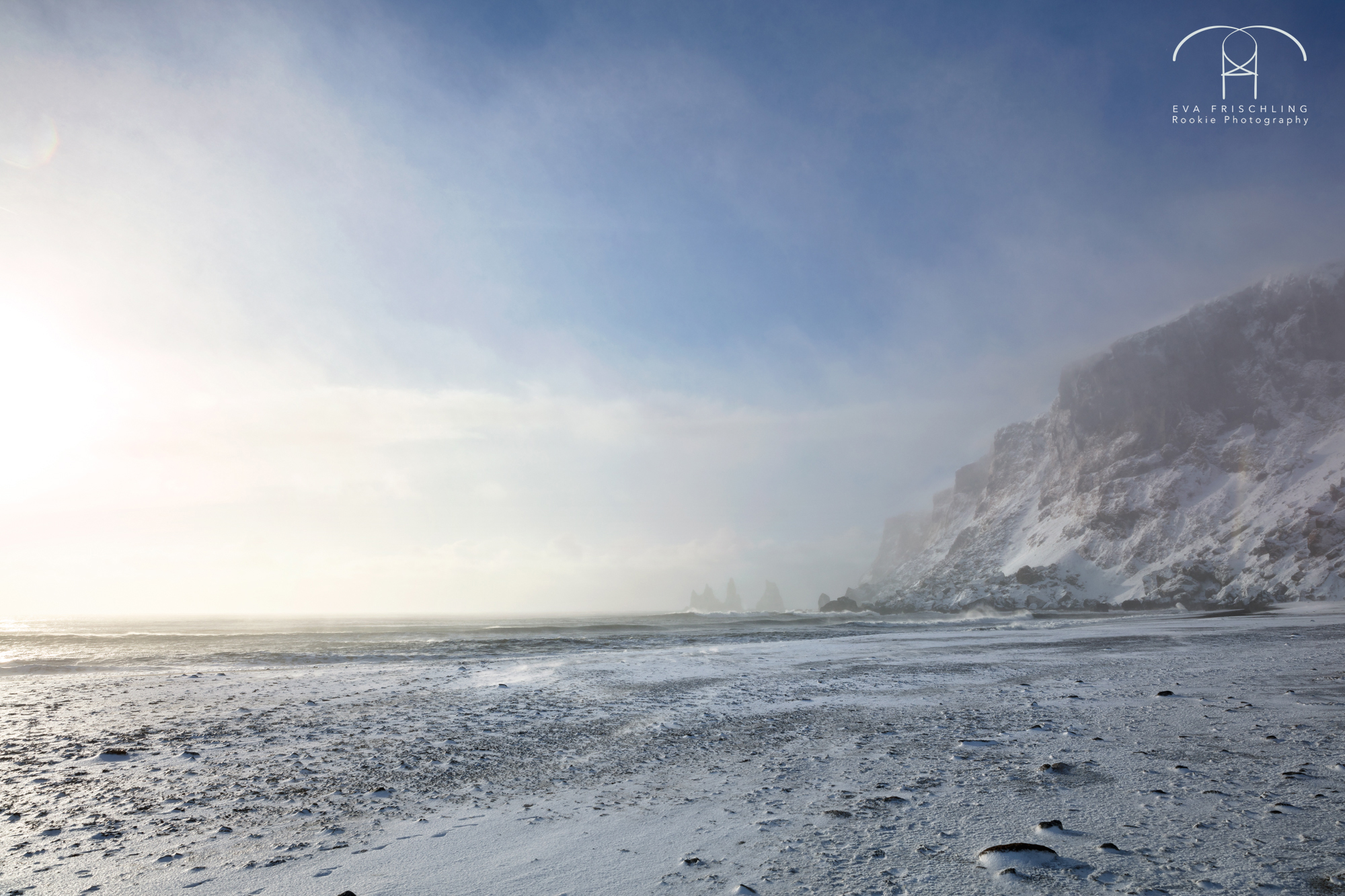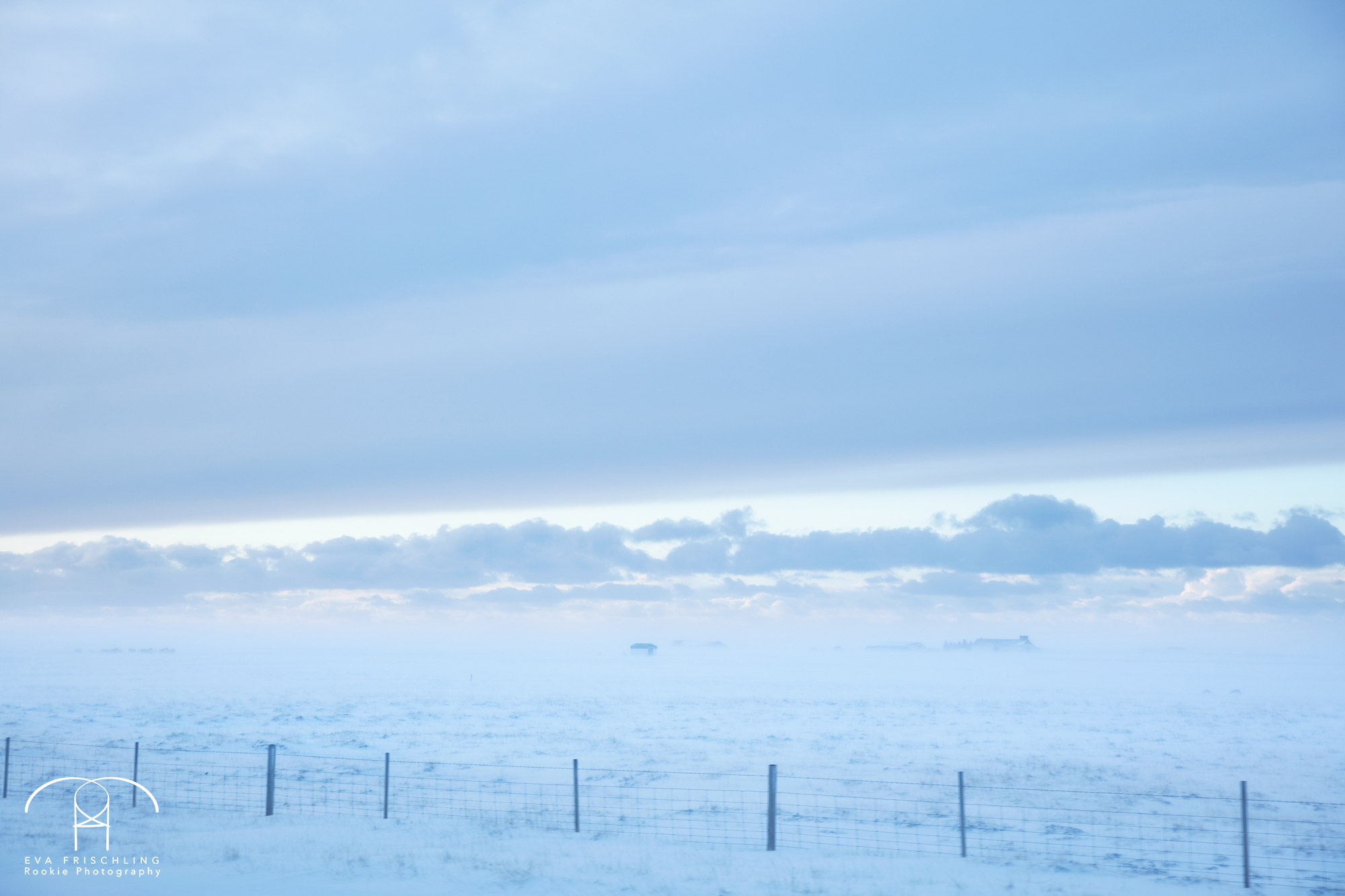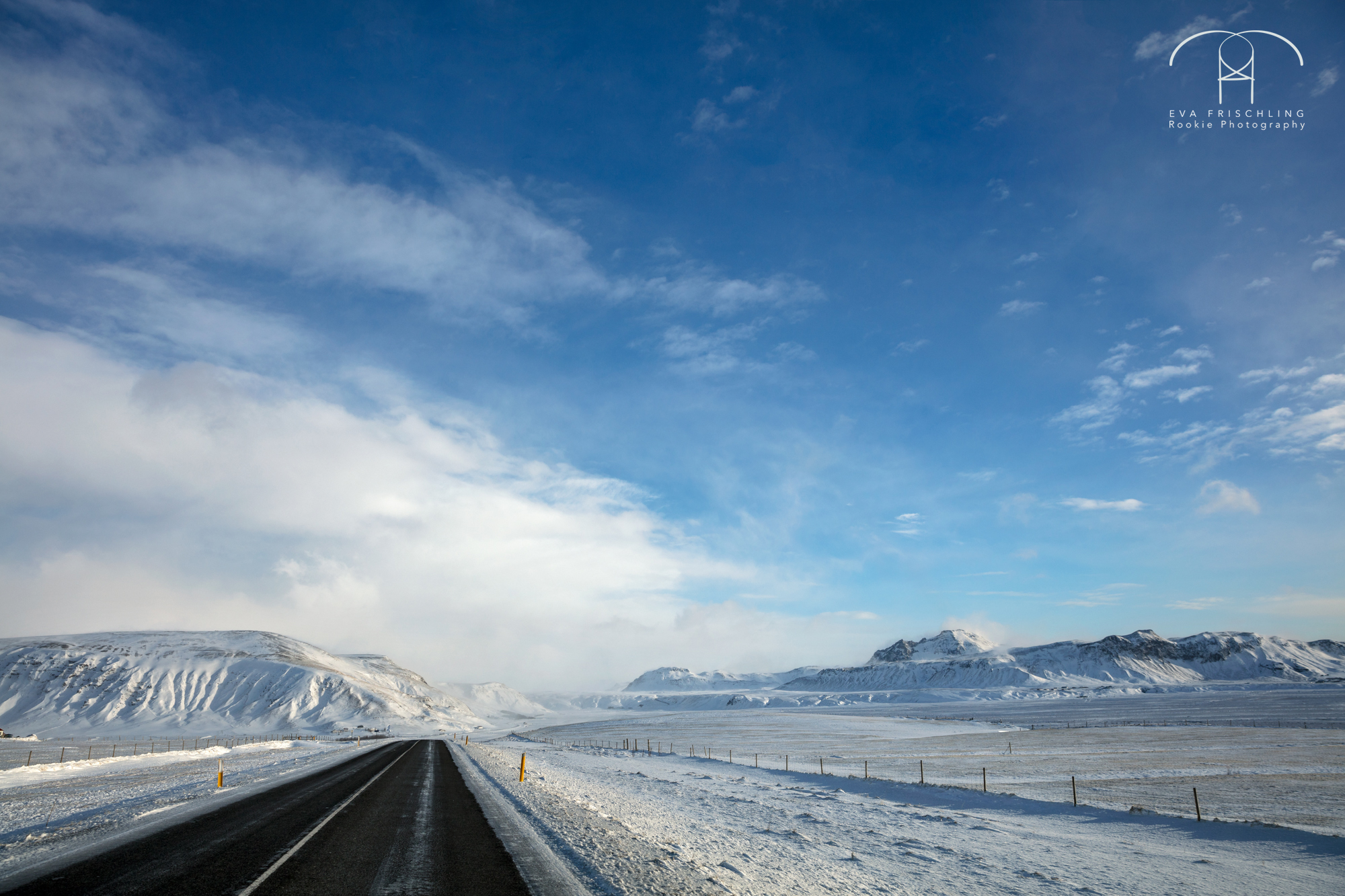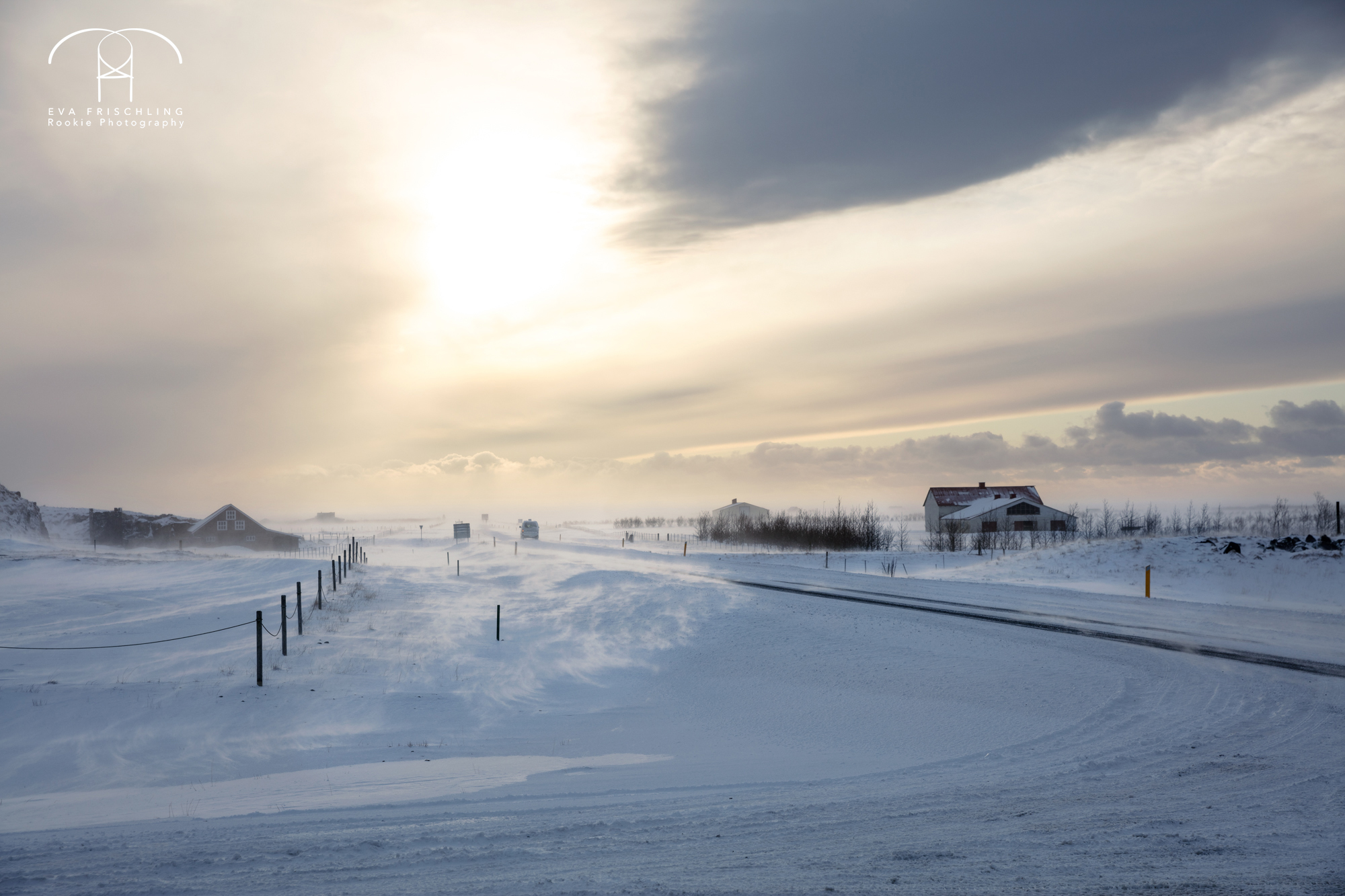 Als wir vom Seljalandsfoss zurück auf die Ringstraße abbogen, begrüßte uns die Sonne. Es war so ein traumhaft schöner Moment. Der Wind fegte den Schnee über die Ebenen und die Sonne tat das Übrige, um die Stimmung perfekt zu machen.