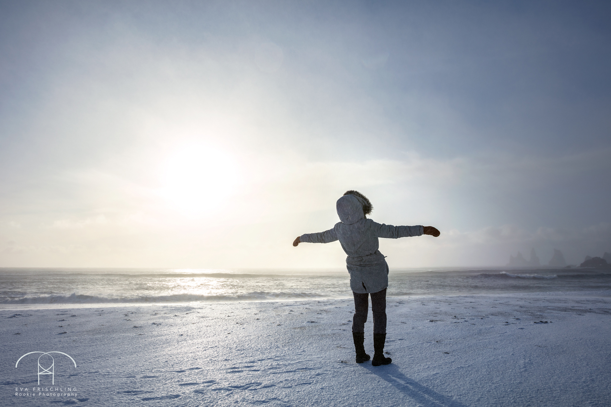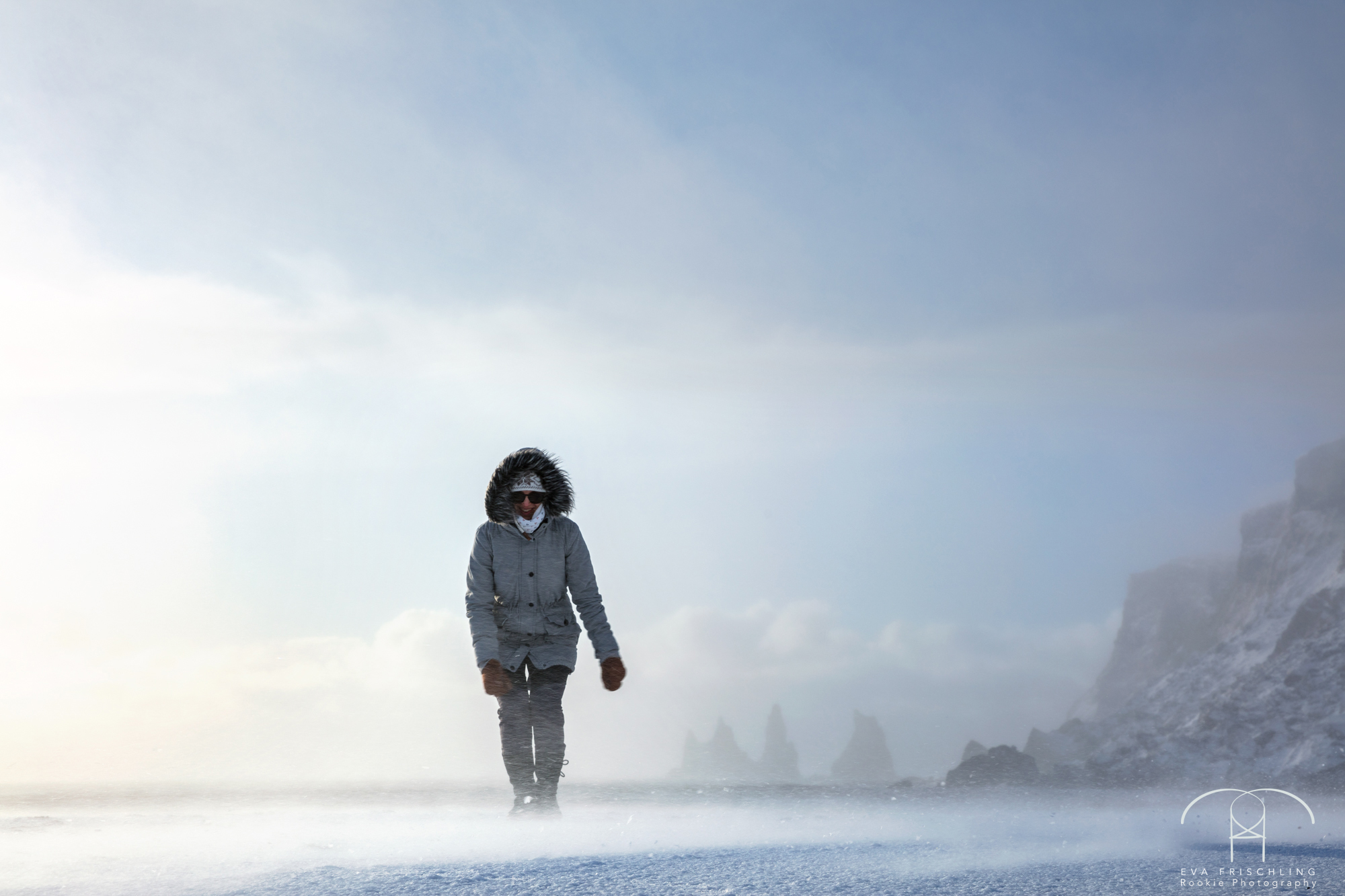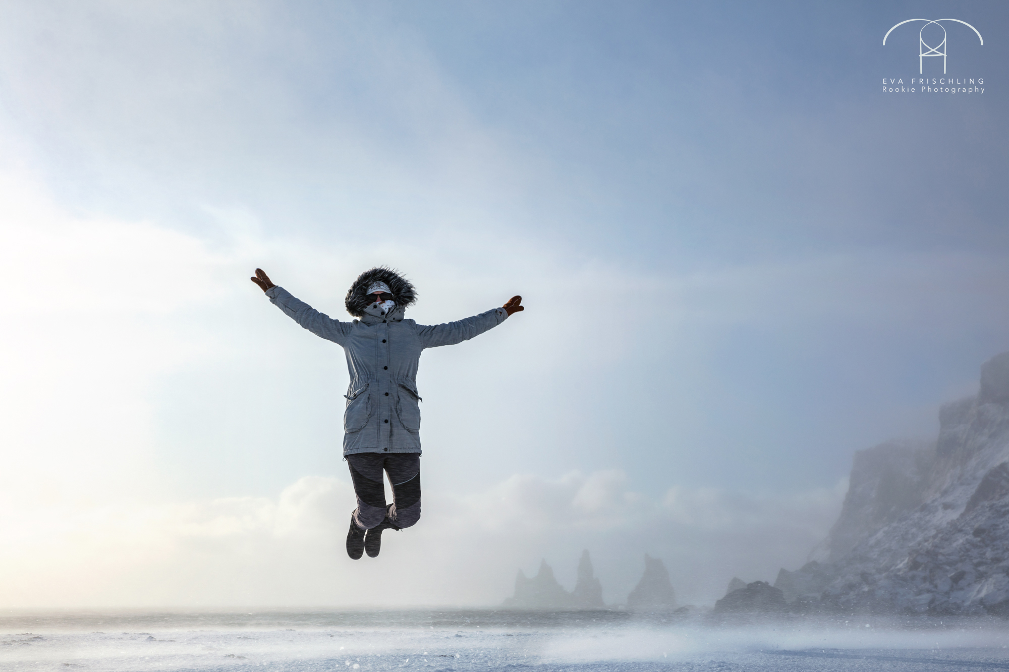 Stattdessen fotografierte ich meine Schwester beim springen. Gar nicht so einfach bei so viel Wind. Als nächstes hat sie sich dann einfach gegen den Wind gelegt. Denn dabei fliegt man in Island auch ohne jegliche Körperspannung nicht um.