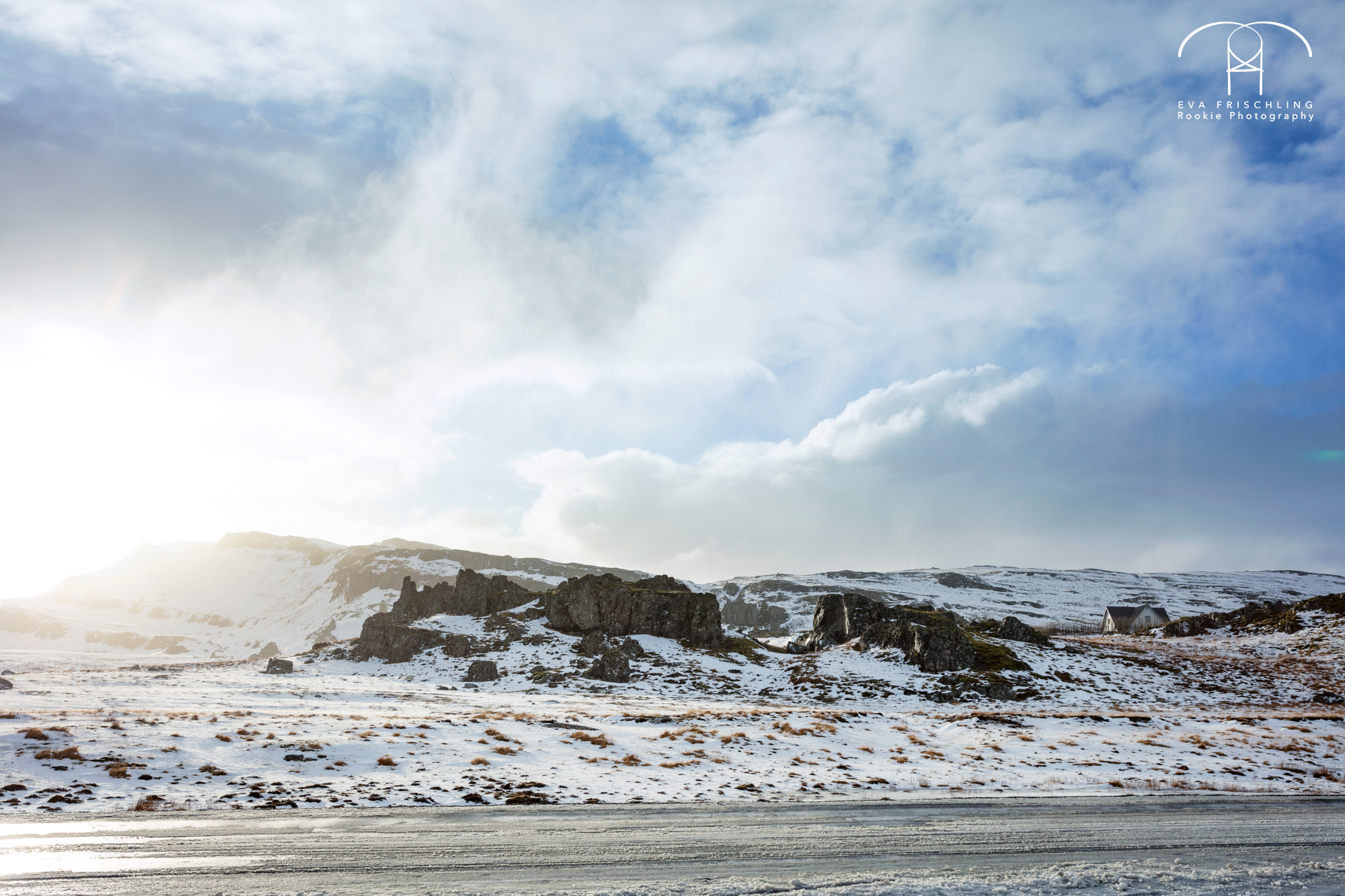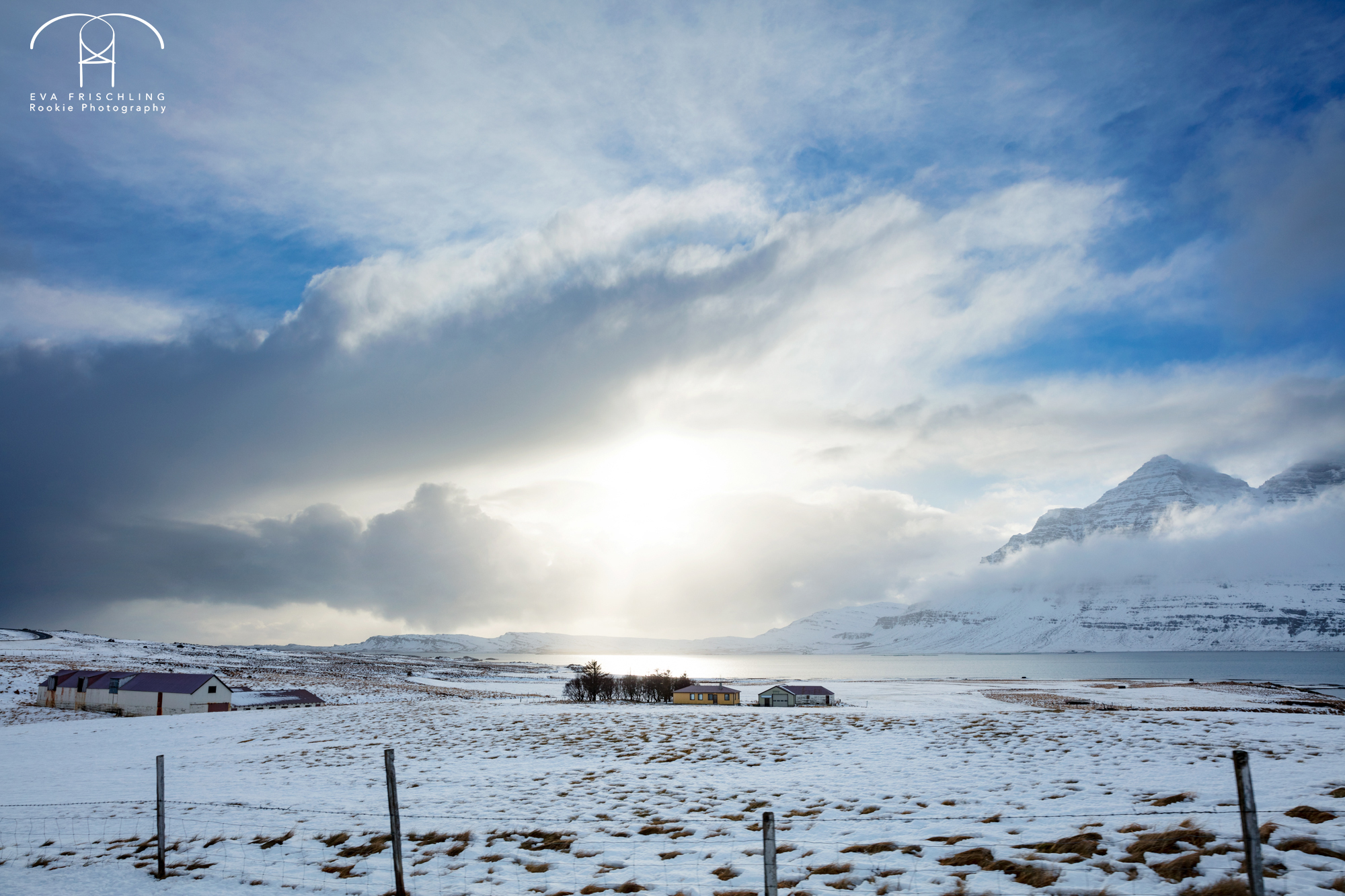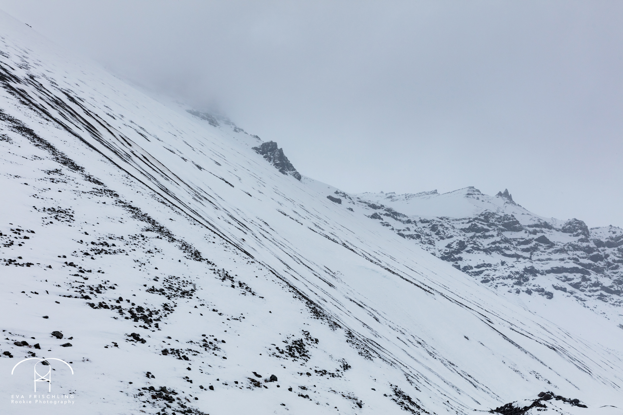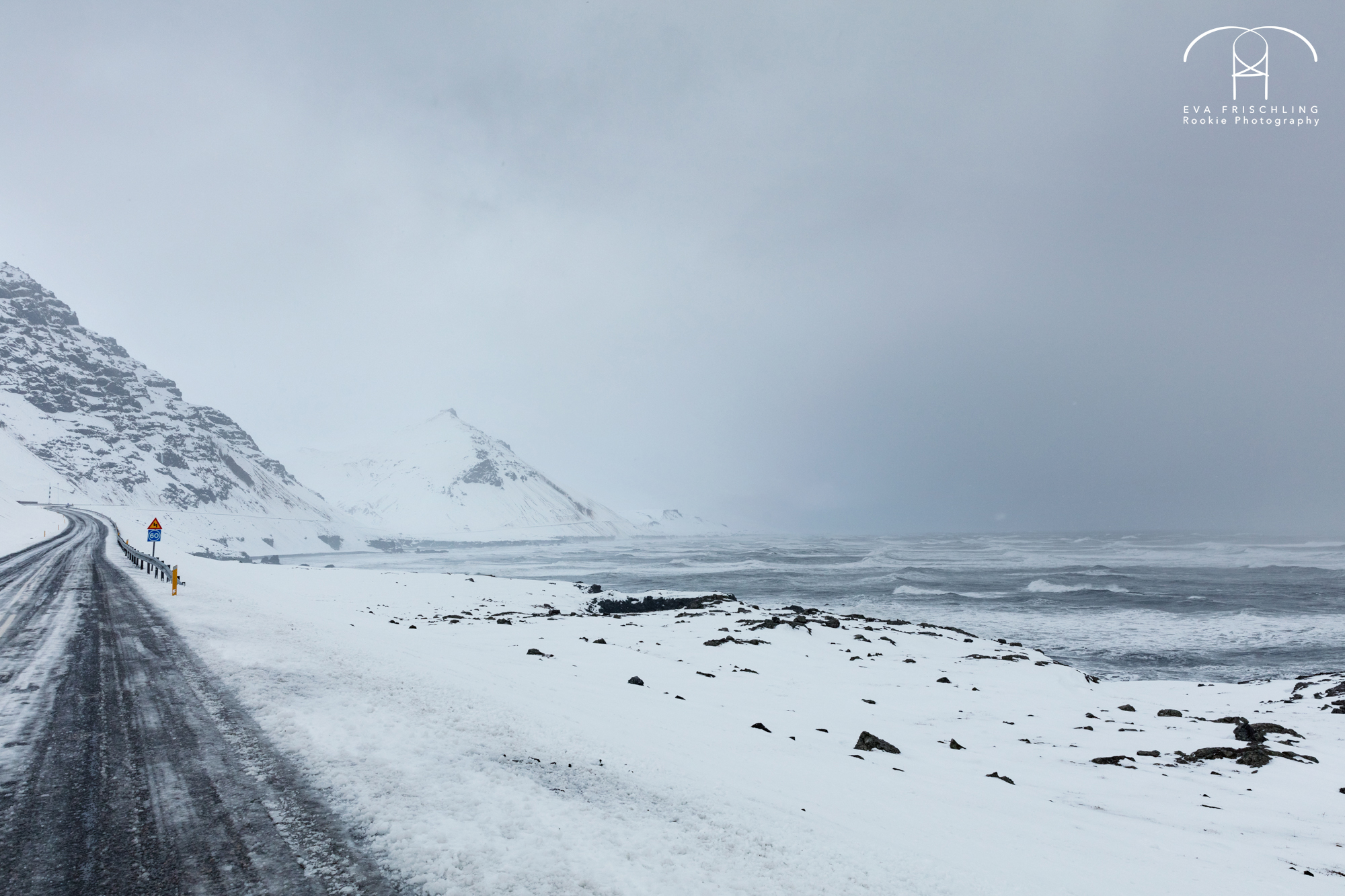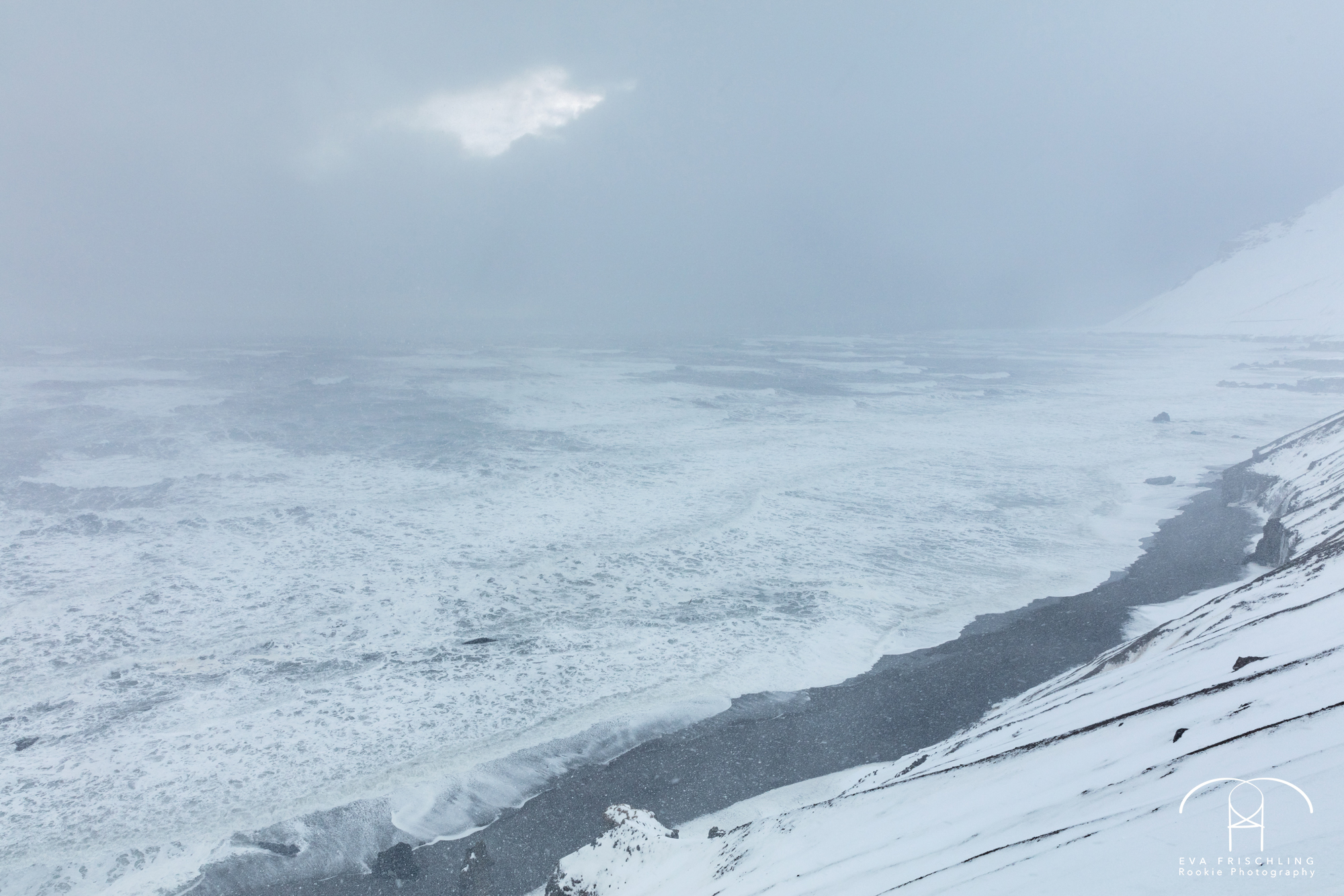 Von Höfn aus fährt man etwa 12 Kilometer auf der Bundesstraße, und dann noch 5 Kilometer auf einer Schotterstraße. Auf der Bundesstraße flog uns eine Schneewehe um die Andere um die Ohren, aber mit etwas geringerer Geschwindigkeit war ein Weiterkommen ohne große Probleme möglich. Als wir dann auf die Schotterstraße abbogen kamen wir fast gar nicht mehr voran. Die Sturmböen waren so heftig, dass ich mit Schrittgeschwindigkeit fahren musste und des öfteren stehen blieb, um die Böen auszuharren. In dem Moment waren wir einfach nur froh, dass wir nur noch wenige Kilometer zu fahren hatten.