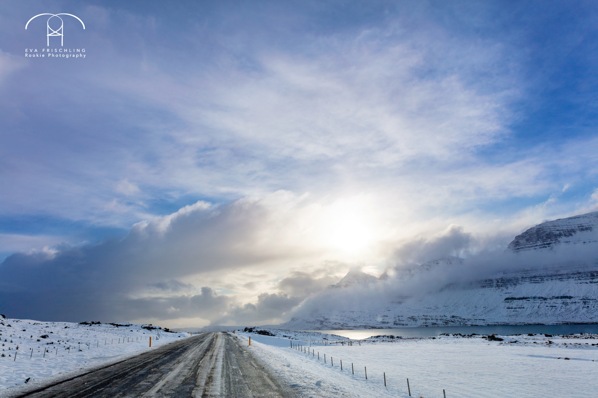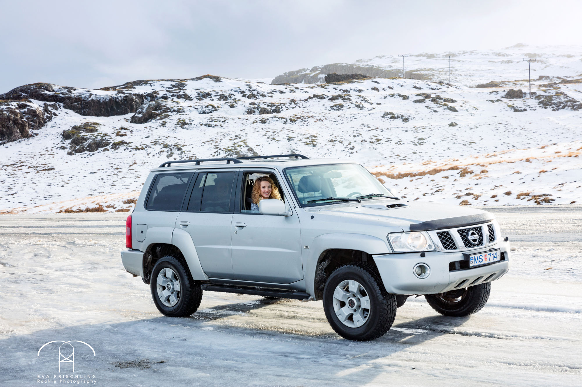 Trotz der Sonne war die Straße noch komplett mit einer Eisschicht bedeckt. Ohne dem Allrad und den Spikes auf den Reifen wären wir nicht weit gekommen. Wir waren auch unglaublich froh, dass wir so eine riesen Karre gemietet hatten. Das hat uns die Fahrt schon ungemein erleichtert.