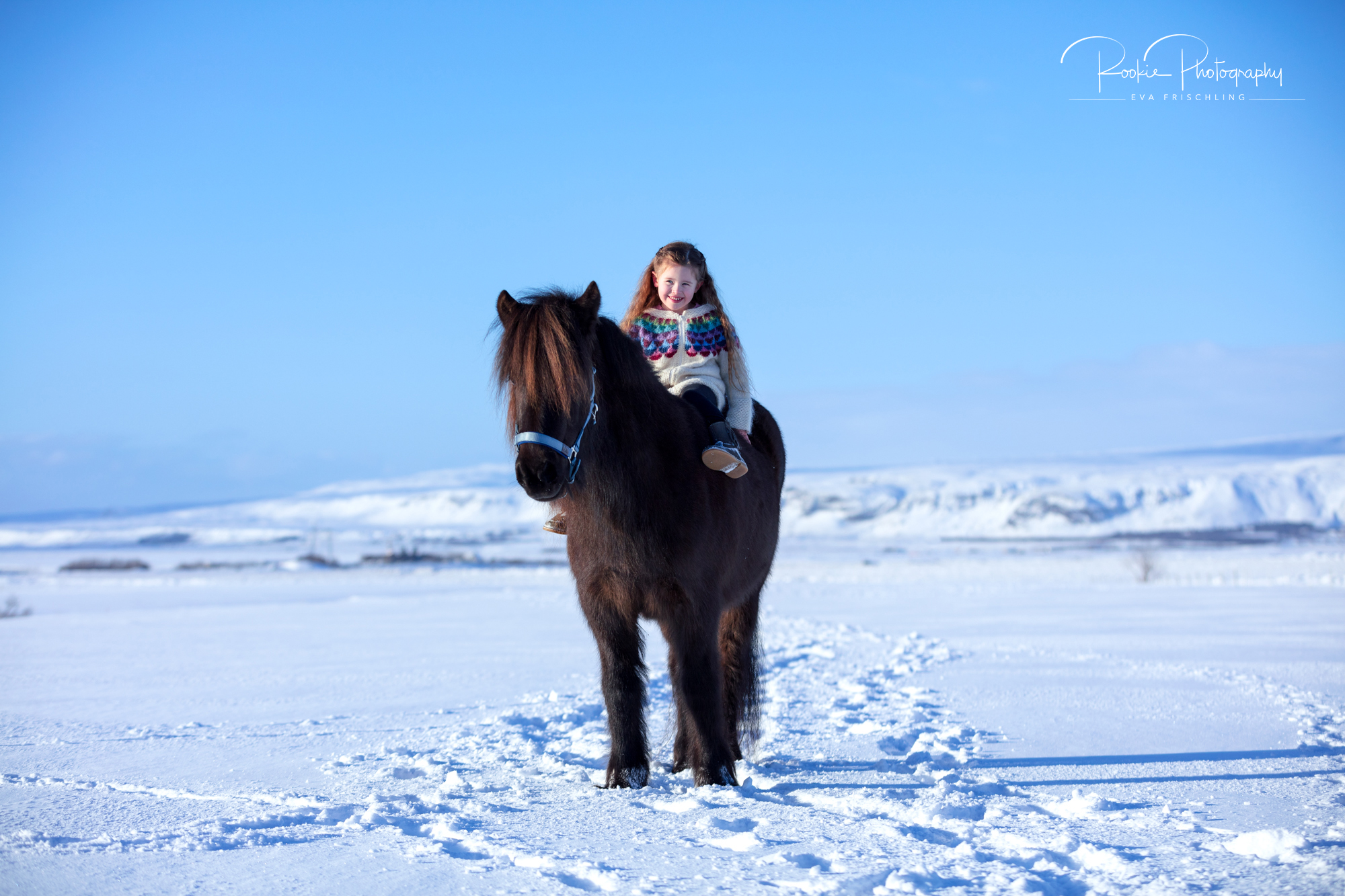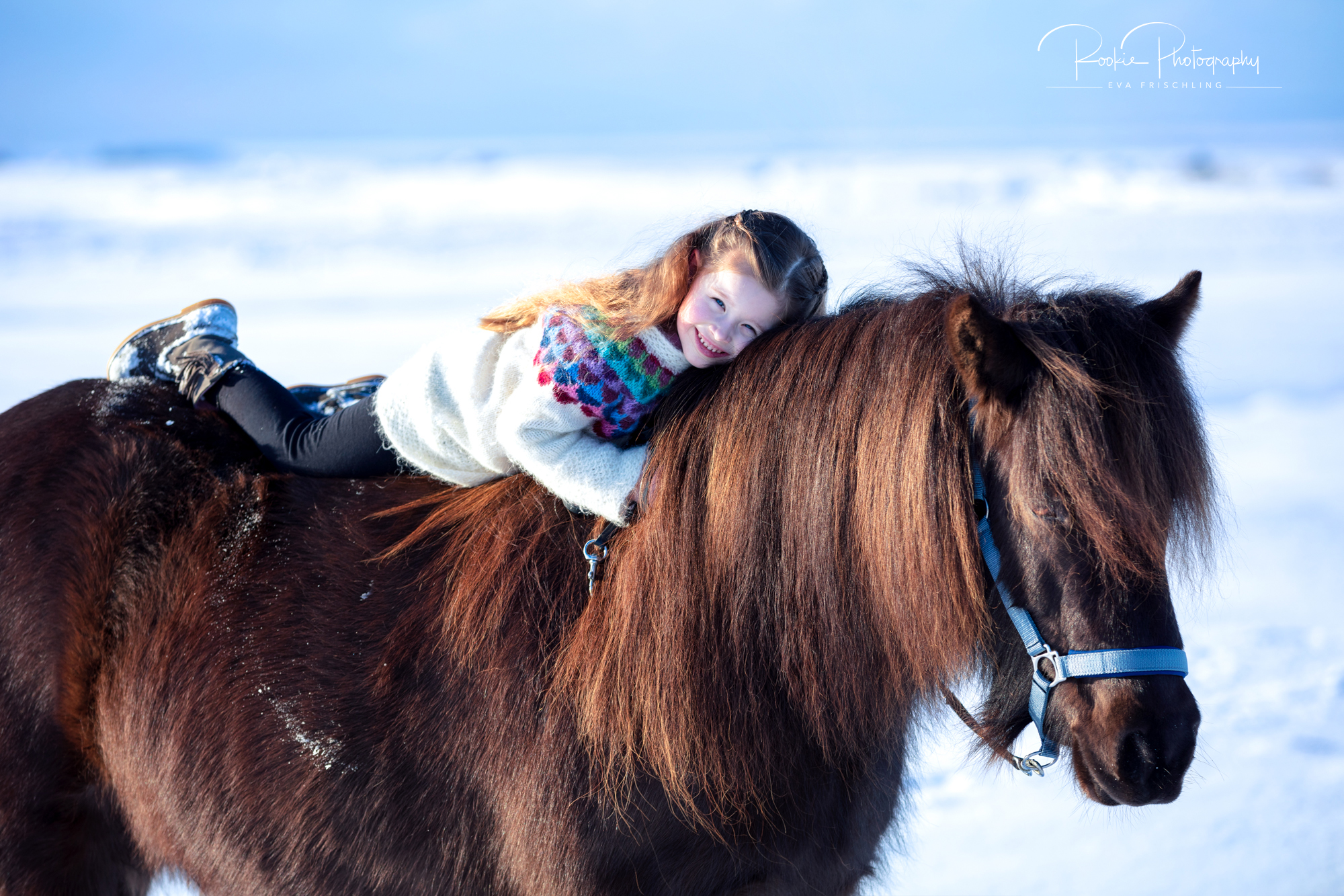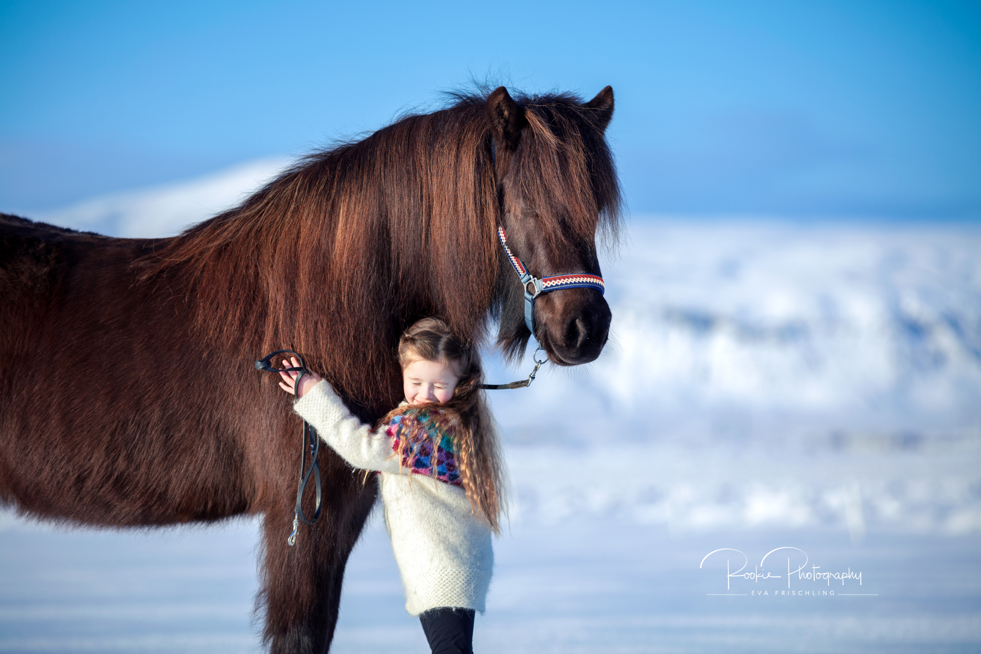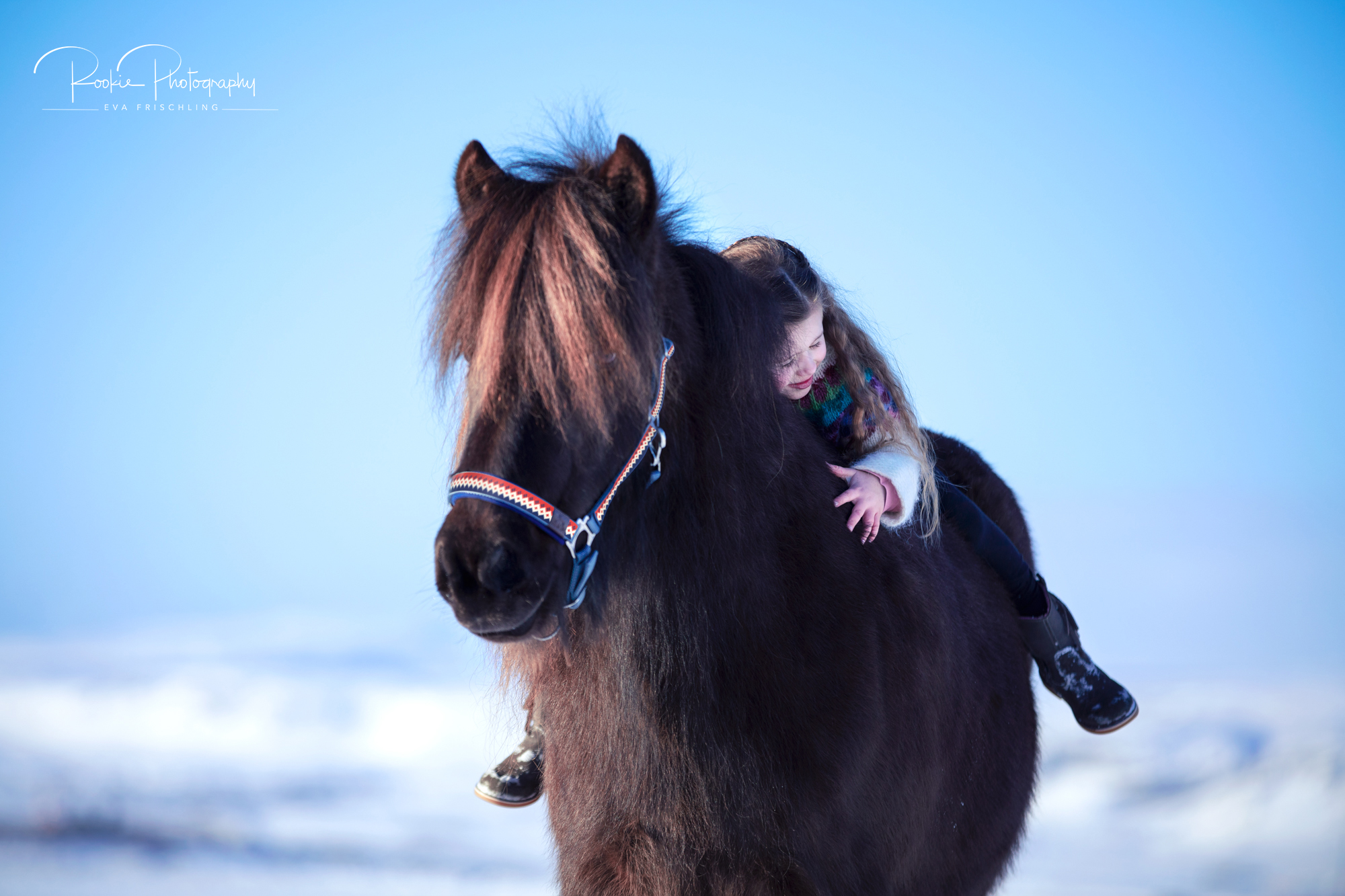 Das islandfarbene Halfter fotografierten wir also mit María und Þota. Dabei stand eines im Vordergrund: die Liebe zwischen Mensch und Pferd. Und wer kann diese Liebe besser ausdrücken als ein kleines Mädchen, das am liebsten den ganzen Tag mit Þota knuddeln würde.