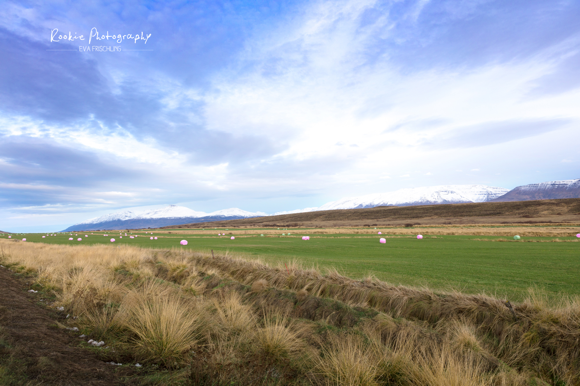 Es ging weiter von Akurgerði die Halbinsel Trollaskagi hinauf. Kurz nach der Stadt kamen uns die pinken Heuballen unter.