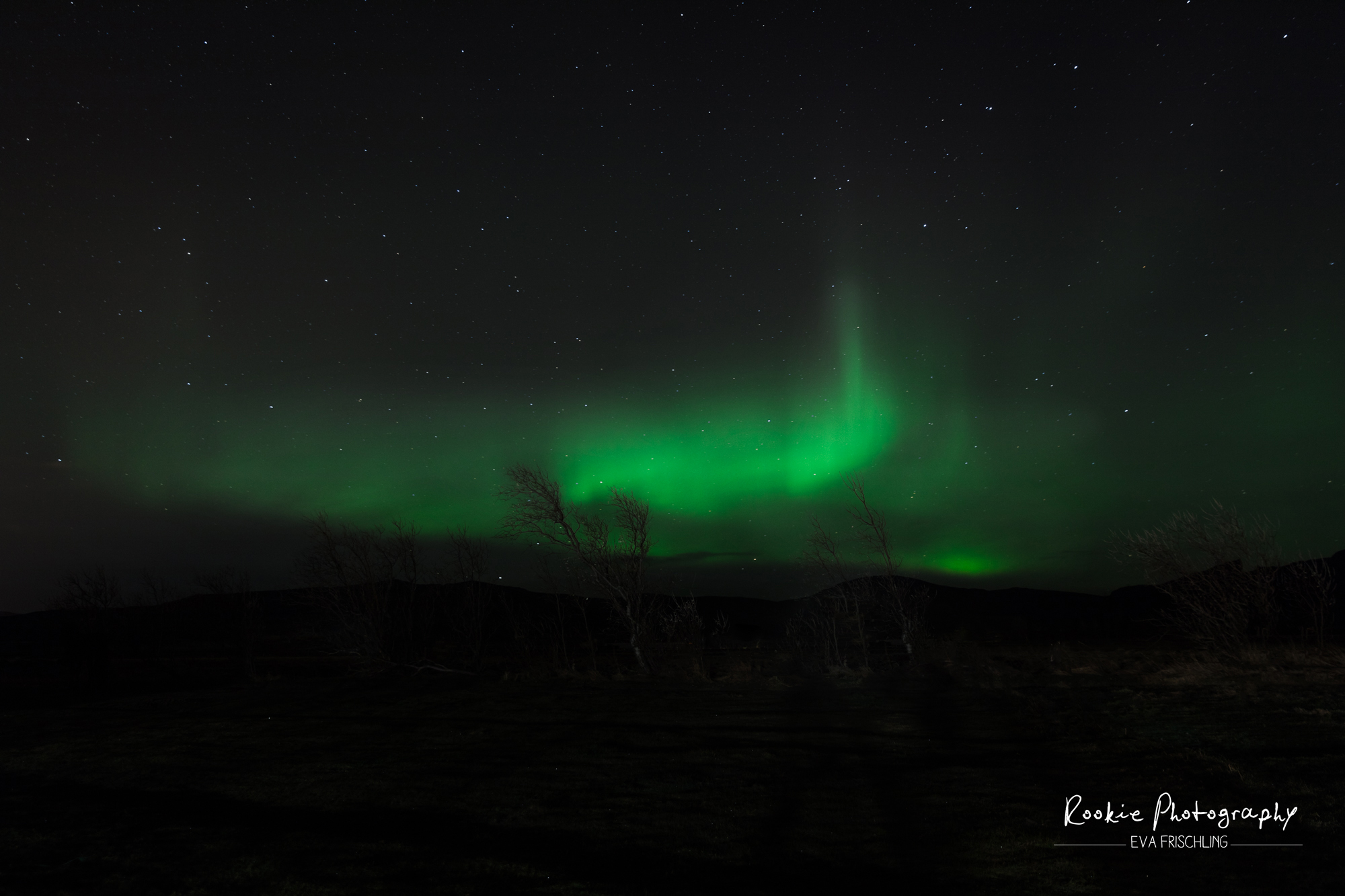 Irgendwann am späten Abend ging ich vor die Tür unserer tollen Unterkunft (wir waren bei Sabine Girke in einer typisch isländischen Hütte untergebracht) um meine Kamera für mögliche Nordlichter schon mal einzustellen. Was ich dann sah entlockte mir einen kleinen Freudentanz: denn es waren Nordlichter zu sehen!