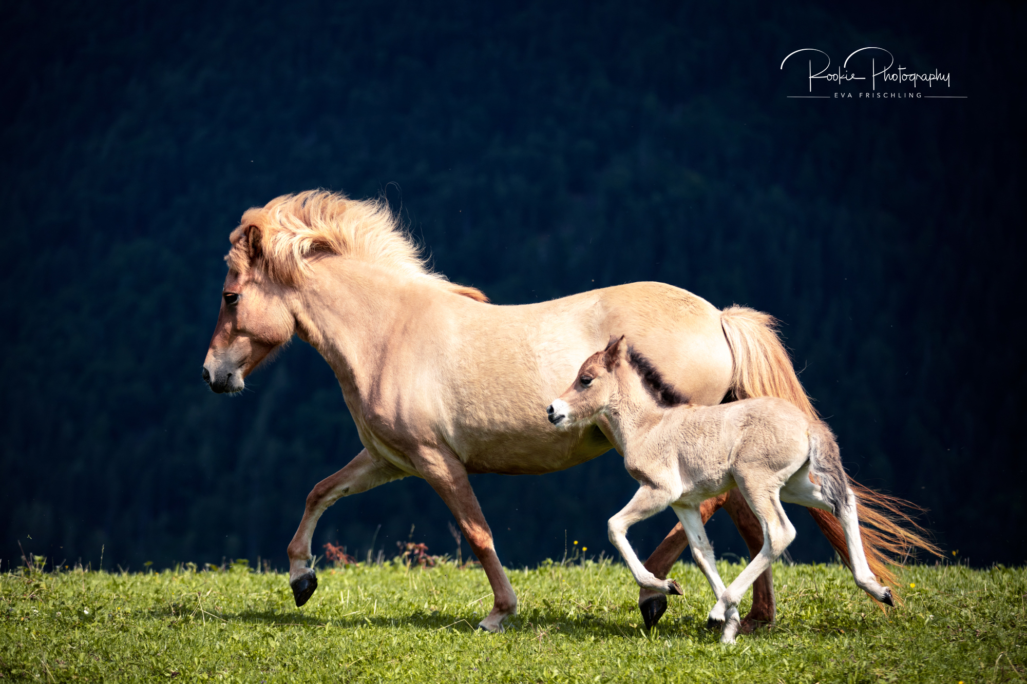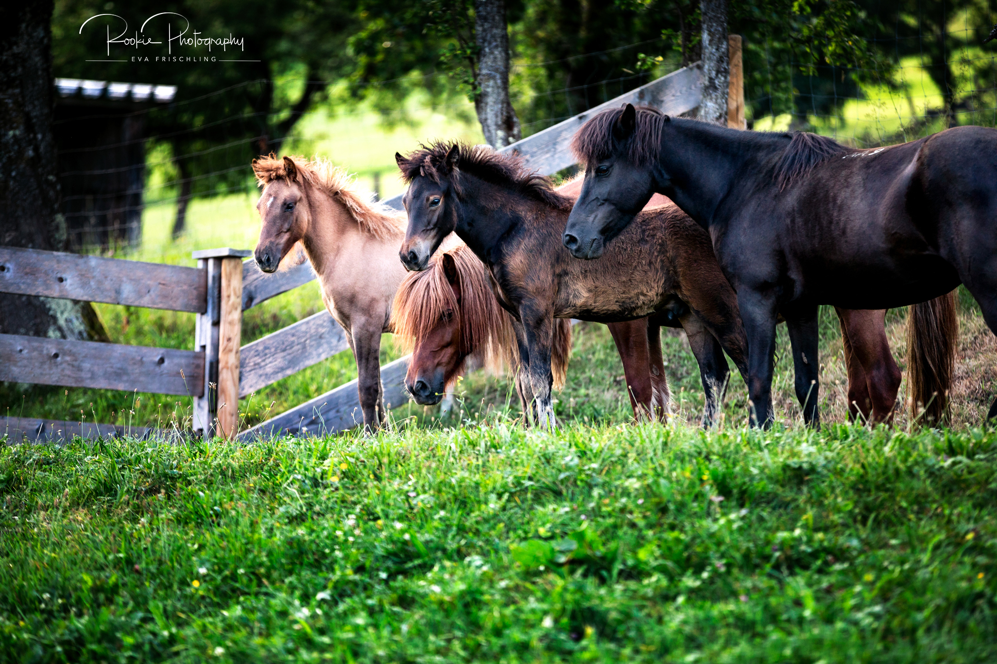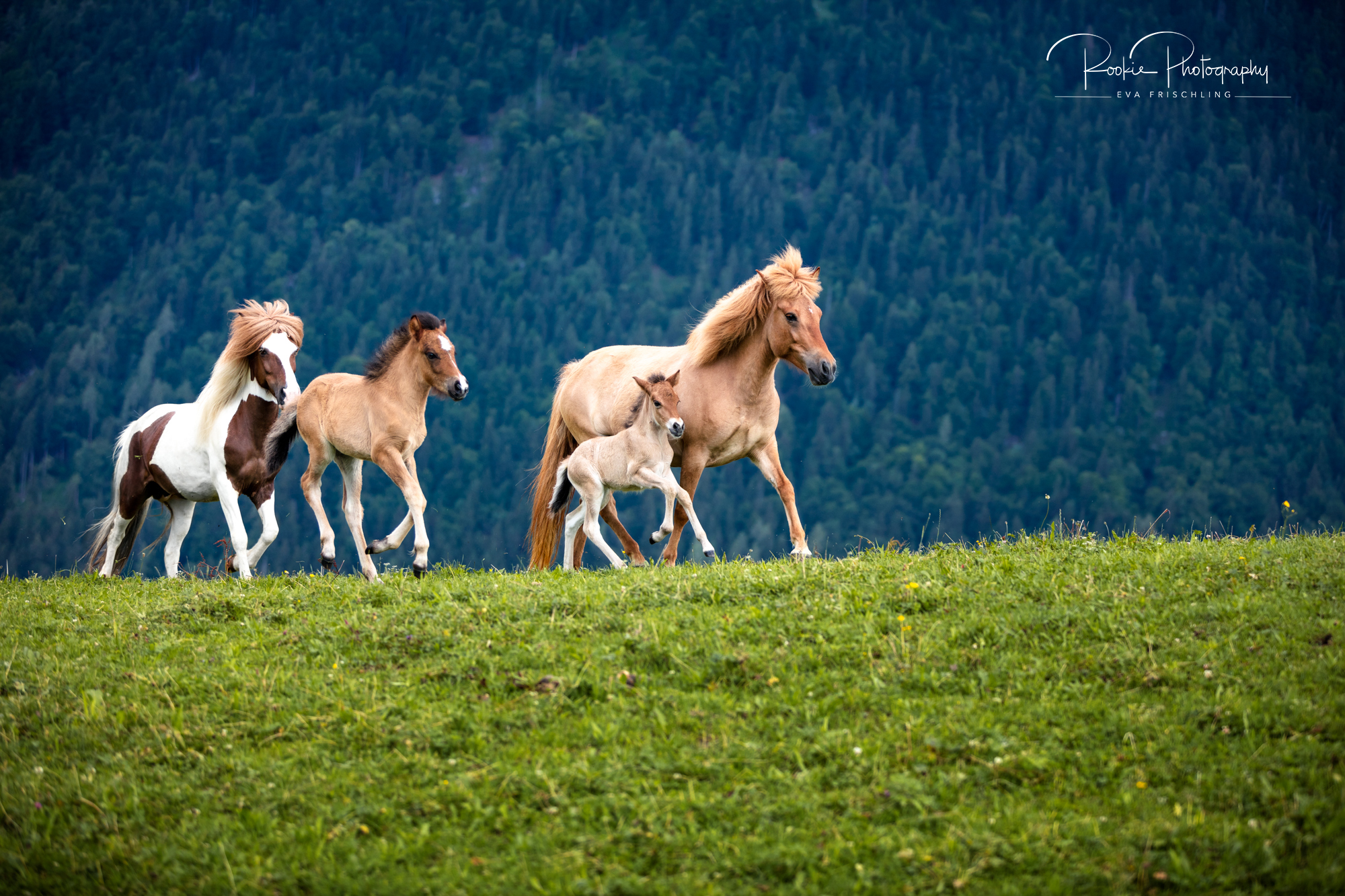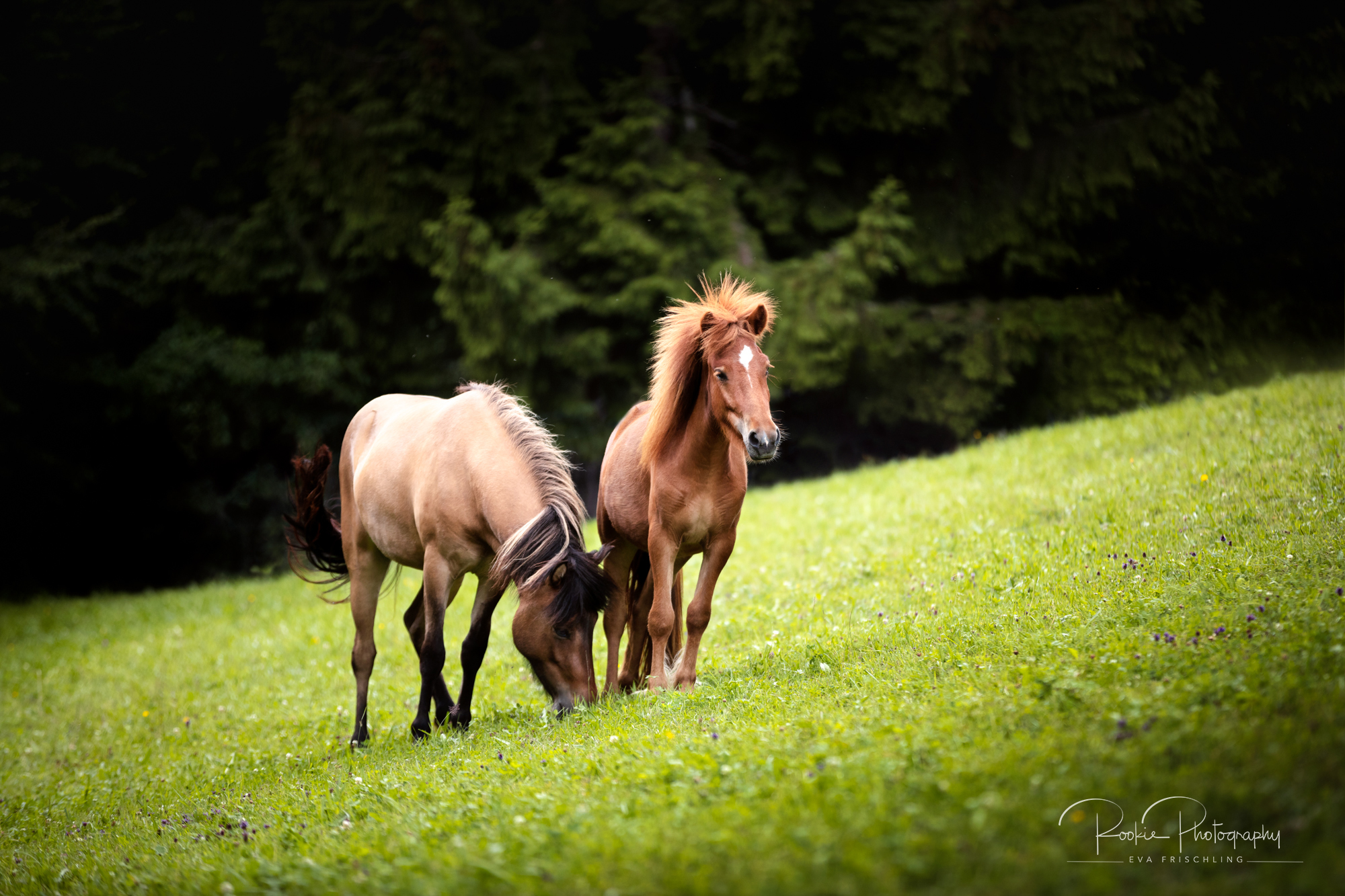 Einige der Stuten standen die ersten Wochen des Sommers auf der eigenen Alm vom Oberbichlhof. Im späten Sommer wurde Elja mit ihrem Fohlen Vindsvalur an den Stall gestellt , und die anderen beiden Stuten mit Fohlen an eine andere, super saftige Wiese gefahren. Hier machte ich noch ein paar Bilder für den Verkaufspferdekatalog.