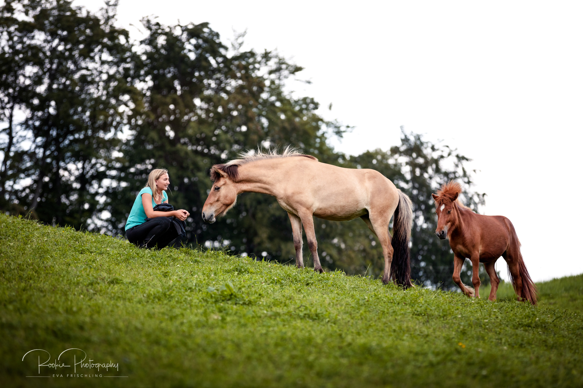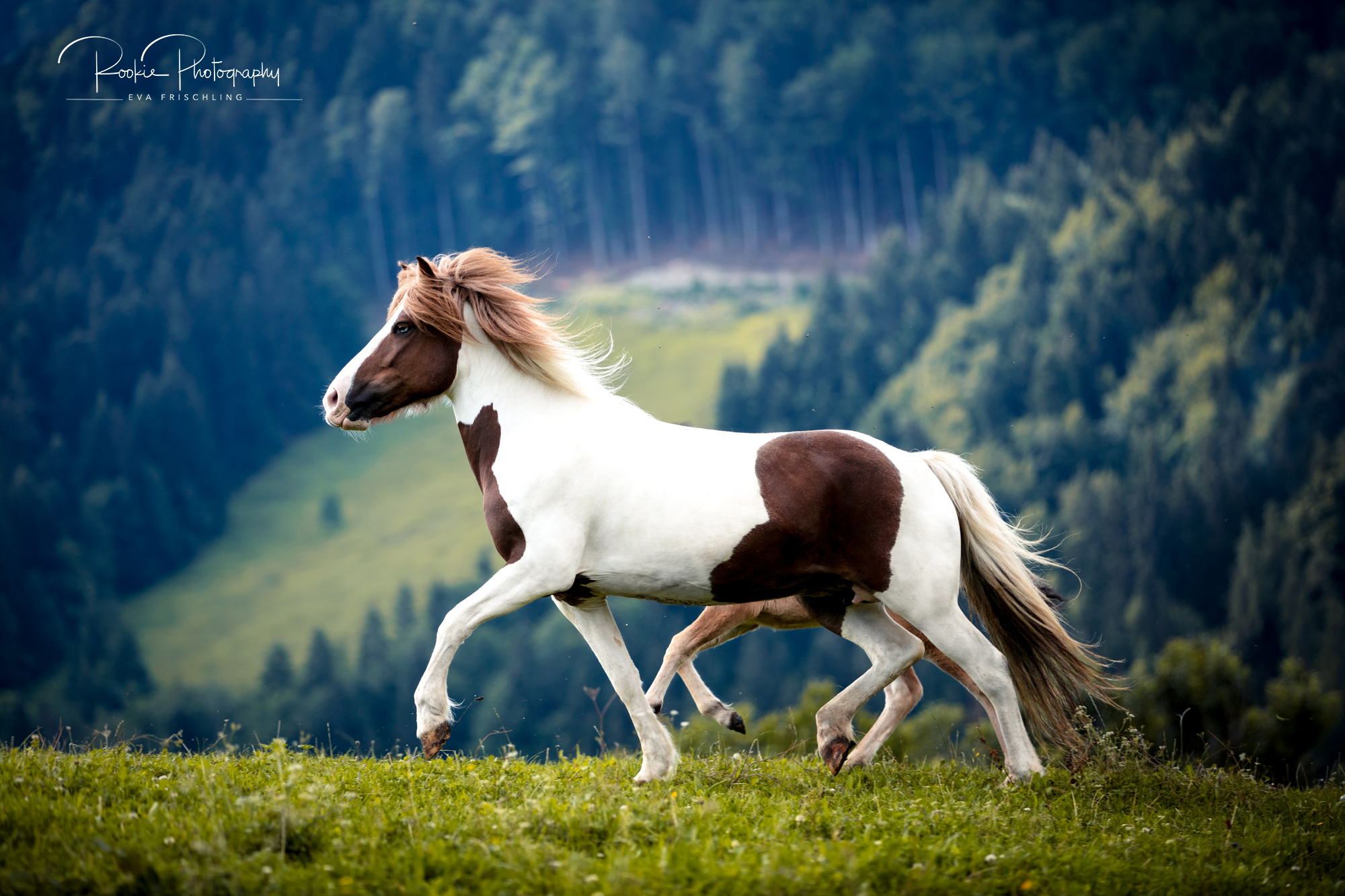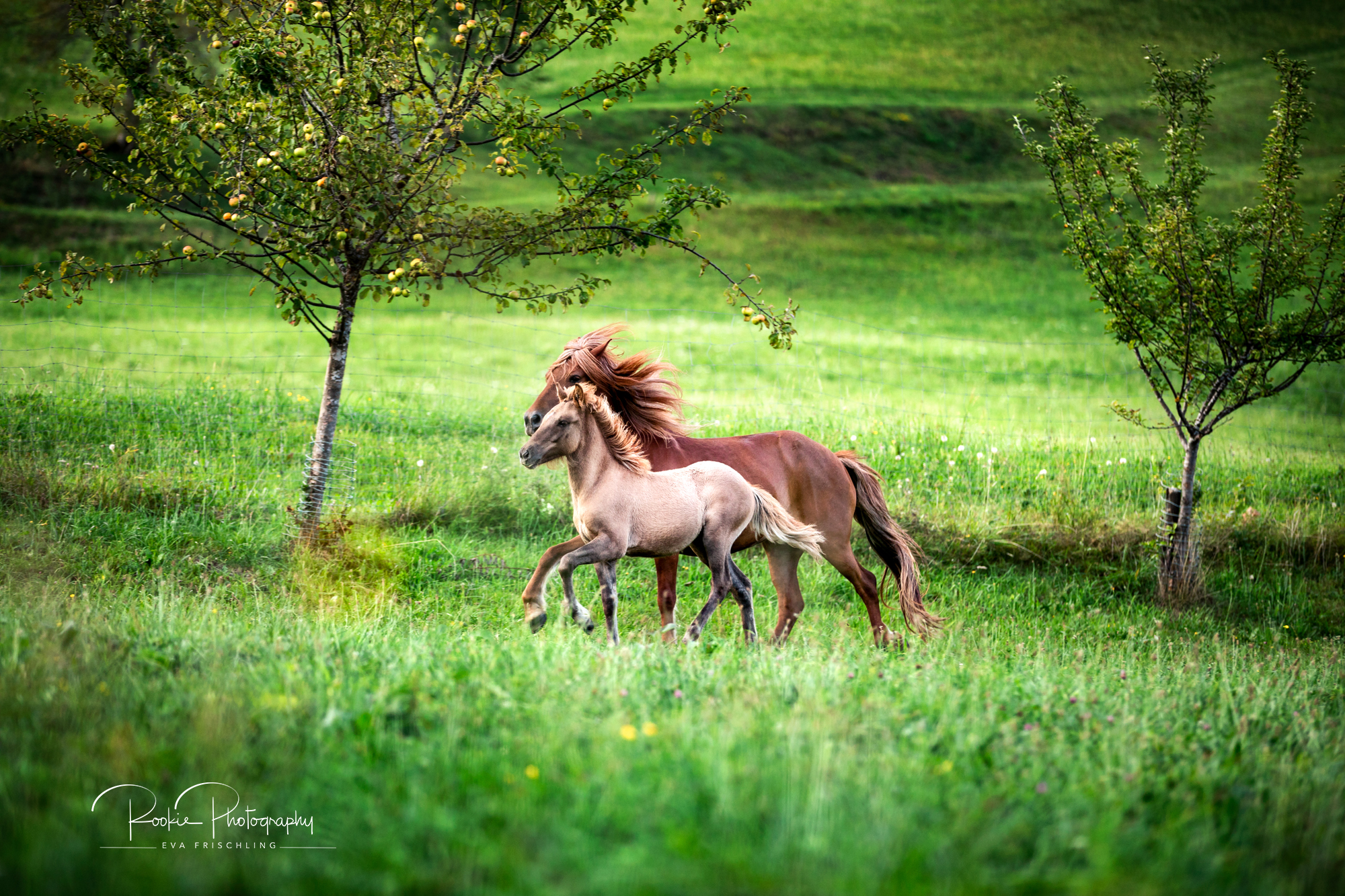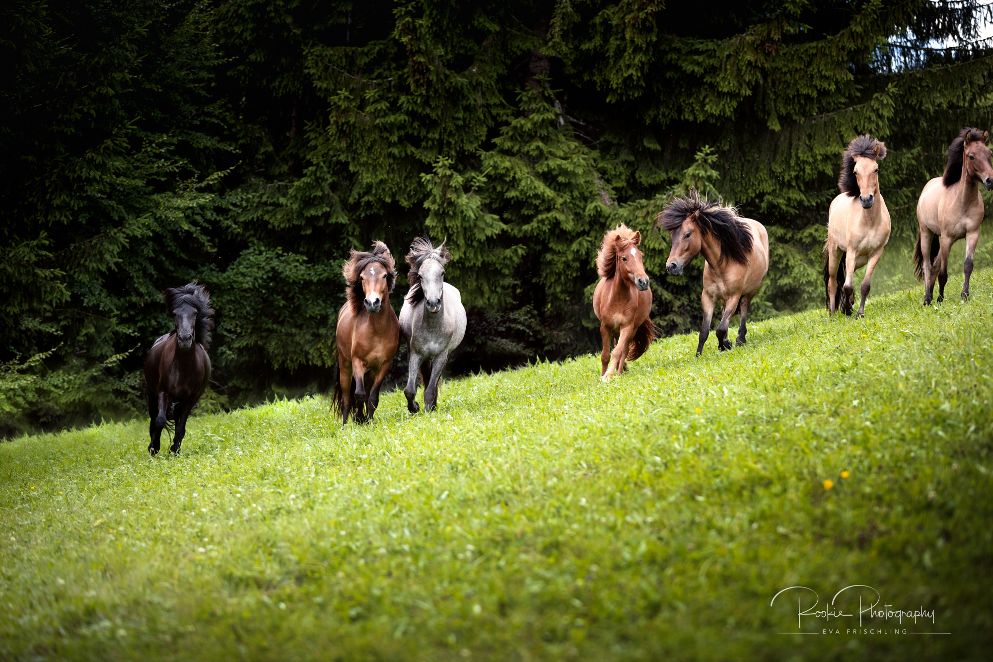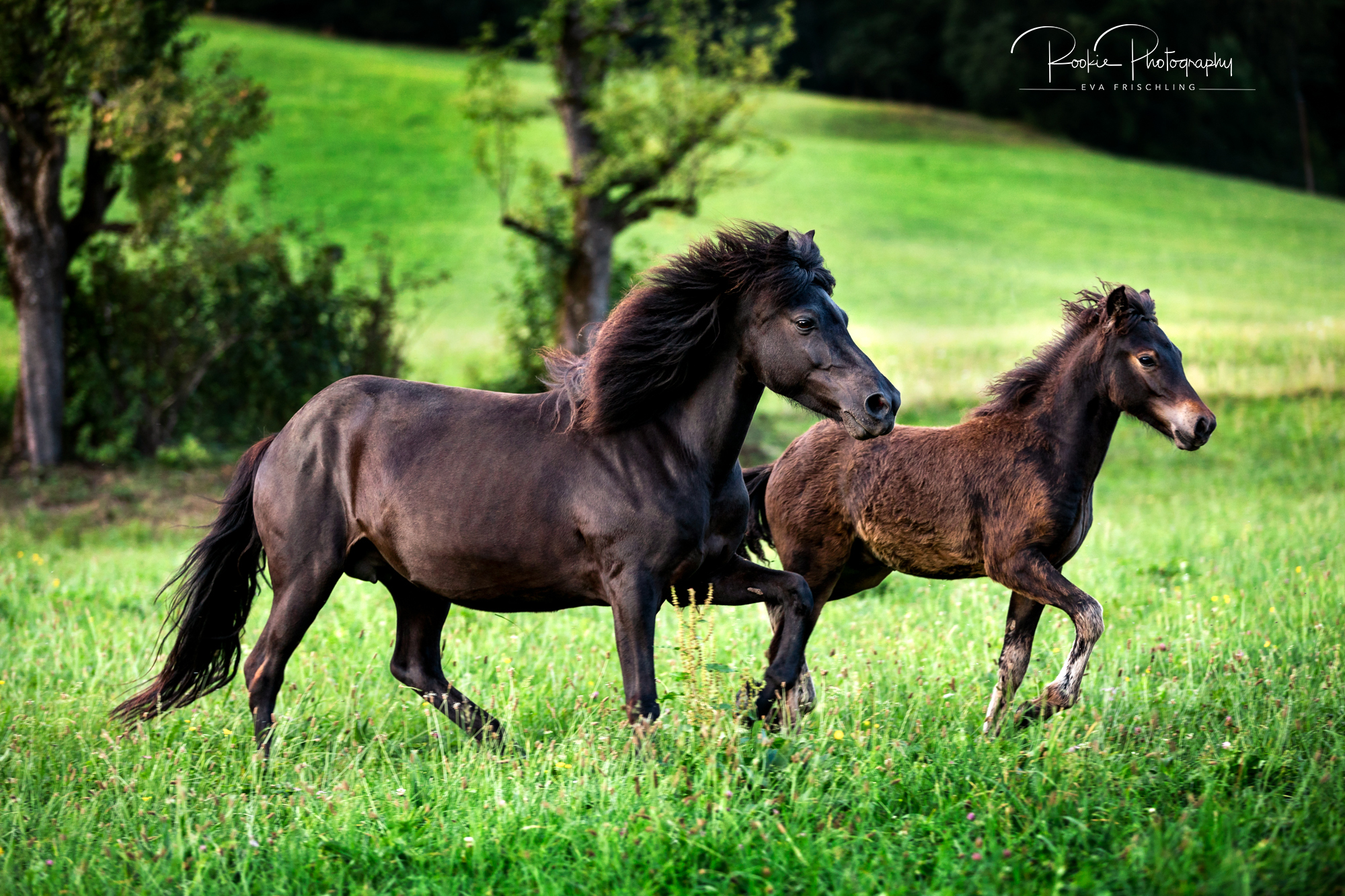 Einige der Stuten standen die ersten Wochen des Sommers auf der eigenen Alm vom Oberbichlhof. Im späten Sommer wurde Elja mit ihrem Fohlen Vindsvalur an den Stall gestellt , und die anderen beiden Stuten mit Fohlen an eine andere, super saftige Wiese gefahren. Hier machte ich noch ein paar Bilder für den Verkaufspferdekatalog.