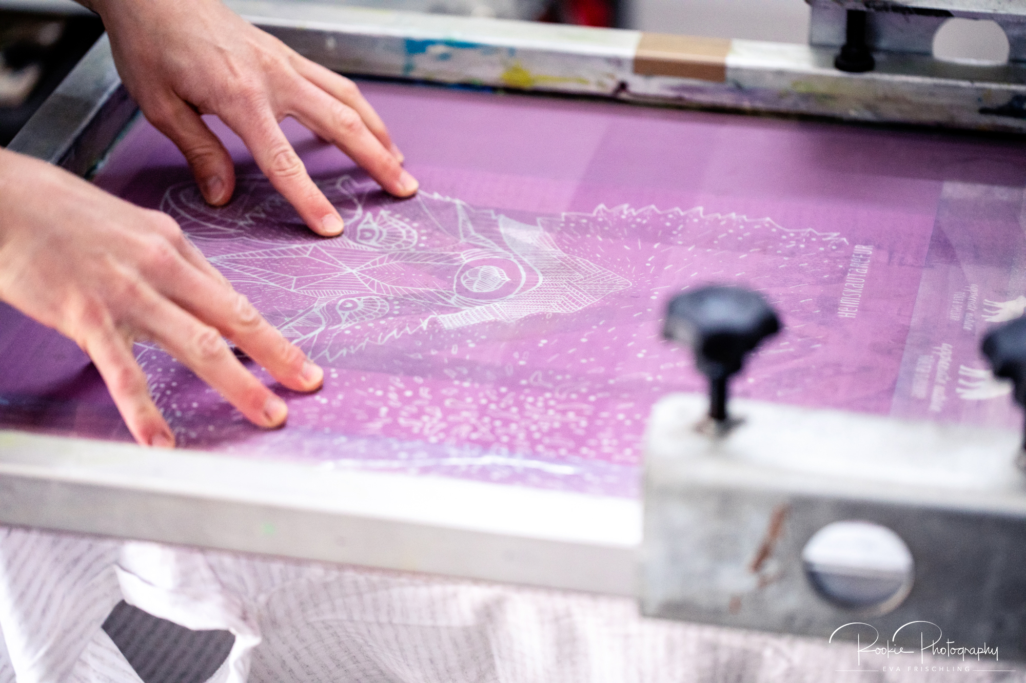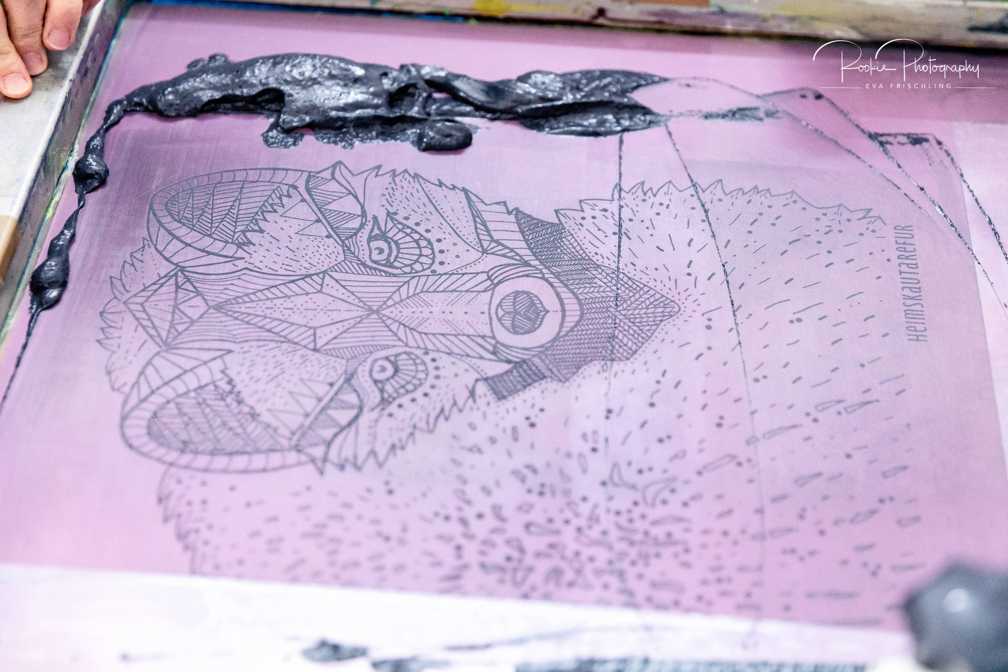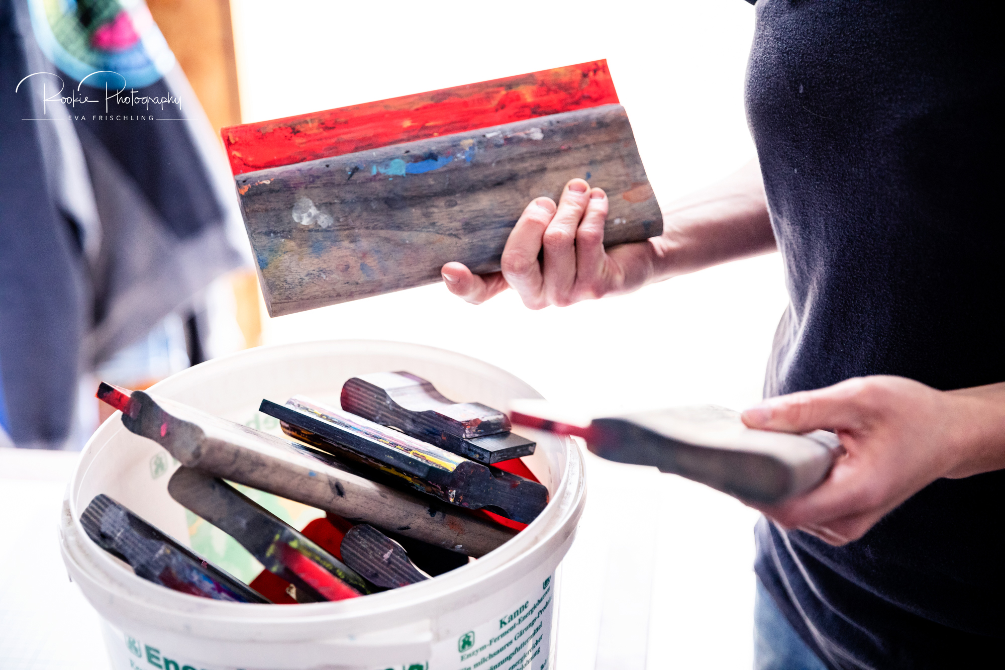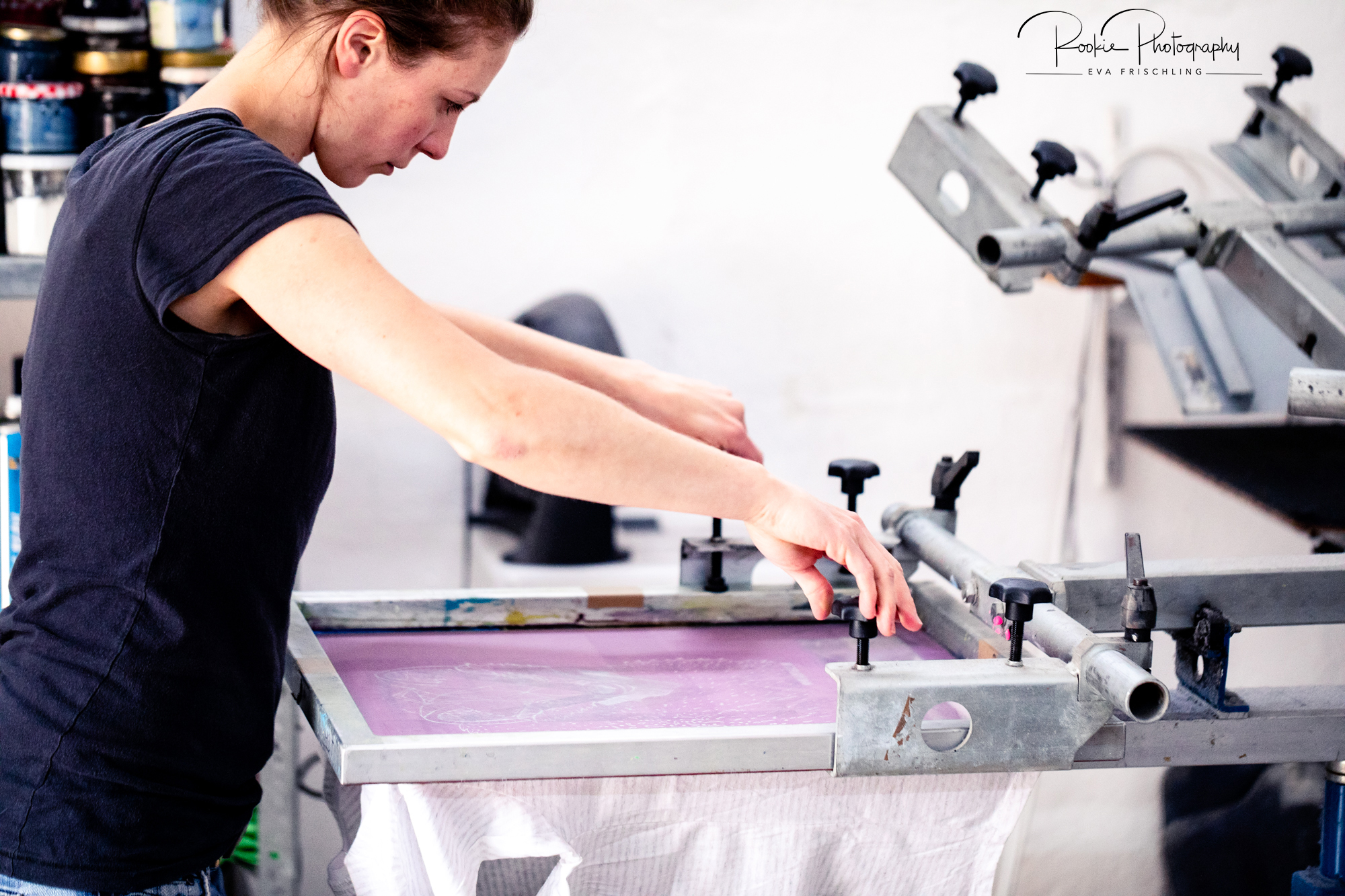 Am nächsten Tag stand dann auch schon das nächste Shooting an: denn Sabrina, die Inhaberin von Tölta Deluxe, wollte noch ein paar Bilder in der Werkstatt während des Arbeitens machen. Unter anderem benötigt sie diese Bilder für die kommenden Siebdruck-Workshops. Also suchten wir uns ein schönes Shirt, ein noch schöneres Motiv, und los ging es: