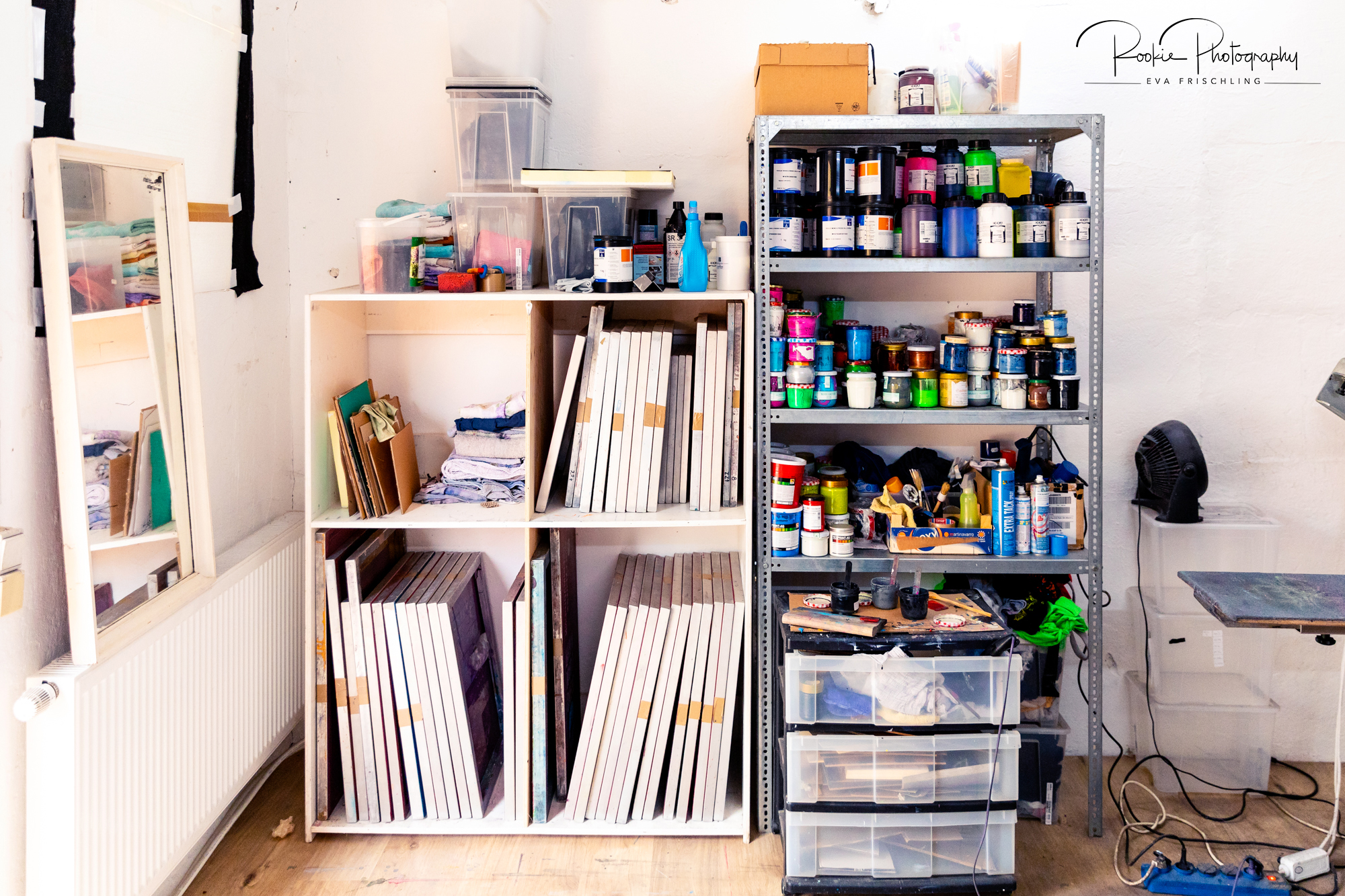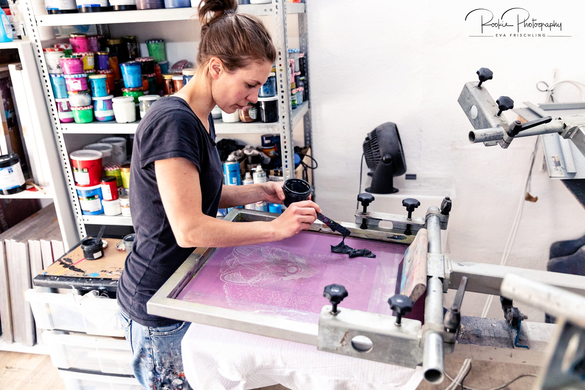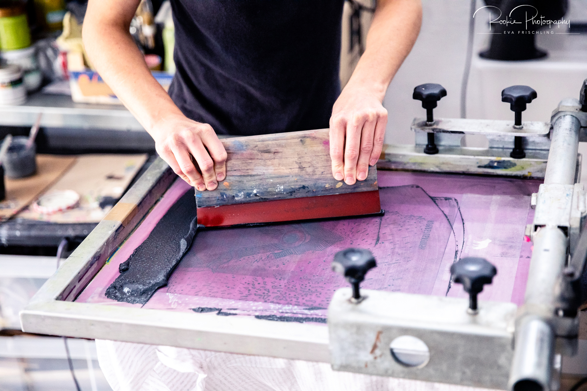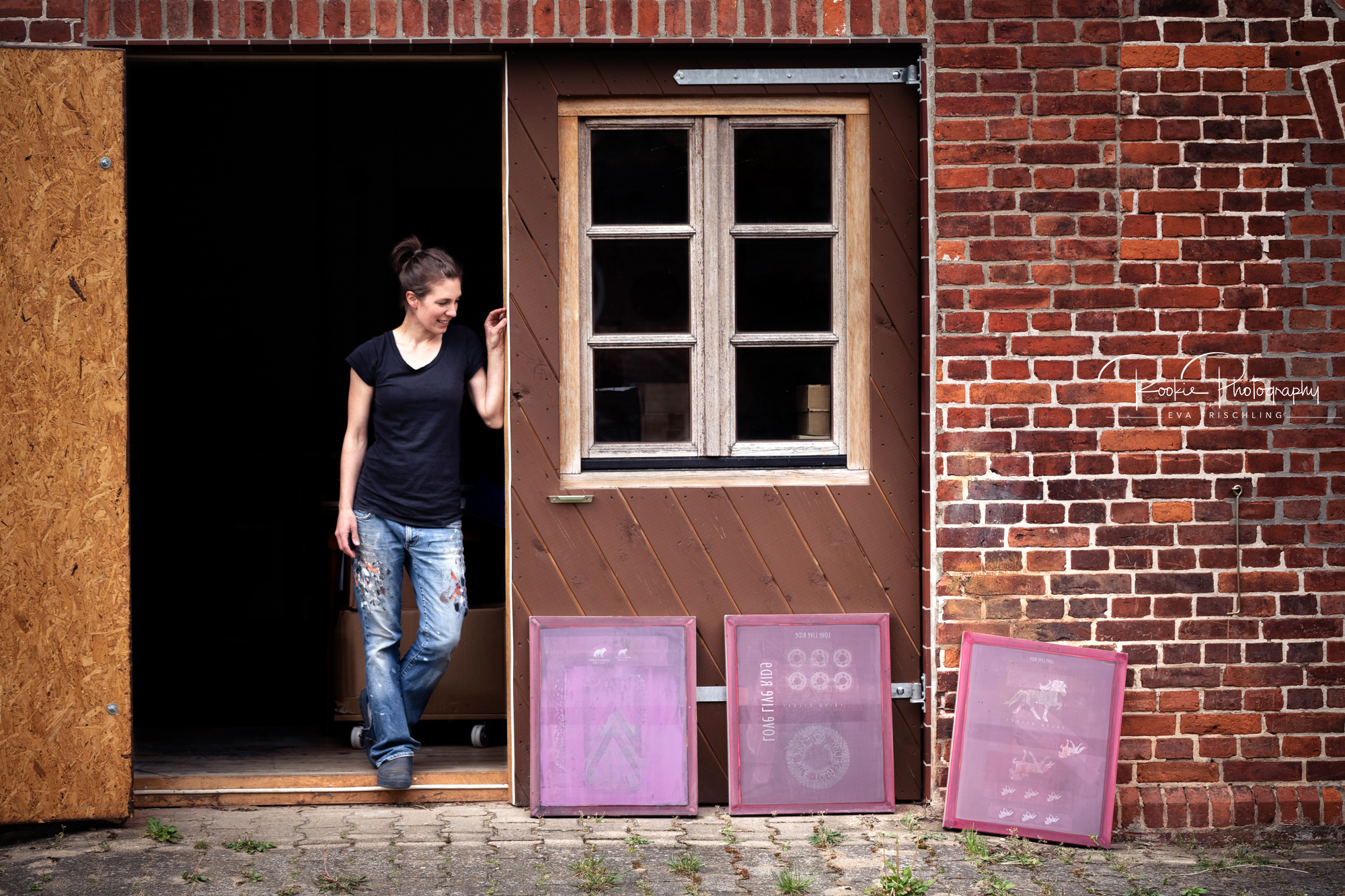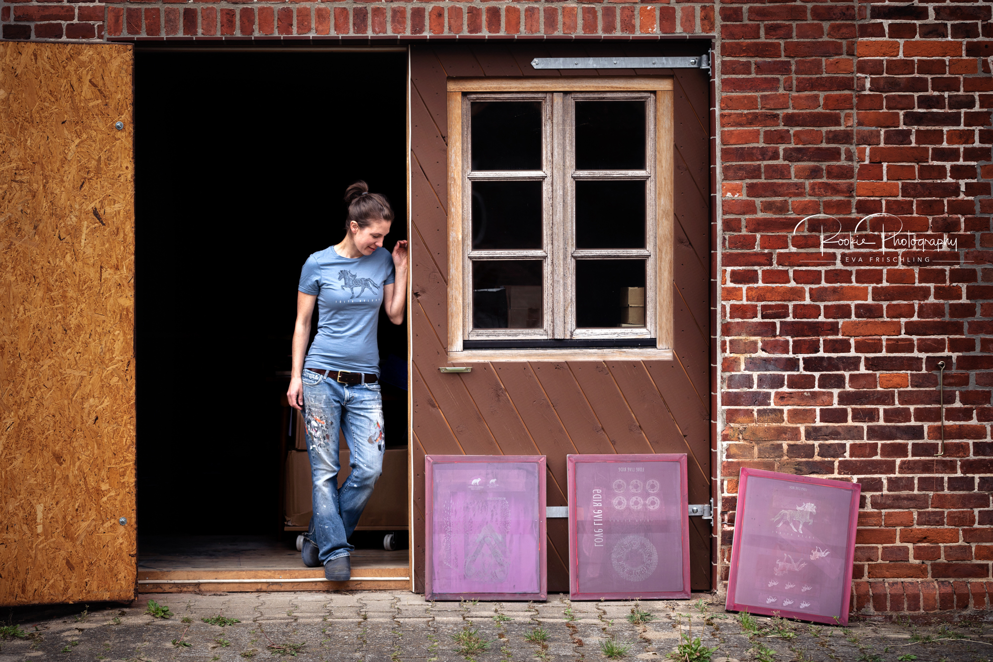 Am nächsten Tag stand dann auch schon das nächste Shooting an: denn Sabrina, die Inhaberin von Tölta Deluxe, wollte noch ein paar Bilder in der Werkstatt während des Arbeitens machen. Unter anderem benötigt sie diese Bilder für die kommenden Siebdruck-Workshops. Also suchten wir uns ein schönes Shirt, ein noch schöneres Motiv, und los ging es: