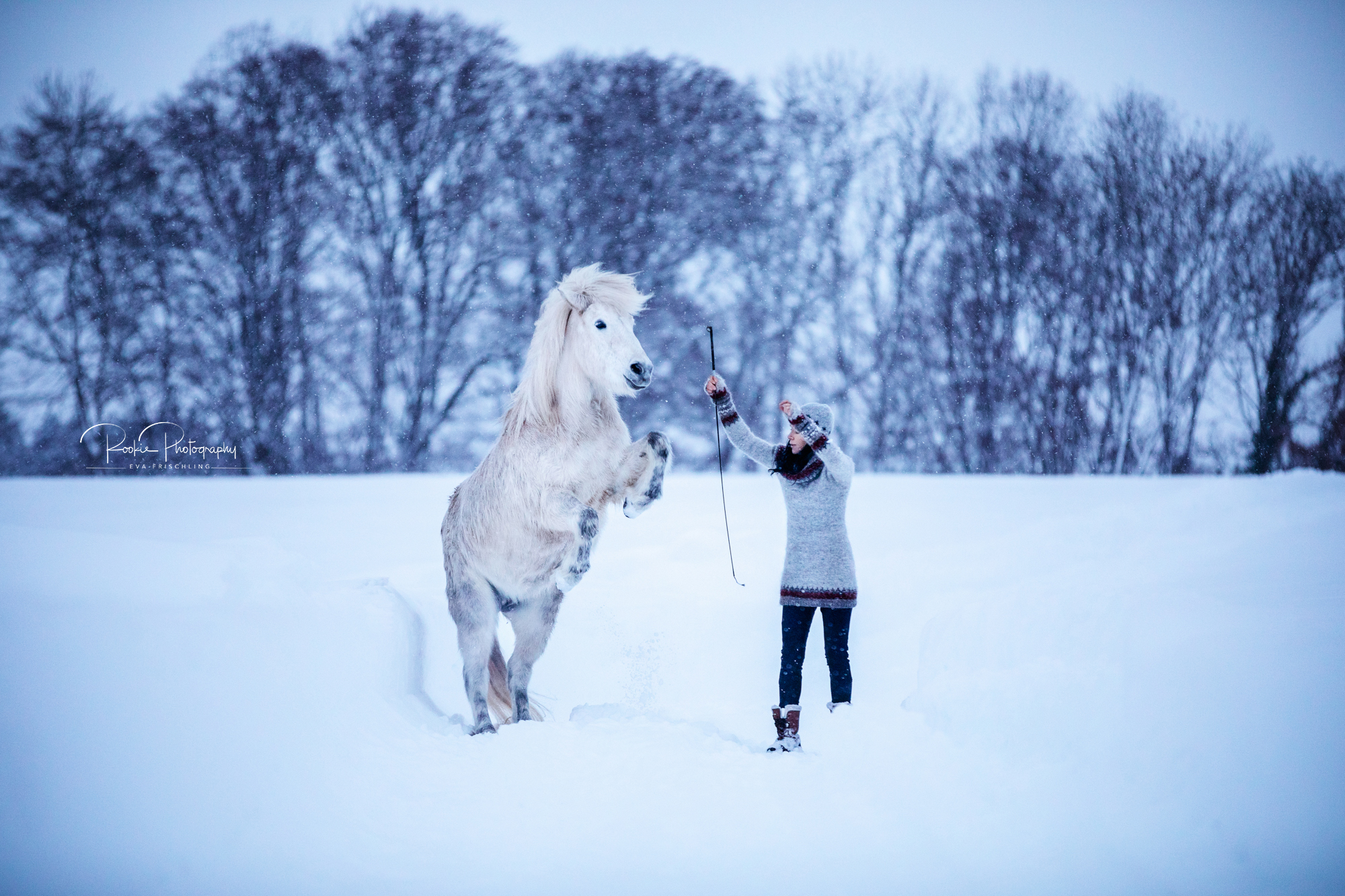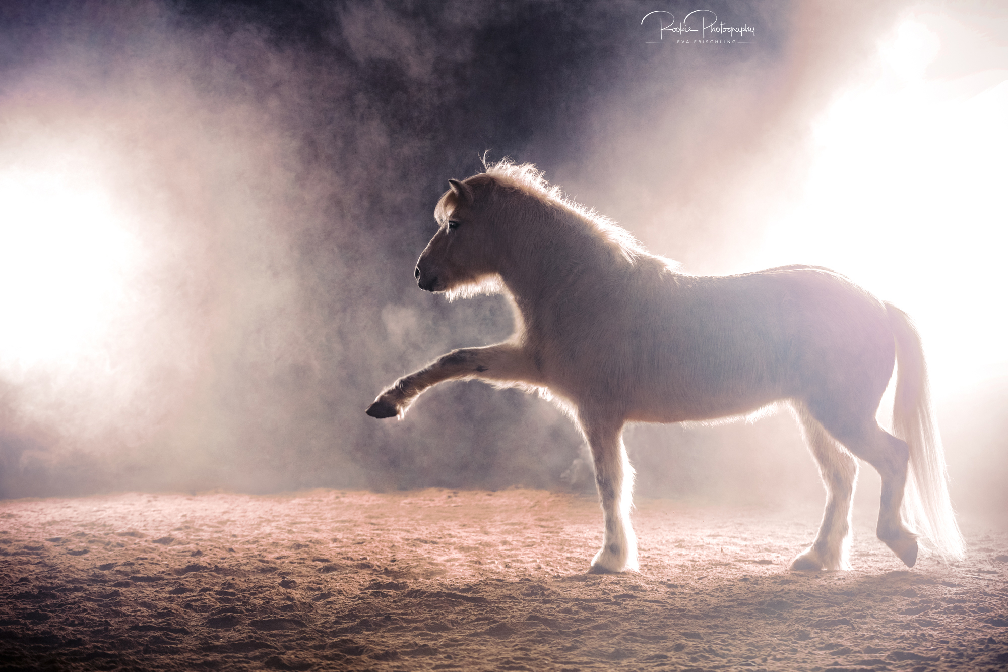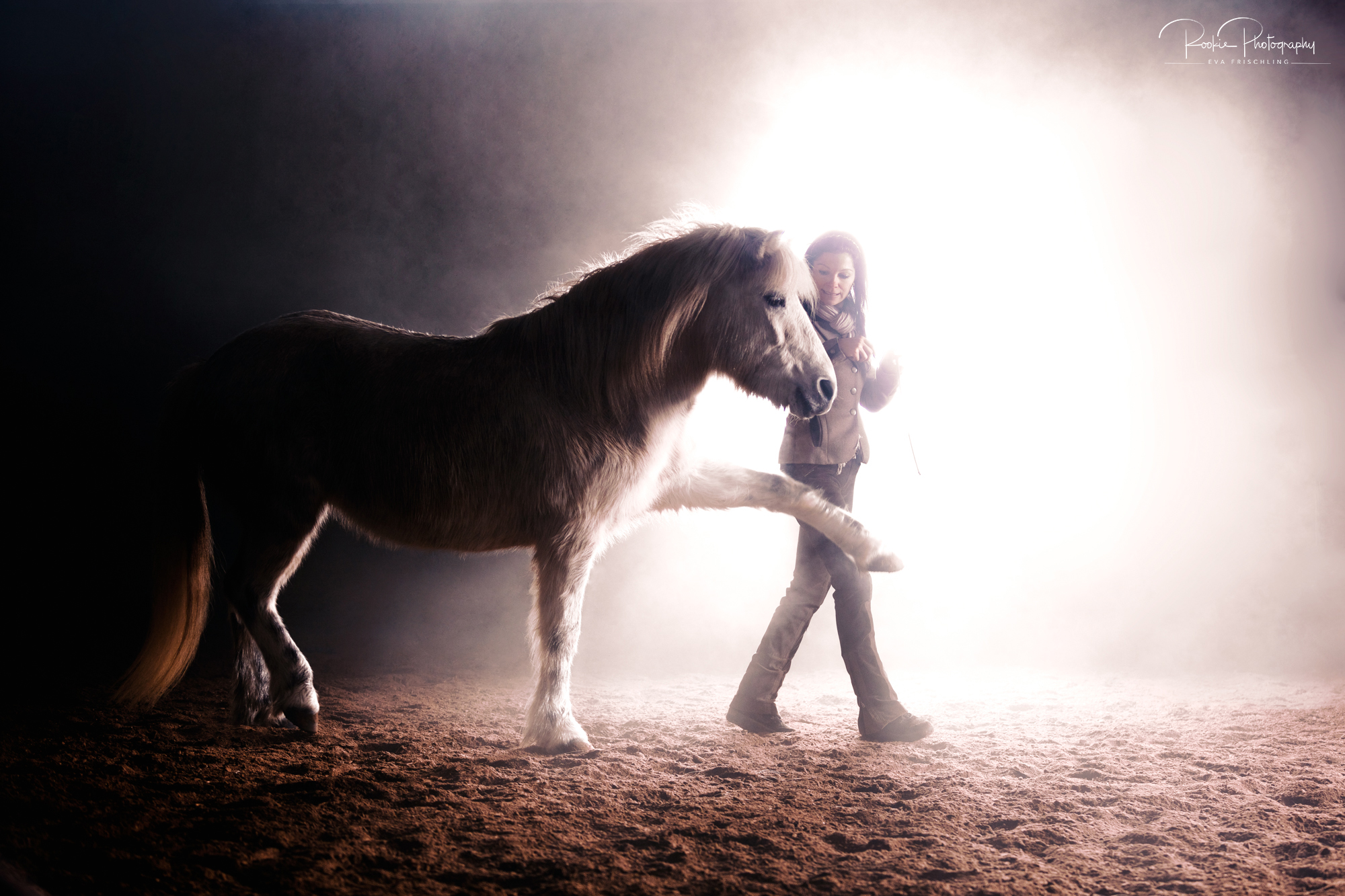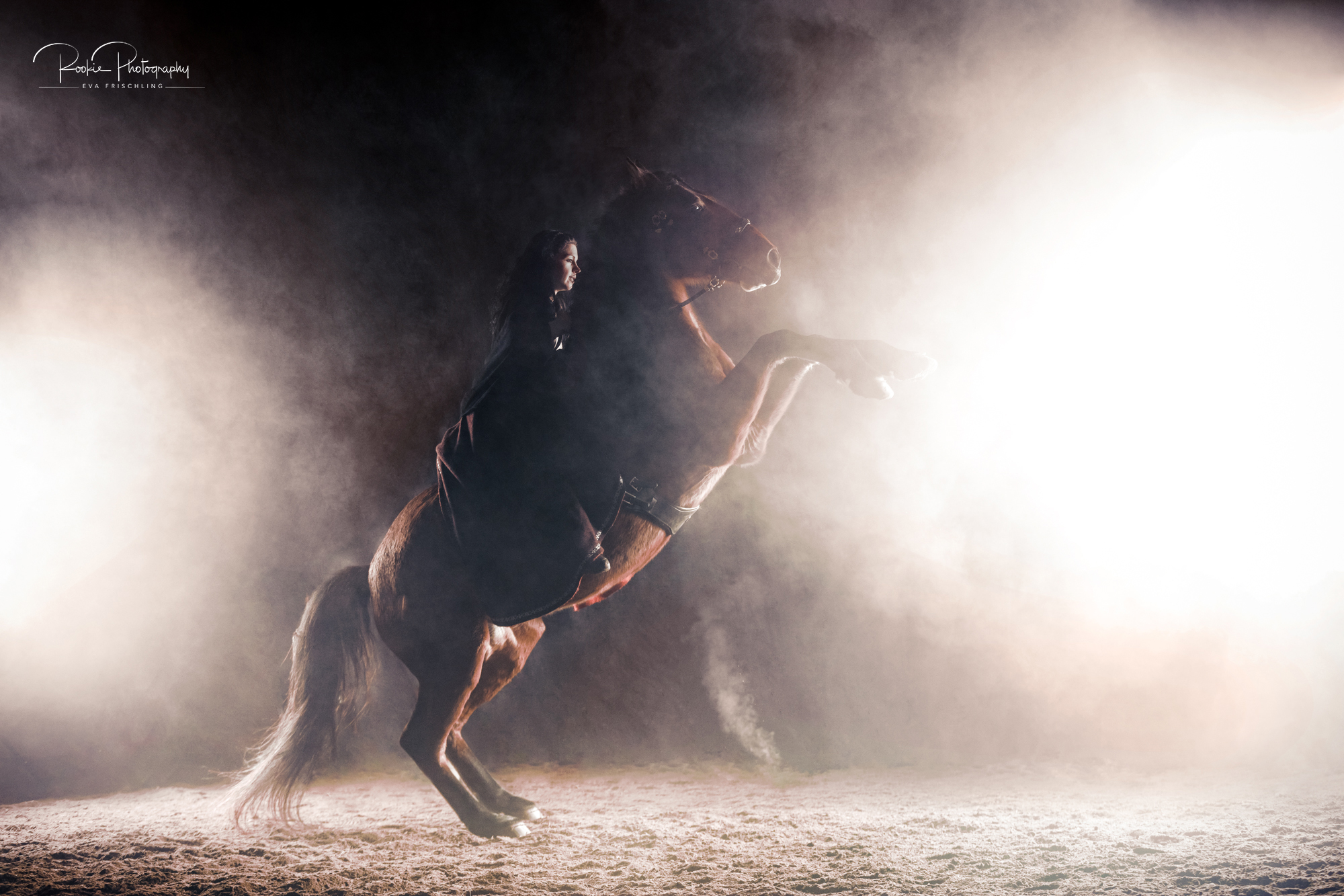 Unser Plan war, mit Rauchbomben und dem Studiolicht zu arbeiten. Ich vermute mal, dass 90% aller Pferde dabei durchgedreht wären, denn das ist eine riesen Herausforderung für die Tiere. Aber was soll man sagen – Rufino und Fjola war das beinahe egal. Zwei so coole Socken!