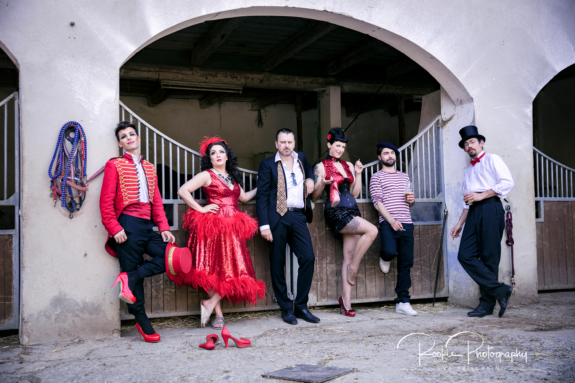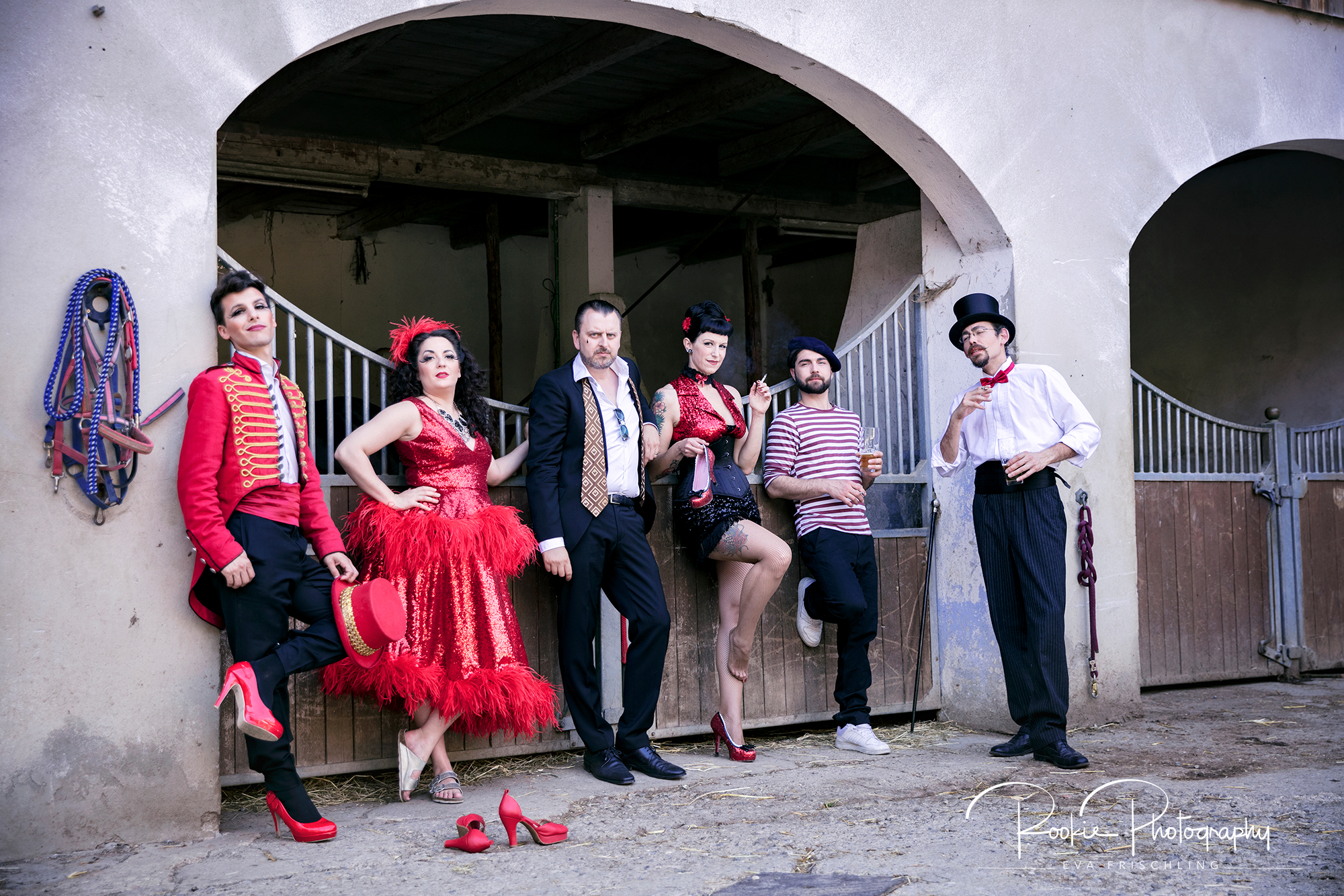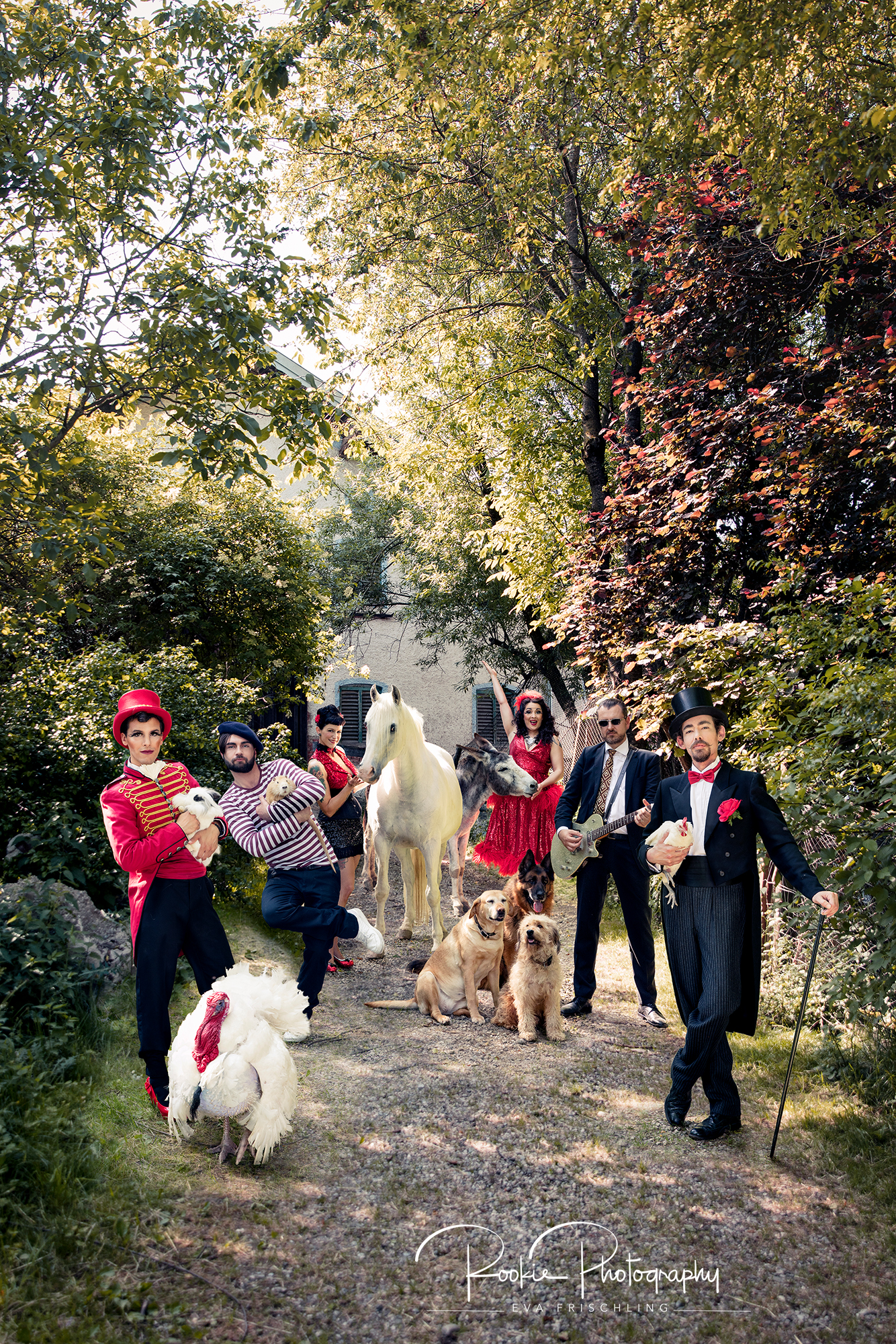 Jul, der Organisator, (der mit dem Hühnchen,) gab mir zwei Motive vor, die er gerne hätte. Einmal ein Hochformat Bild, auf dem alle sechs Mitglieder gemeinsam mit verschiedensten Tieren oben sind und posieren, und als Zweites ein Bild mit Eiffelturm im Hintergrund, ebenfalls mit Tieren. Und dann noch „was sich eben so ergibt-Bilder“.
