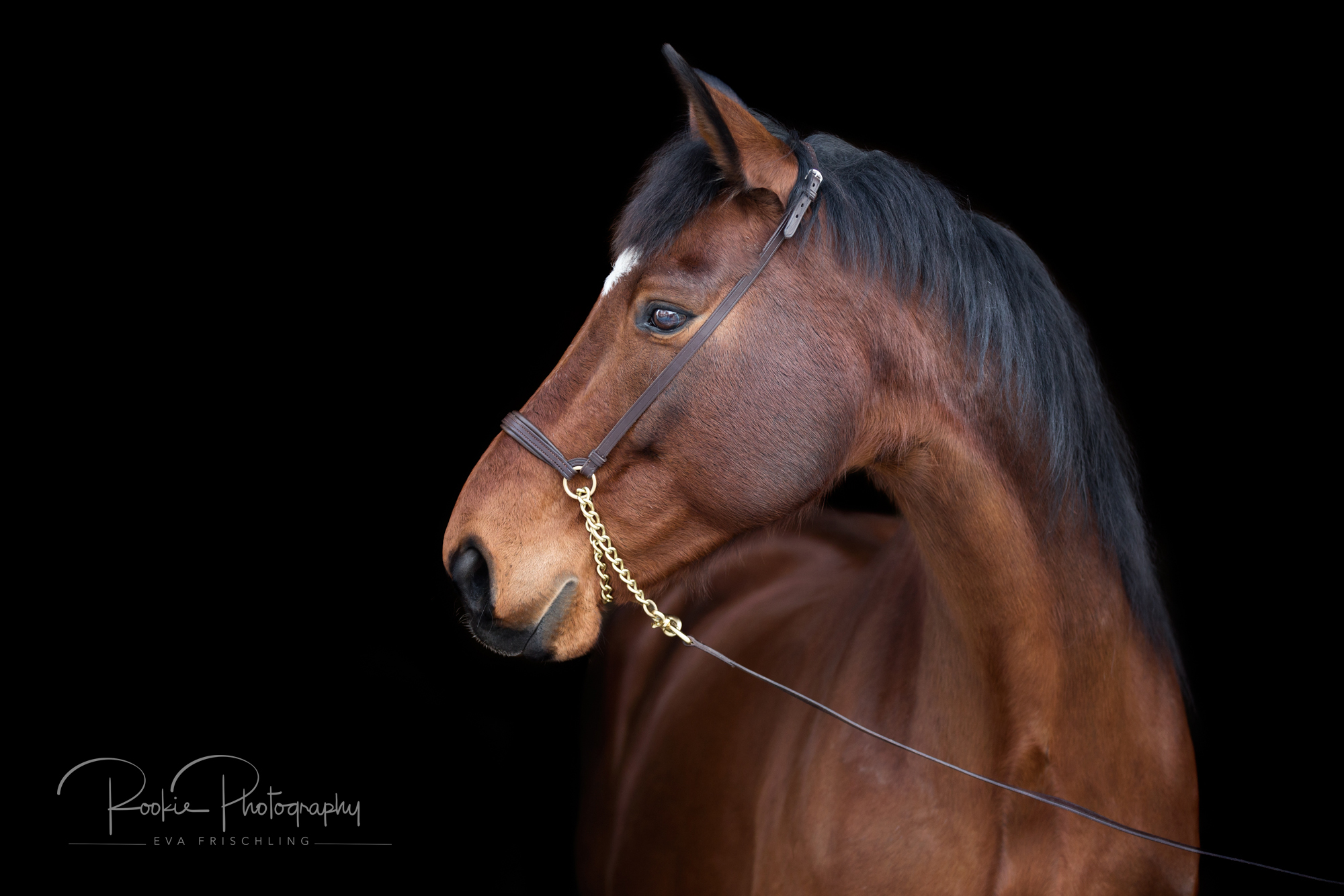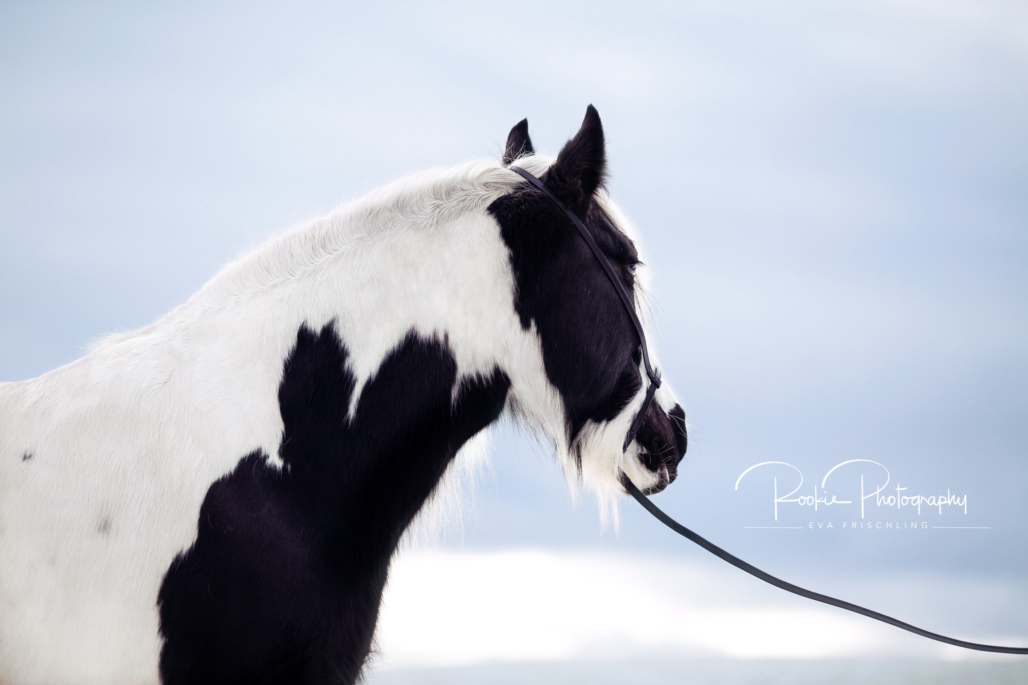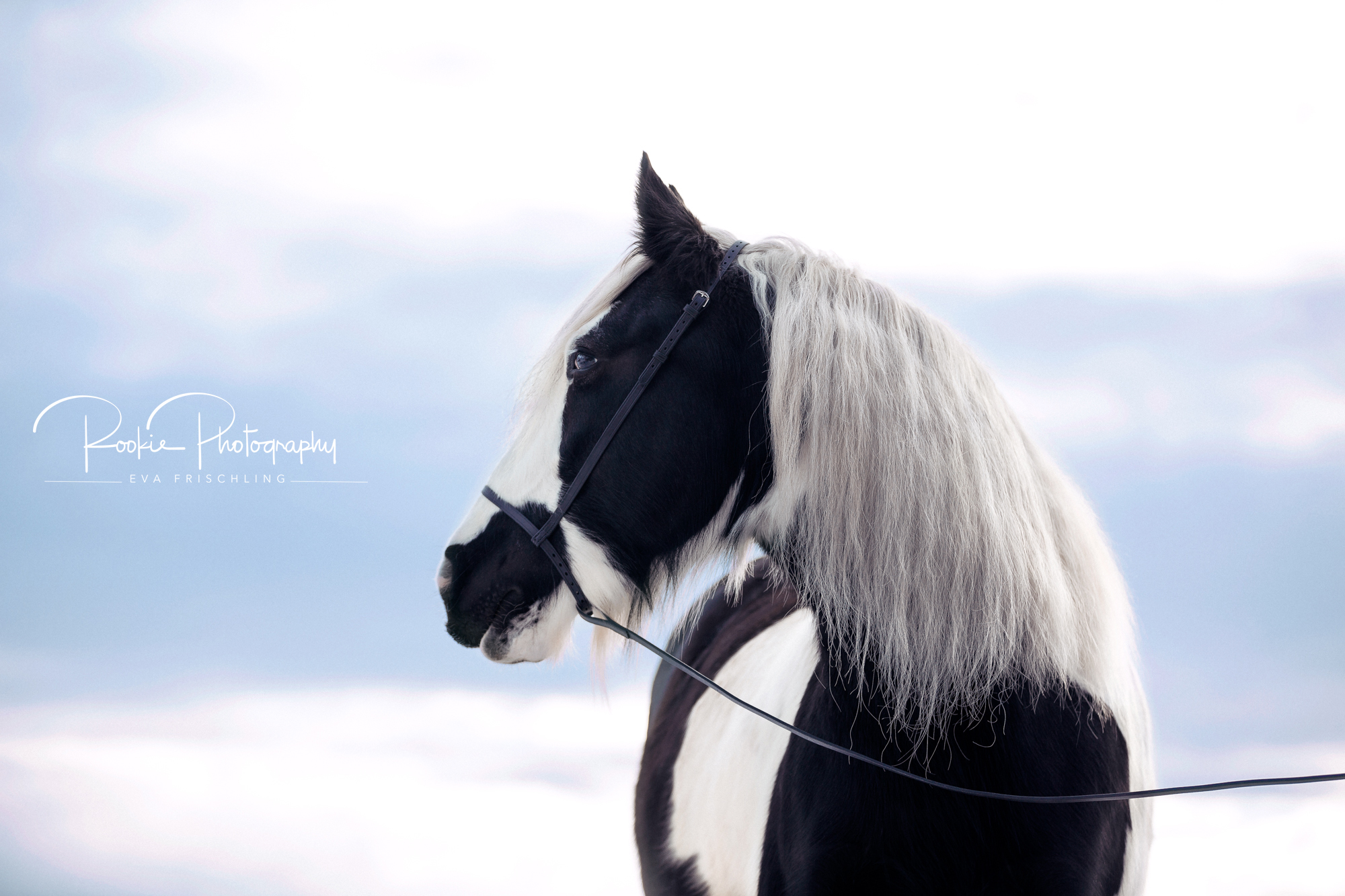 Wie gesagt standen als erstes Pferde im Portrait. Wir hatten eine Scheckstute, einen braunen Wallach und eine Rappstute. Für die Scheckstute wählten wir einen blauen Himmel als Hintergrund, den Braunen fotografierten wir im Scheunentor, damit wir einen schwarzen Hintergrund bekommen, und die Rappstute gab es vor dunklem, grünen Wald.