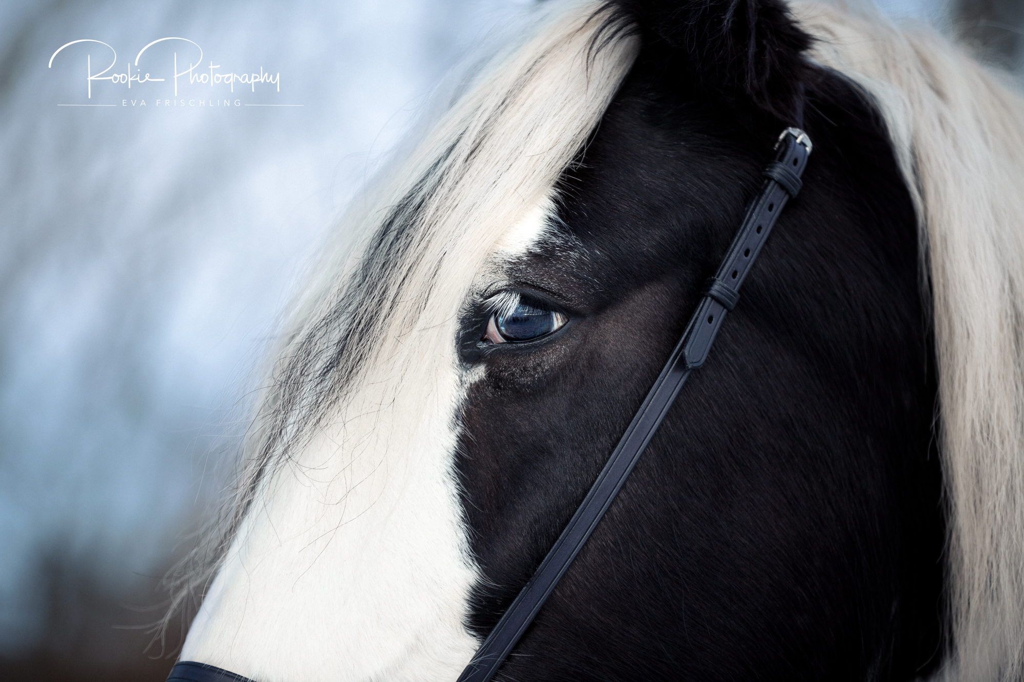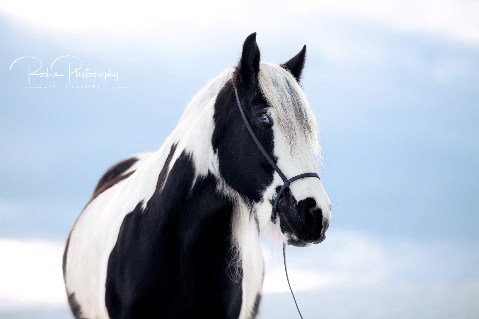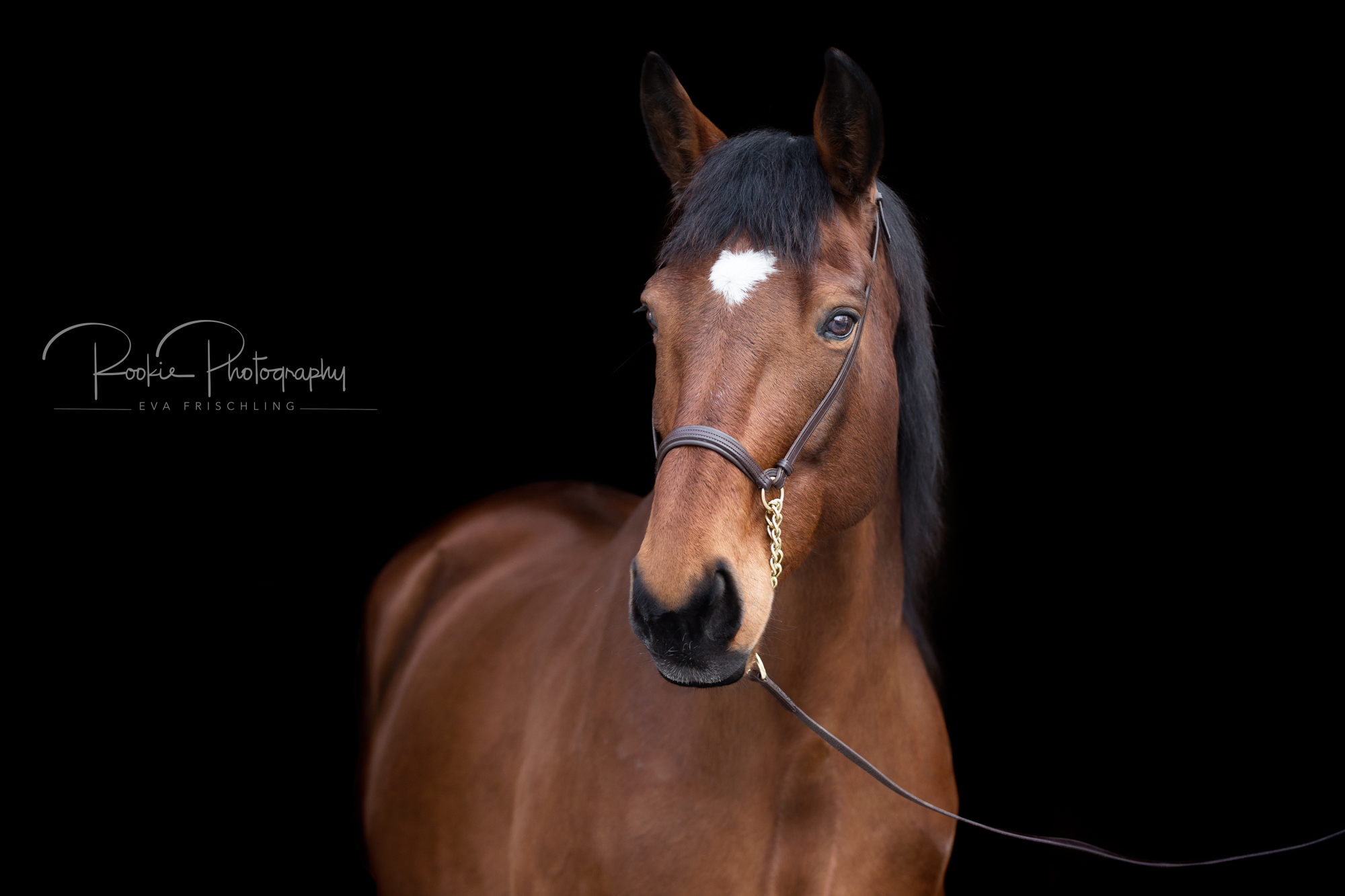 Wie gesagt standen als erstes Pferde im Portrait. Wir hatten eine Scheckstute, einen braunen Wallach und eine Rappstute. Für die Scheckstute wählten wir einen blauen Himmel als Hintergrund, den Braunen fotografierten wir im Scheunentor, damit wir einen schwarzen Hintergrund bekommen, und die Rappstute gab es vor dunklem, grünen Wald.