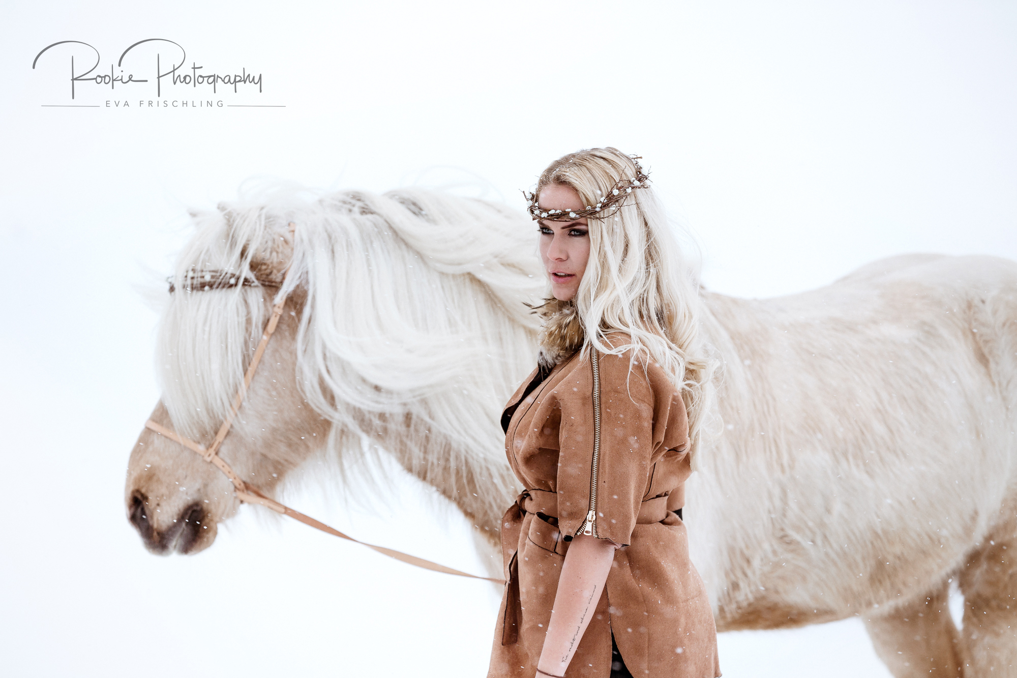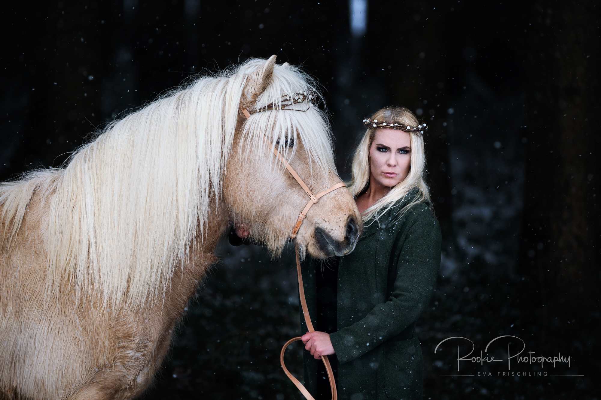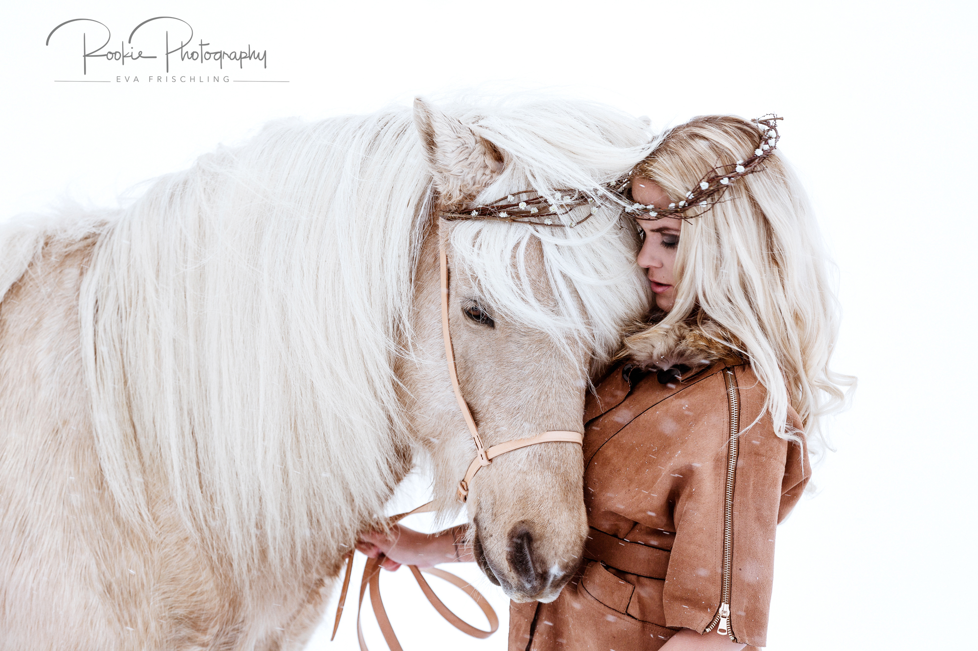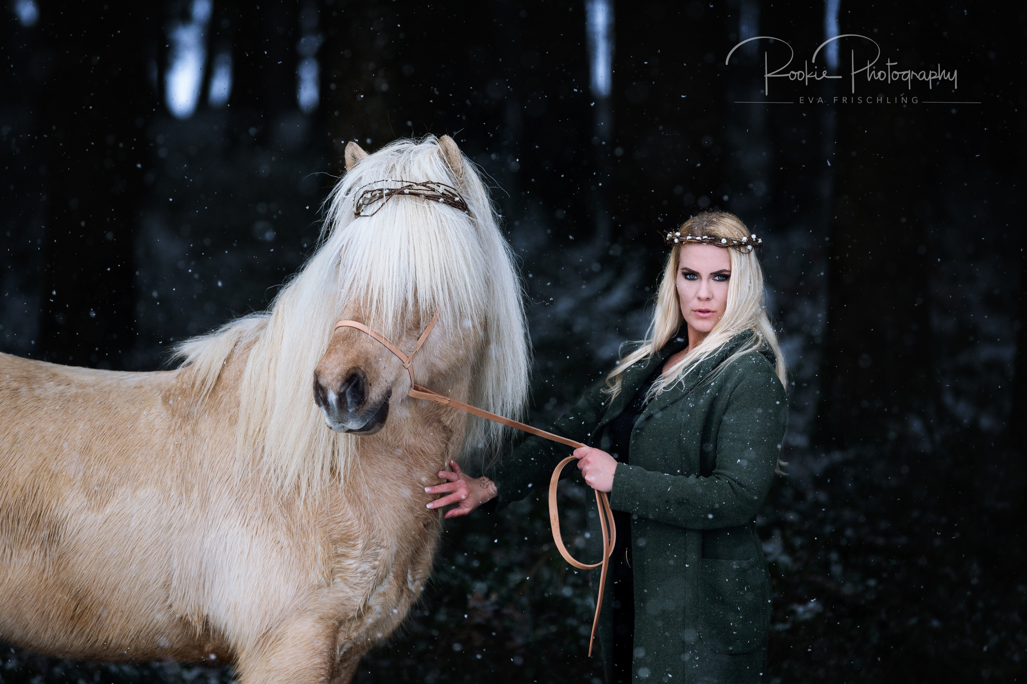 Wie oben schon geschrieben hatten wir ein Model: Sabrina, ein Pferd: Soli, eine Visa: Lydia, und Blumenschmuck von Michaela. Wir suchten gemeinsam eine Location aus. Ich hatte in etwa im Kopf, dass wir ein ganz helles Bild machen, am Besten mit Schnee im Hintergrund, und ein etwas dunkleres. Wir suchten dann gemeinsam eine Location aus und fotografierten die zwei Schönheiten zuerst im Schnee, und dann noch bei einem Waldstück. Wir hatten für dieses Bilder einfach tolles Wetter, denn es schneite leicht. So bekamen wir eine tolle Atmosphäre in den Bildern: