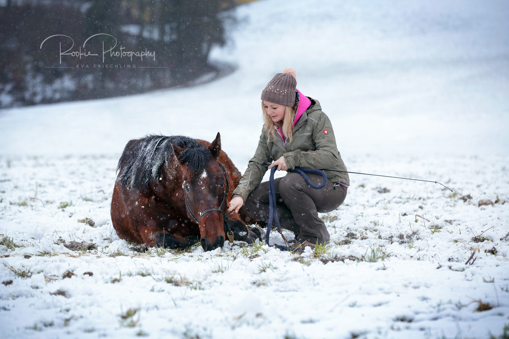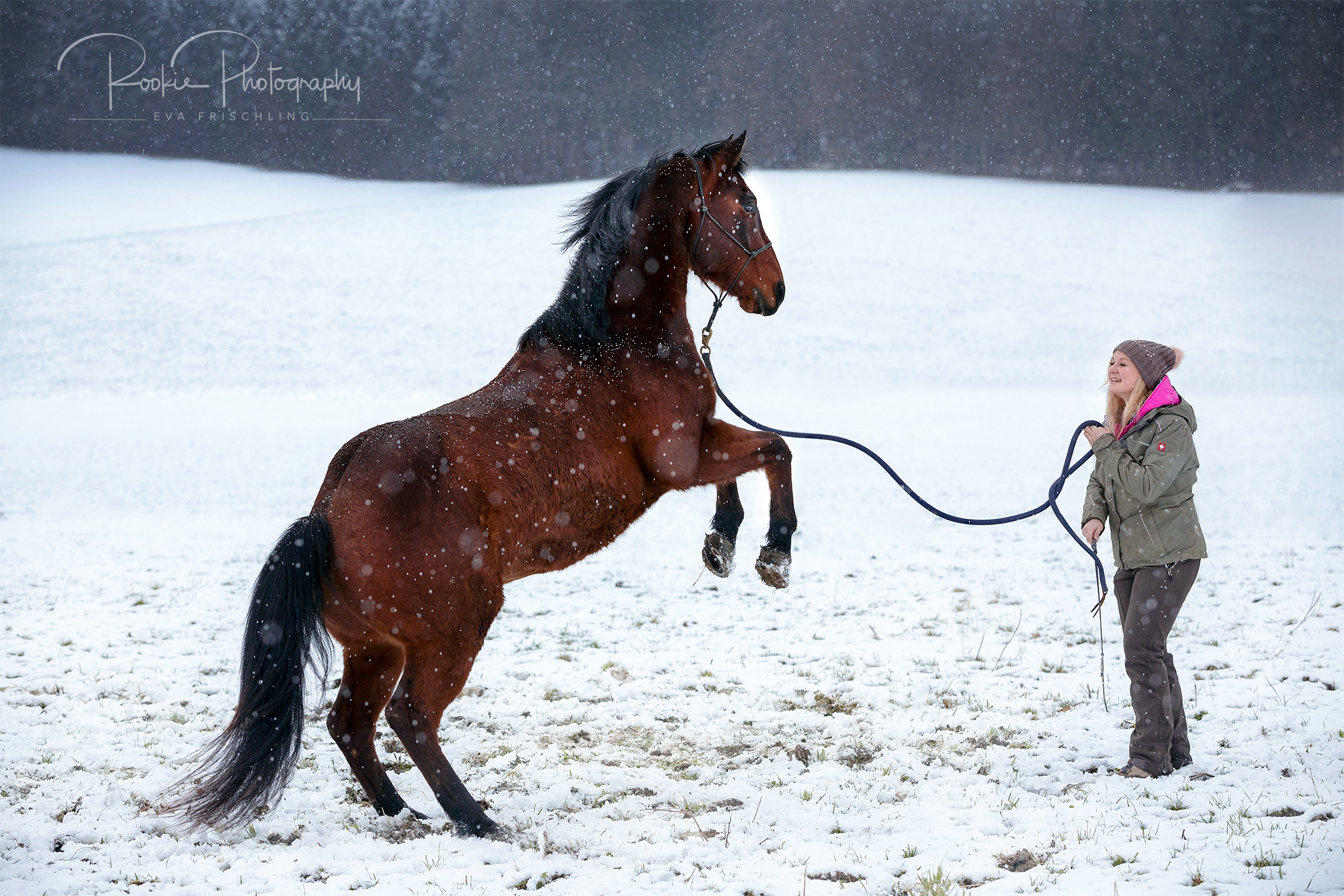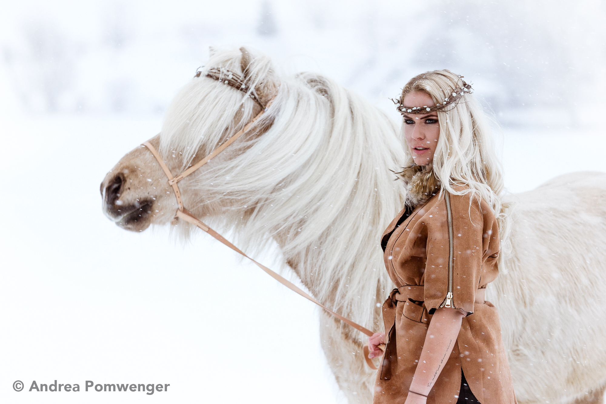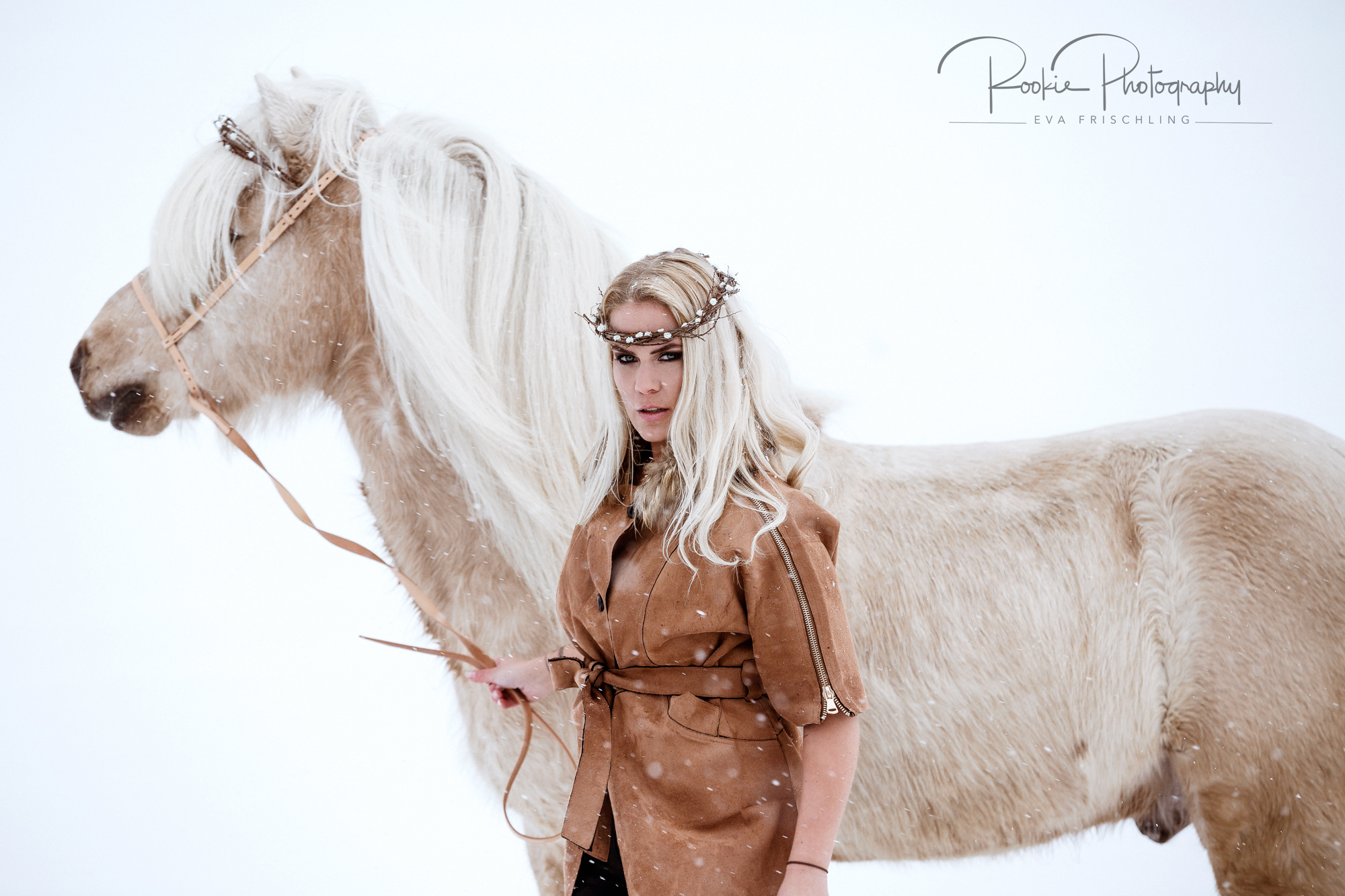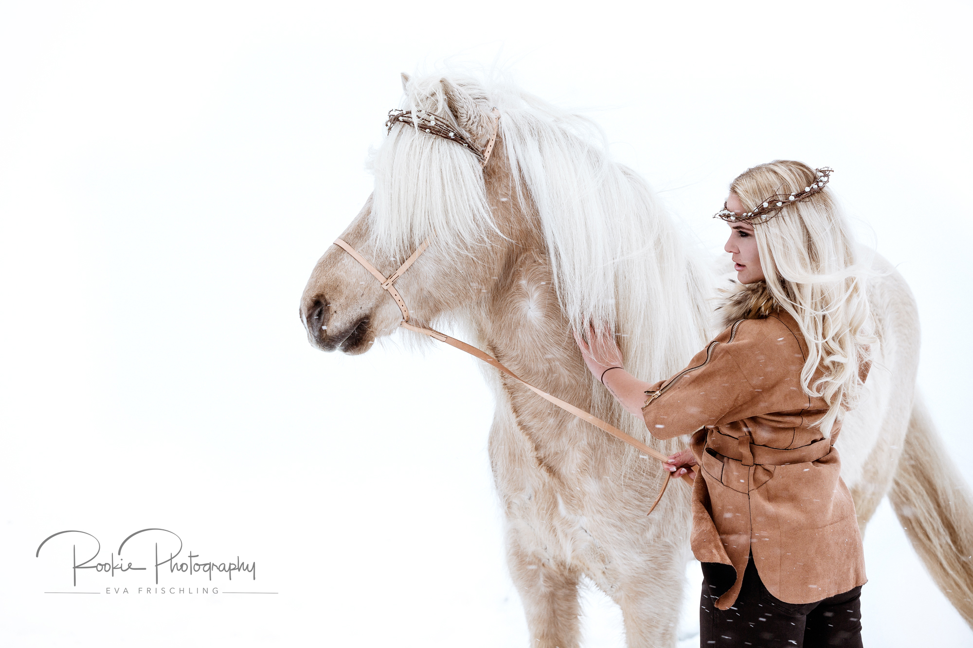 Wie oben schon geschrieben hatten wir ein Model: Sabrina, ein Pferd: Soli, eine Visa: Lydia, und Blumenschmuck von Michaela. Wir suchten gemeinsam eine Location aus. Ich hatte in etwa im Kopf, dass wir ein ganz helles Bild machen, am Besten mit Schnee im Hintergrund, und ein etwas dunkleres. Wir suchten dann gemeinsam eine Location aus und fotografierten die zwei Schönheiten zuerst im Schnee, und dann noch bei einem Waldstück. Wir hatten für dieses Bilder einfach tolles Wetter, denn es schneite leicht. So bekamen wir eine tolle Atmosphäre in den Bildern:
